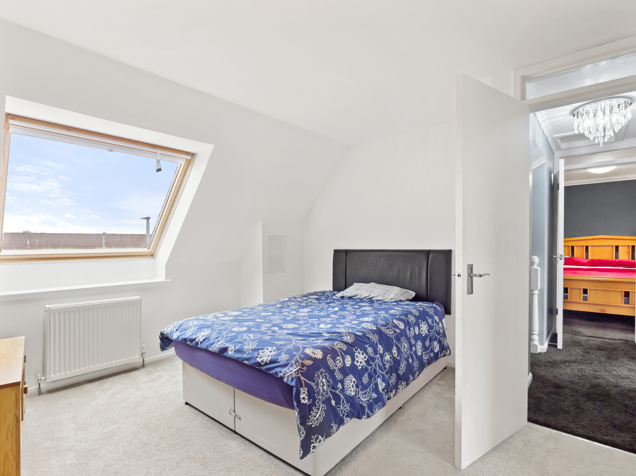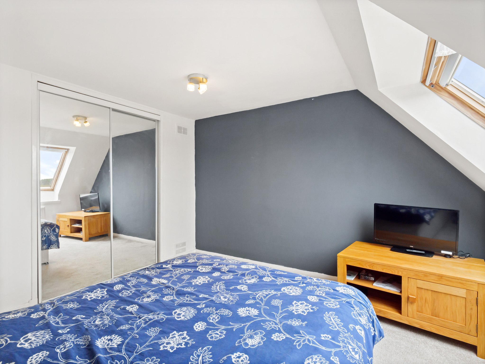 A well-proportioned first-floor bedroom featuring carpet flooring and a built-in double wardrobe, providing practical storage. The room is bright and airy, thanks to a Velux window, and includes power outlets and a ceiling light fixture, making it a comfortable and versatile space.