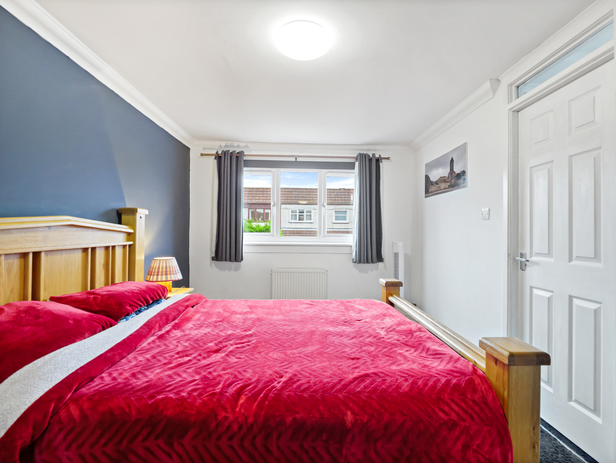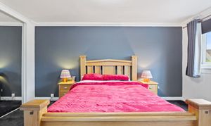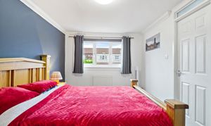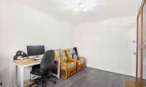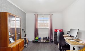 A spacious double bedroom located on the ground floor, offering a pleasant outlook over the front garden. The room is finished with attractive laminate flooring and features a radiator for warmth, ample power outlets for convenience, and a ceiling light fixture providing a bright and comfortable setting. This versatile space is ideal as a main bedroom, guest room, or home office.