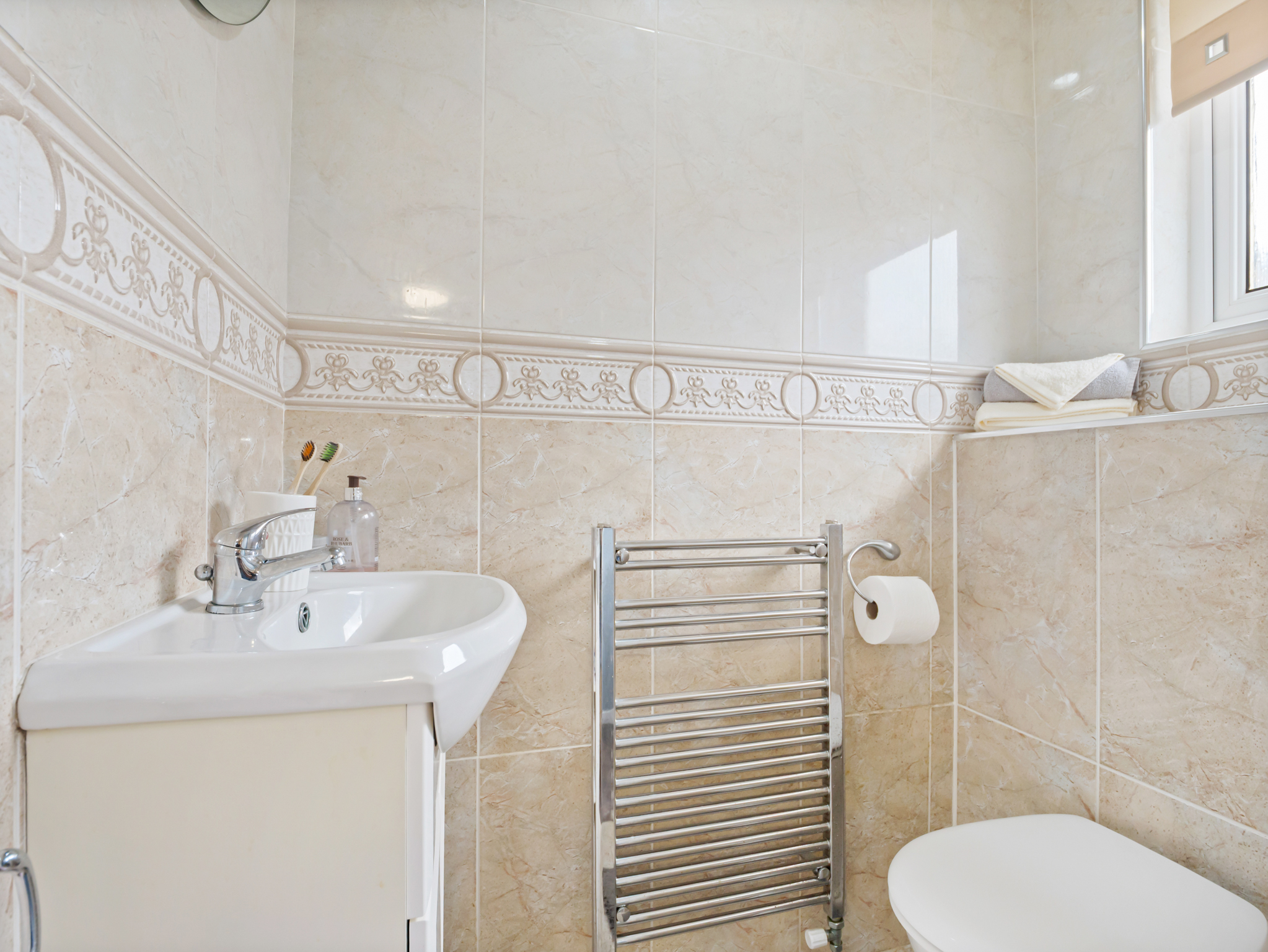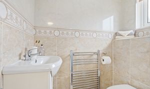 A convenient two-piece downstairs WC, fully tiled in neutral tones for a clean and modern finish. The space includes a wash basin and toilet, offering both practicality and style, with easy access from the kitchen diner and main living areas.
