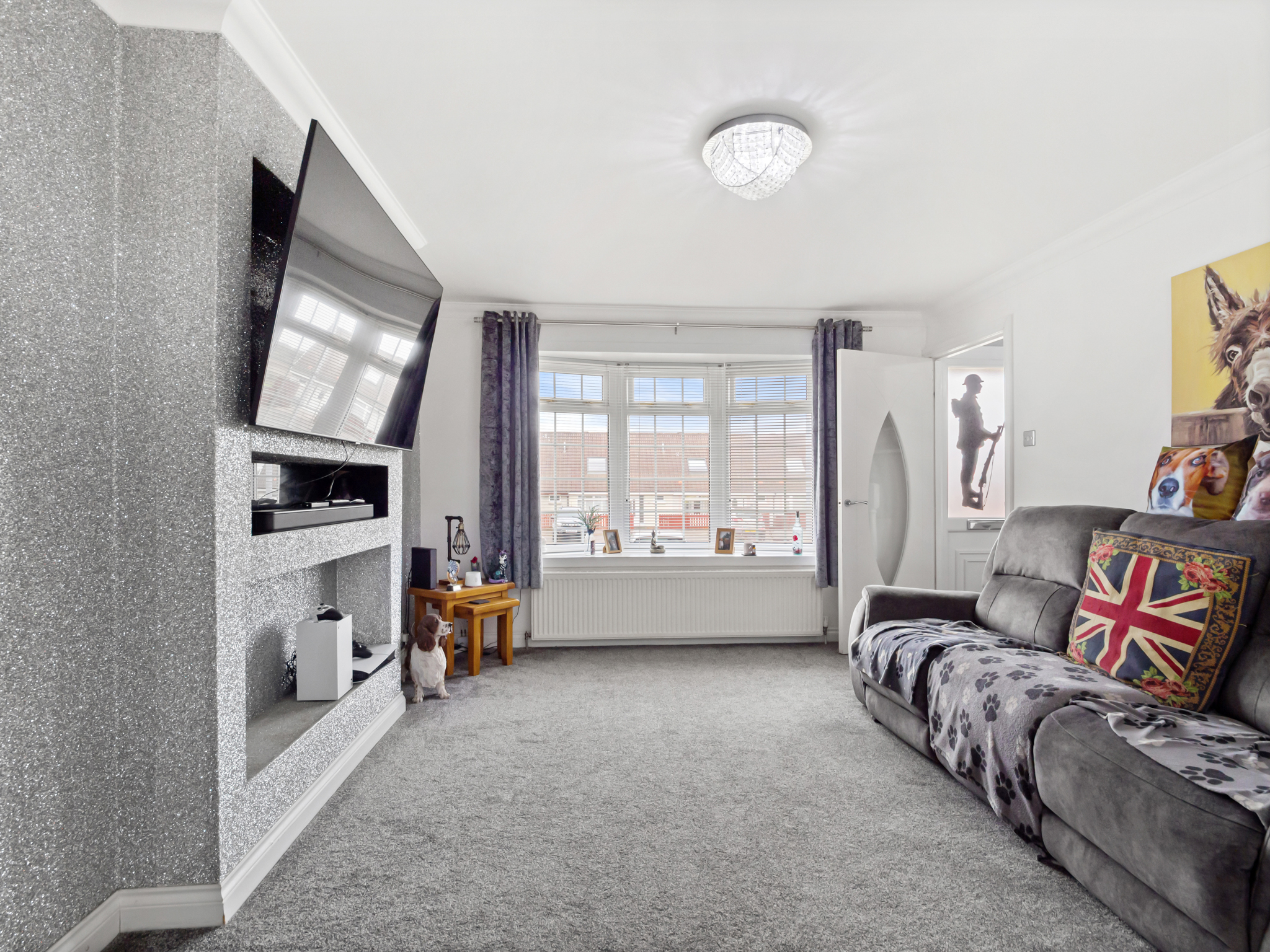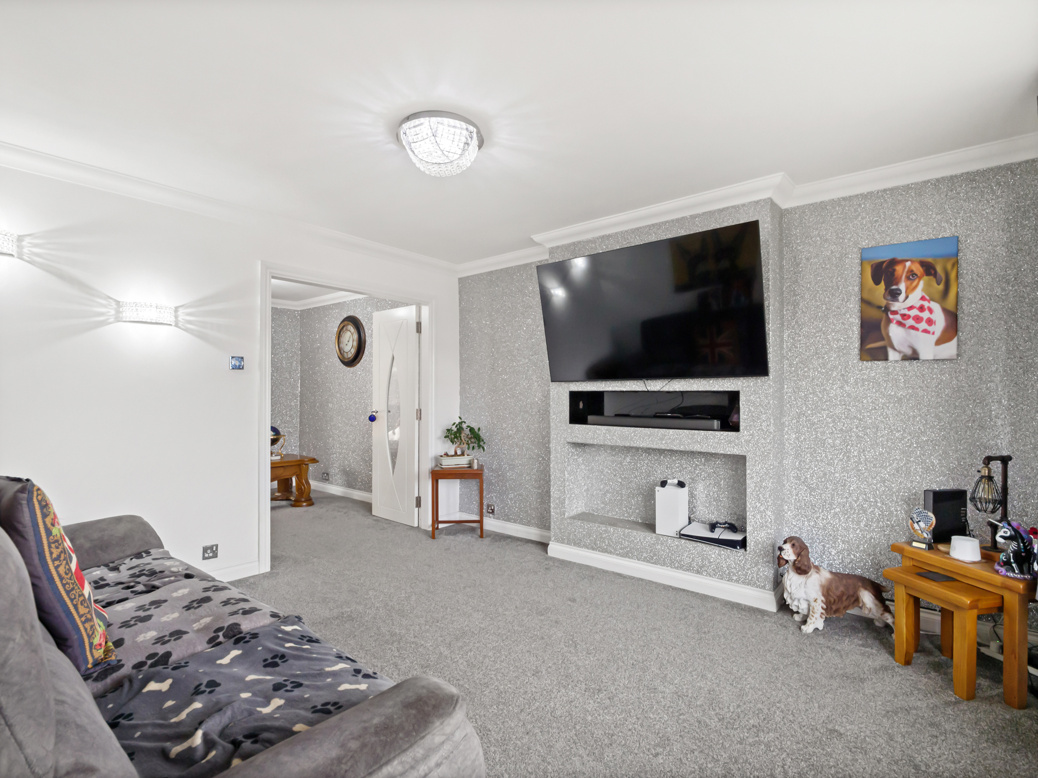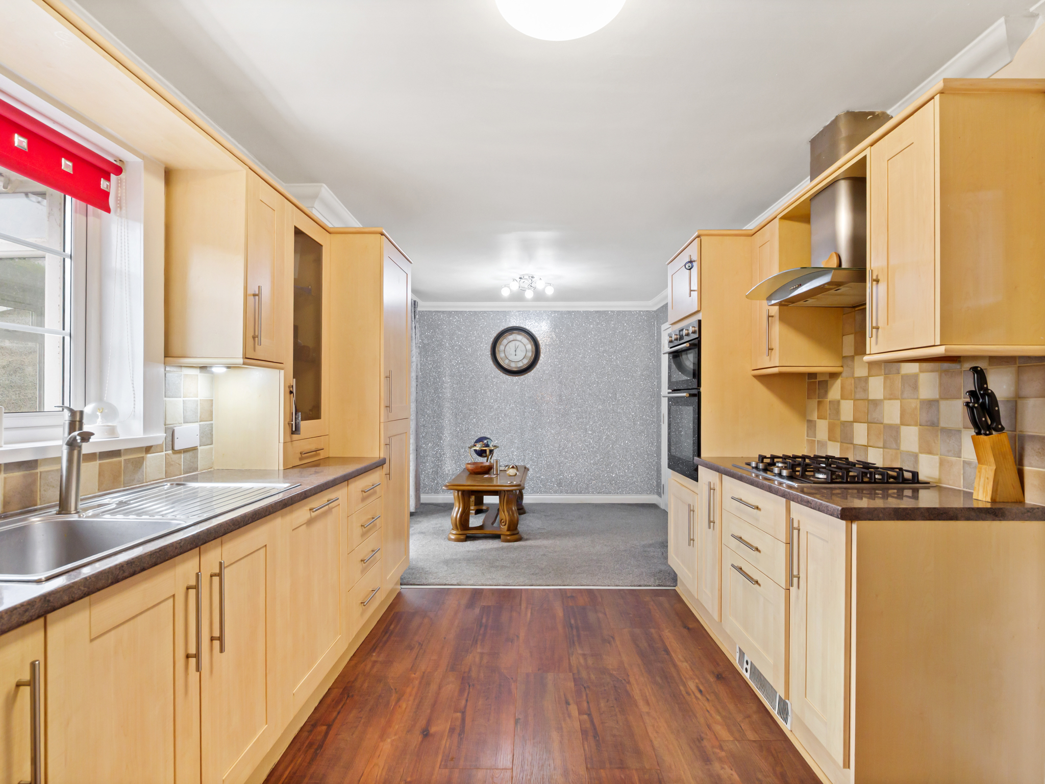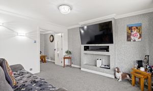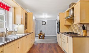 Situated to the rear of the property and overlooking the rear garden, this spacious open-plan kitchen diner offers a perfect blend of functionality and comfort. The kitchen area features stylish laminate flooring and is fitted with an integrated double oven and gas hob, along with a fridge freezer and ample power outlets for all appliances. The adjoining dining area, finished with soft carpet flooring, provides a welcoming space for family meals or entertaining guests. Both areas benefit from ceiling light fixtures ensuring a bright, airy feel throughout. From here, there is convenient access to the downstairs WC, utility room, conservatory, and rear garden, enhancing the flow and practicality of the home.