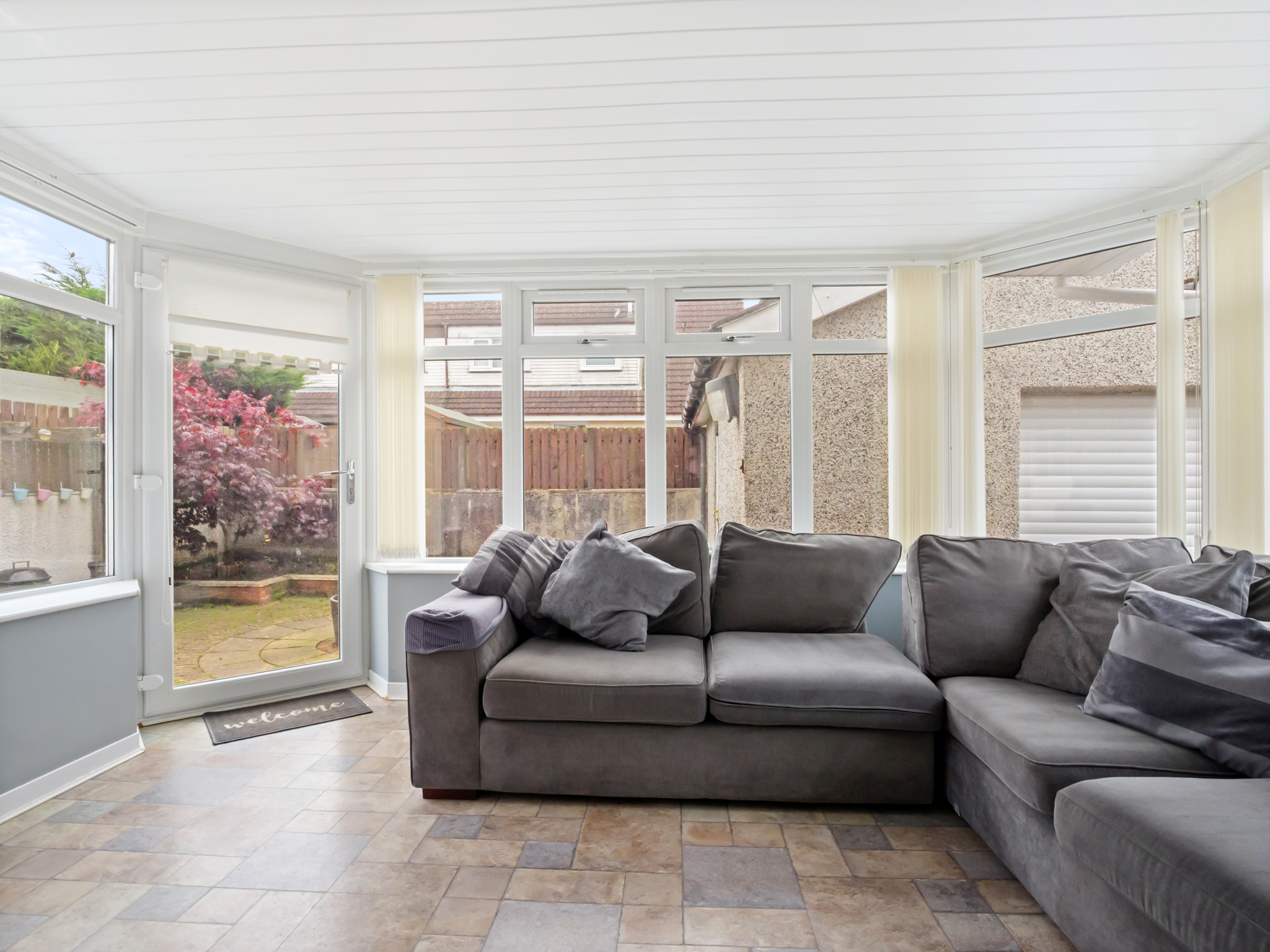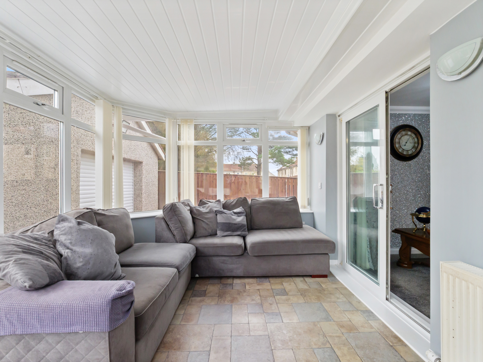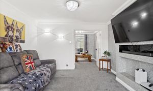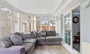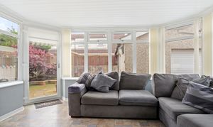 A bright and inviting conservatory overlooking the rear garden, perfect for relaxing or entertaining. The space features stylish laminate flooring, a radiator for year-round comfort, light fixtures, power outlets, and a recently replaced roof that enhances both light and insulation, creating a welcoming and practical addition to the home.