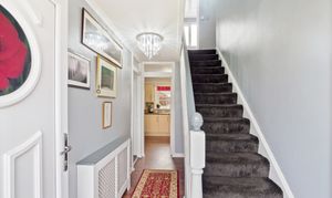 A bright and welcoming entrance hallway featuring stylish laminate flooring that complements the home’s modern feel. The space benefits from a radiator providing a warm and comfortable atmosphere, along with convenient electric outlets and a ceiling light fixture ensuring the area is well lit. Carpeted stairs lead to the first floor, adding a soft touch and a smooth flow through the home.