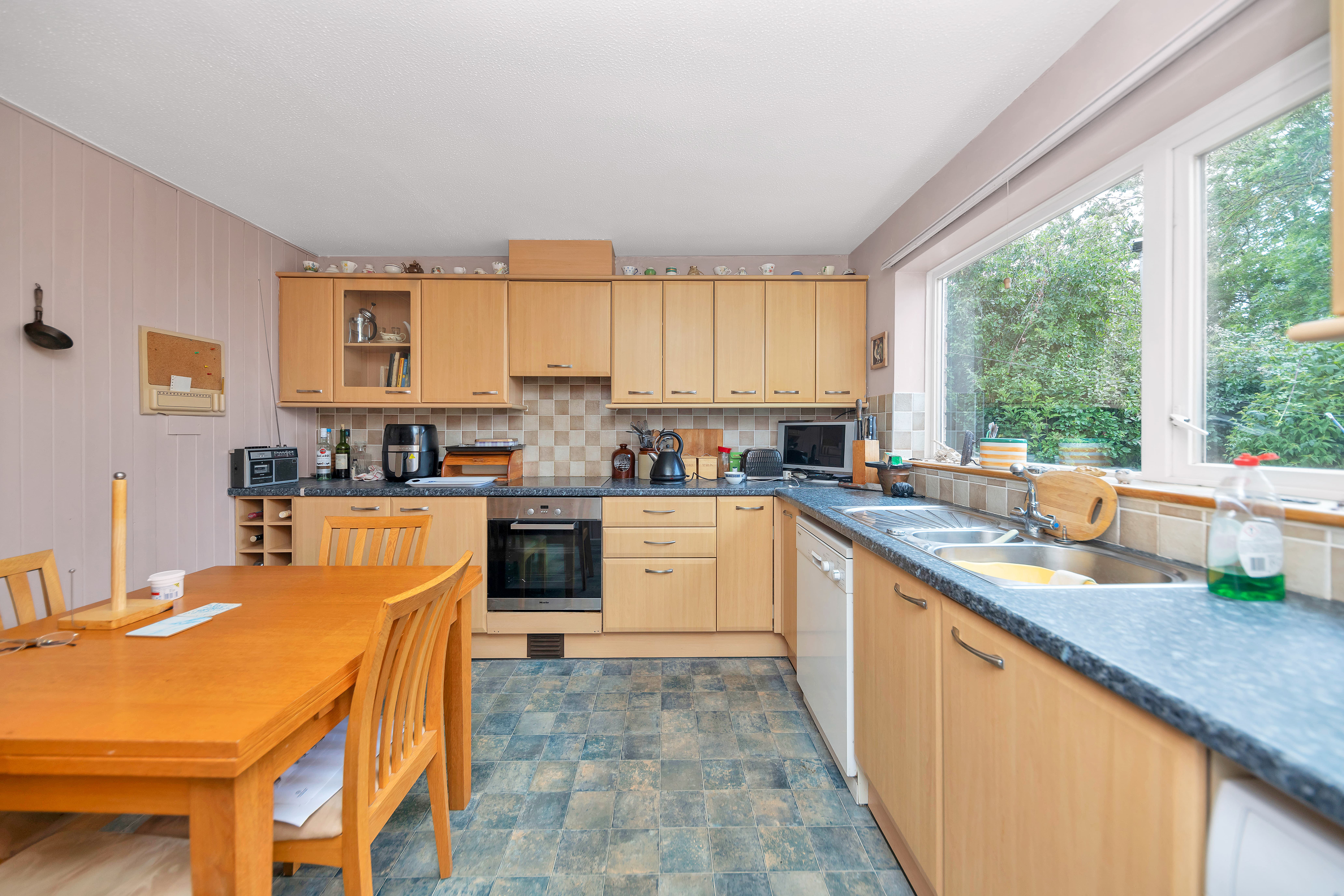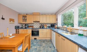 The kitchen/dining room is wonderfully open-plan, enjoying a window to a garden aspect, a range of base and wall units, laminate worktops, tiled flooring and splashbacks, an integrated oven, hob, fridge/freezer and extractor fan, and space for a dishwasher, dining setting, washing machine and other small kitchen appliances.