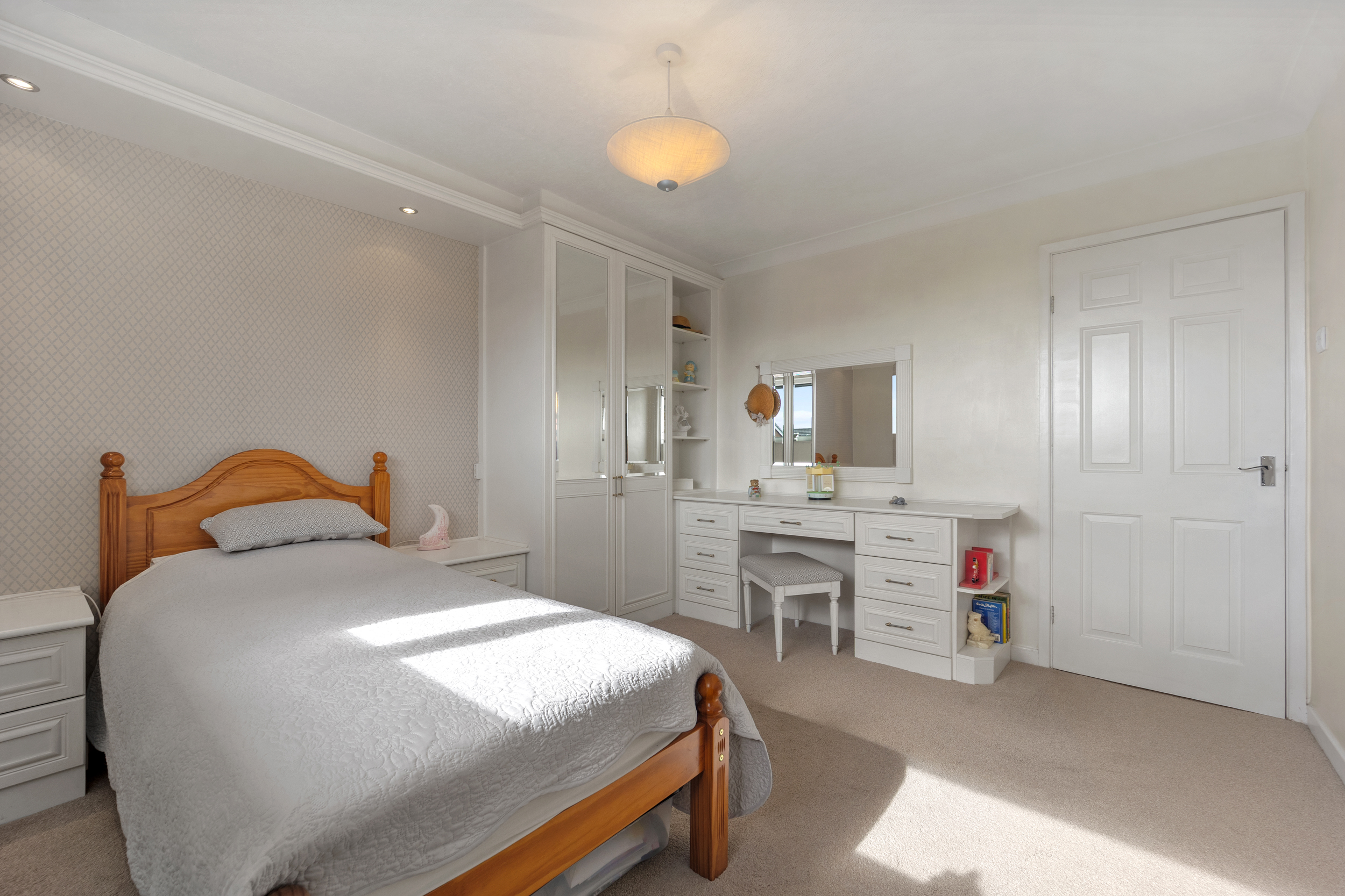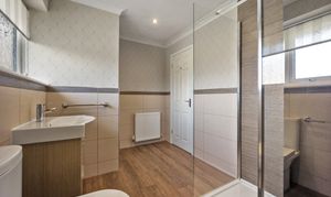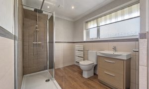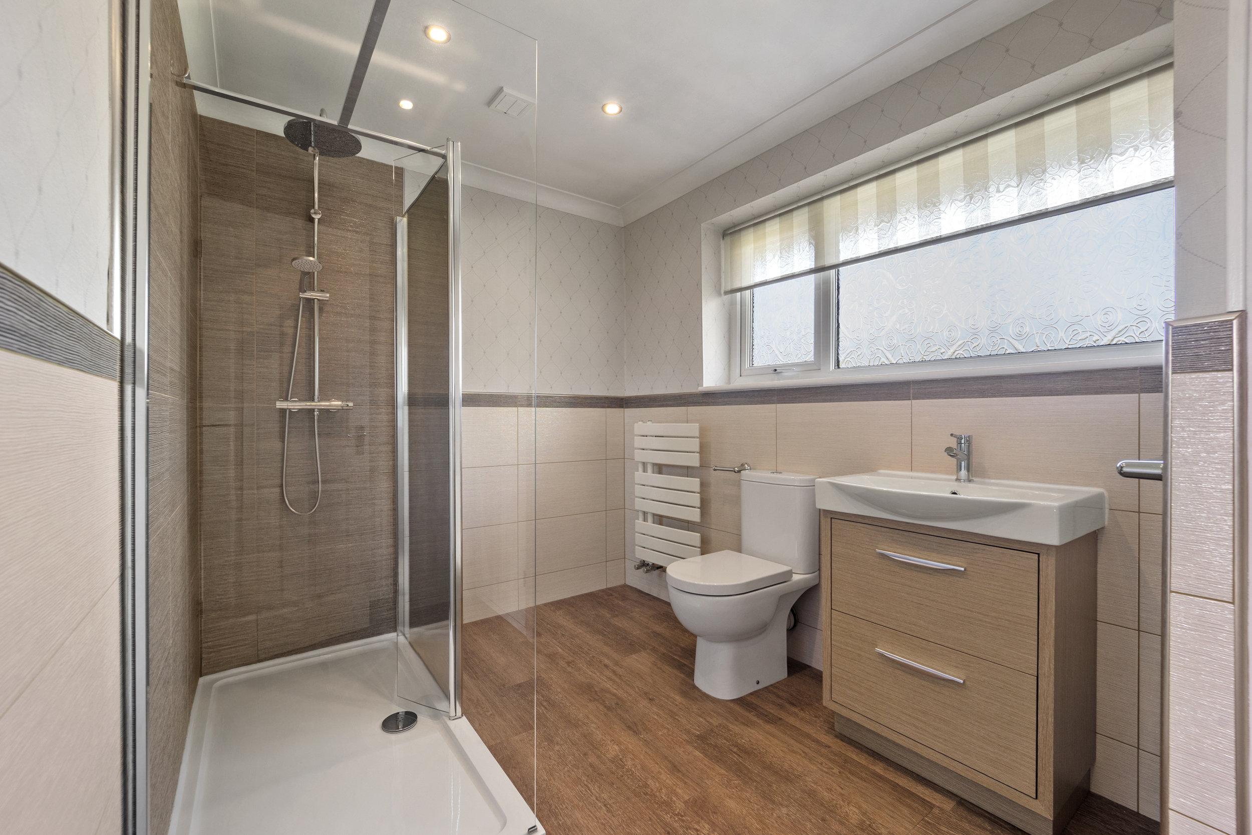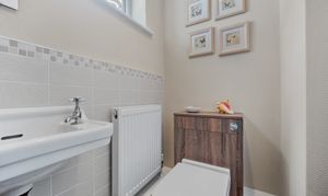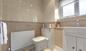 Serving these rooms is the family bathroom, a bright and well-finished space designed with both practicality and comfort in mind. Fully tiled in soft, neutral tones and complemented by traditional-style panelling, it balances classic and contemporary styling. Fitted with a Vitra suite and Mira electric shower, it offers a reliable and functional setup for busy households.