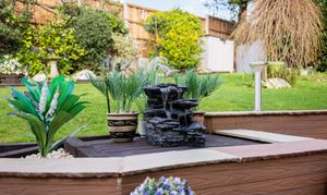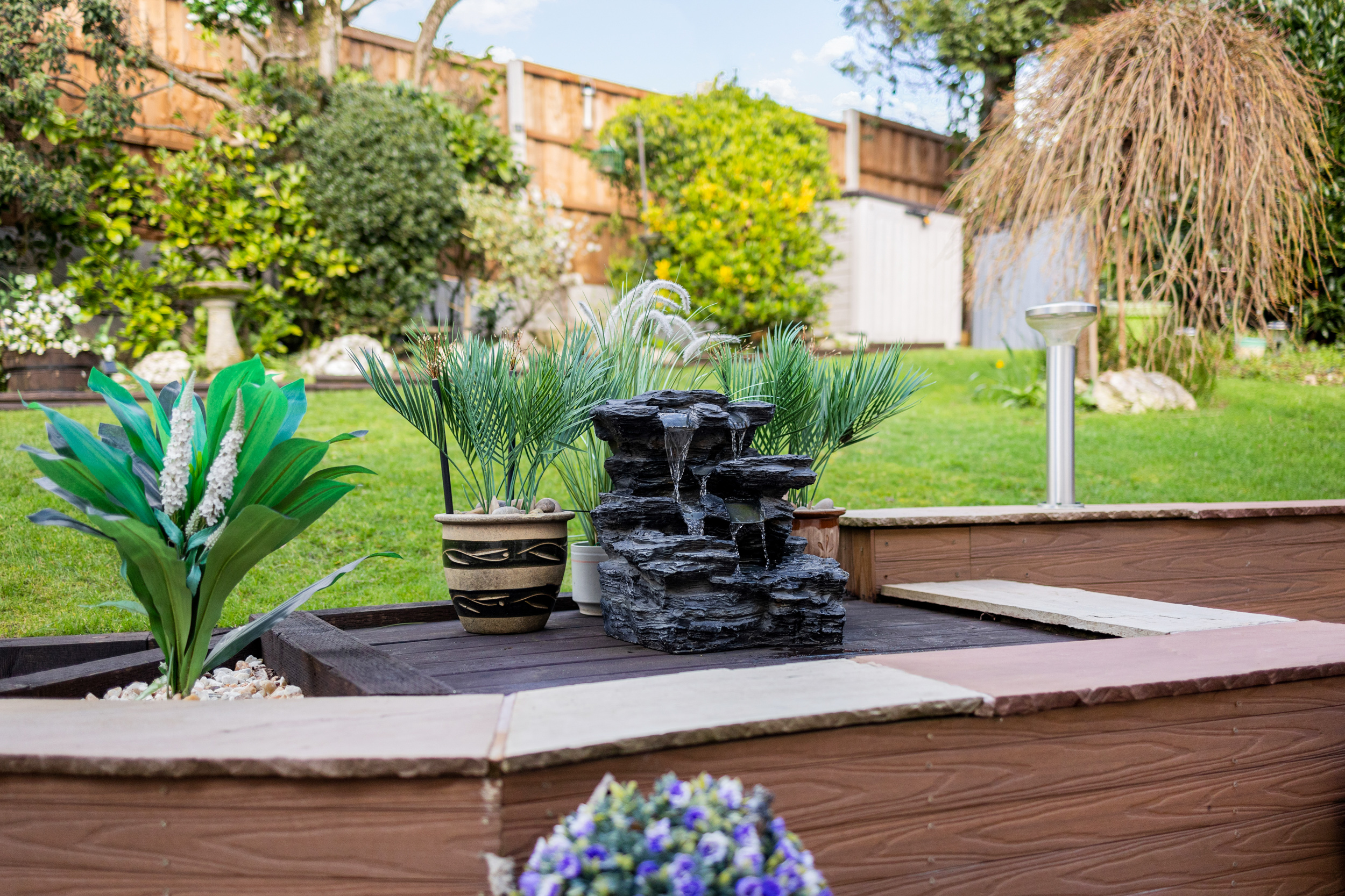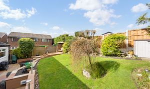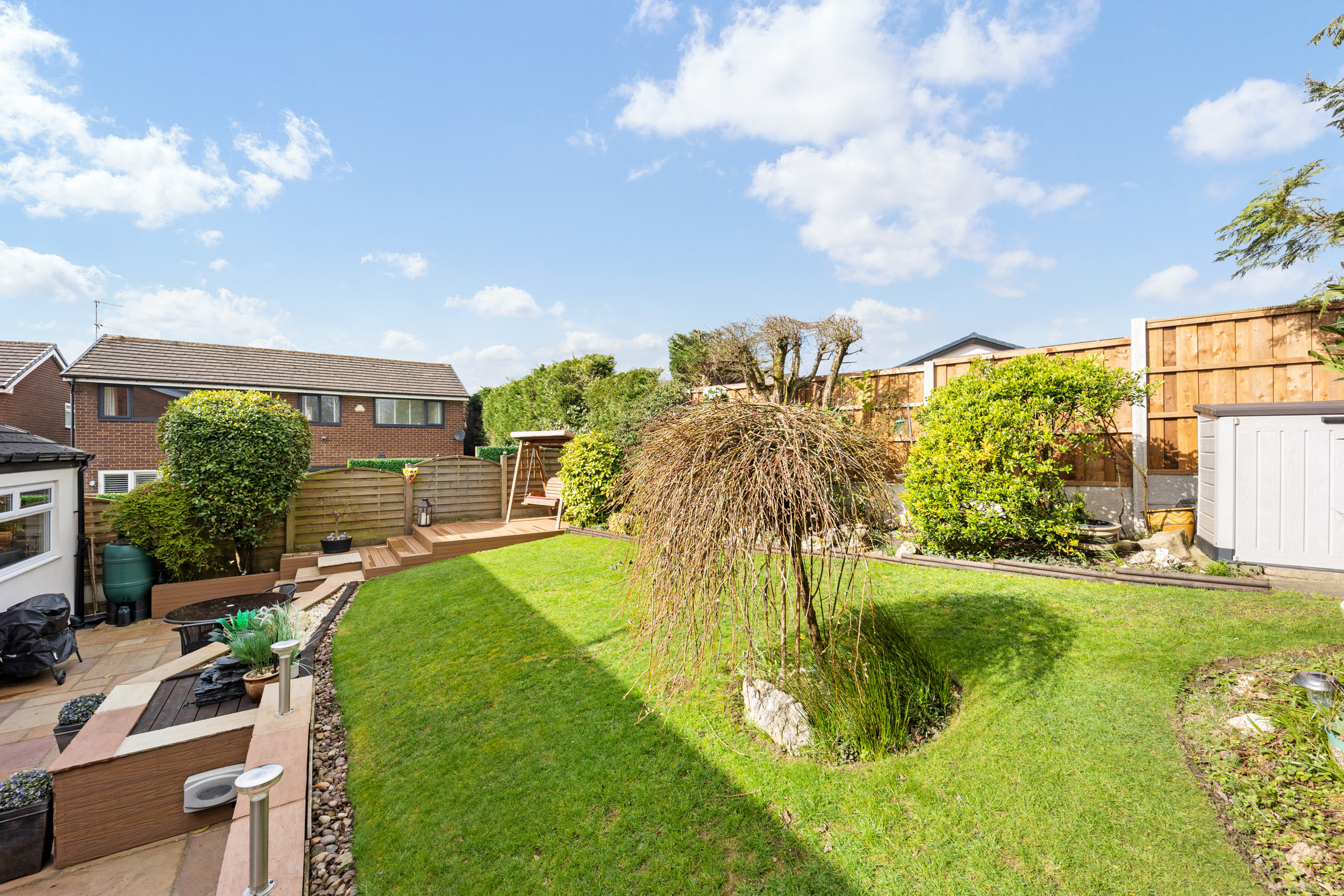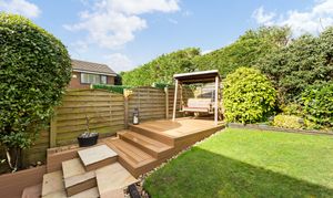 From here, steps lead up to a well-kept lawn framed by mature planting and established borders, creating a sense of privacy and greenery throughout the seasons. A raised composite decked area offers a more tucked-away seating space, ideal for morning coffee or unwinding with a book, while features such as the ornamental water feature and carefully considered landscaping add character and a sense of calm.