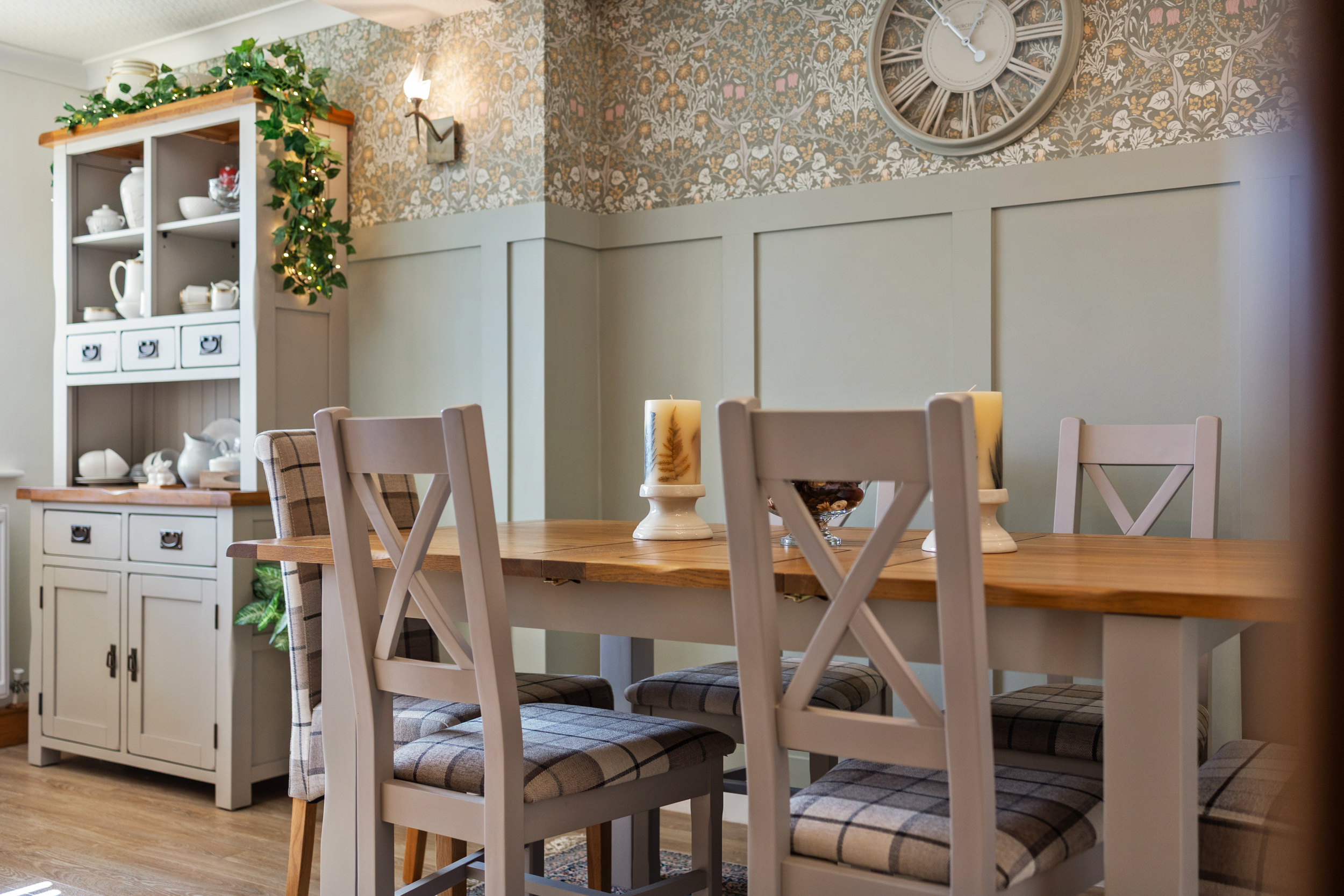 The dining room is a real highlight, rich in character and atmosphere with shaker-style wall panelling and William Morris wallpaper. Framed beautifully by a bespoke oak archway, it feels both connected and distinct, creating a natural transition into a space designed for gathering, whether for dinner parties or more informal family meals.