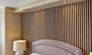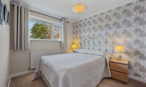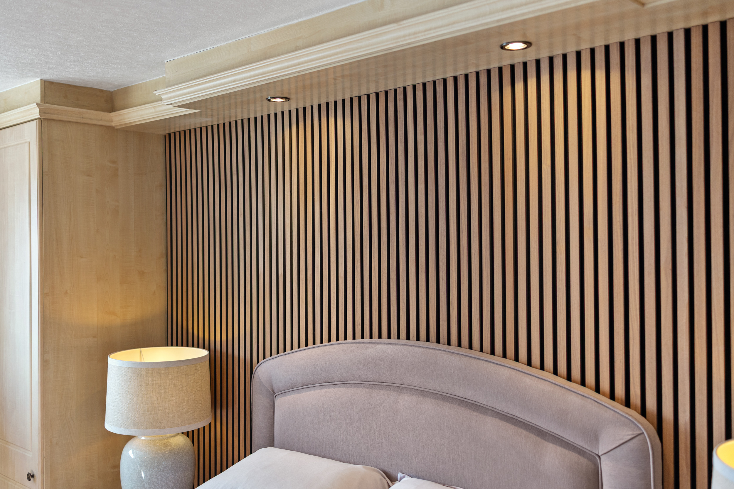 The principal bedroom is a particularly inviting retreat, designed with both comfort and style in mind. Fitted furniture frames the space, while a feature slatted wall behind the bed adds warmth and texture, creating a boutique feel. Generous proportions ensure there is still plenty of room to relax and unwind, while the en suite is finished with a walk-in shower featuring an overhead drench, contemporary tiling, and a clean, understated design.