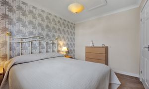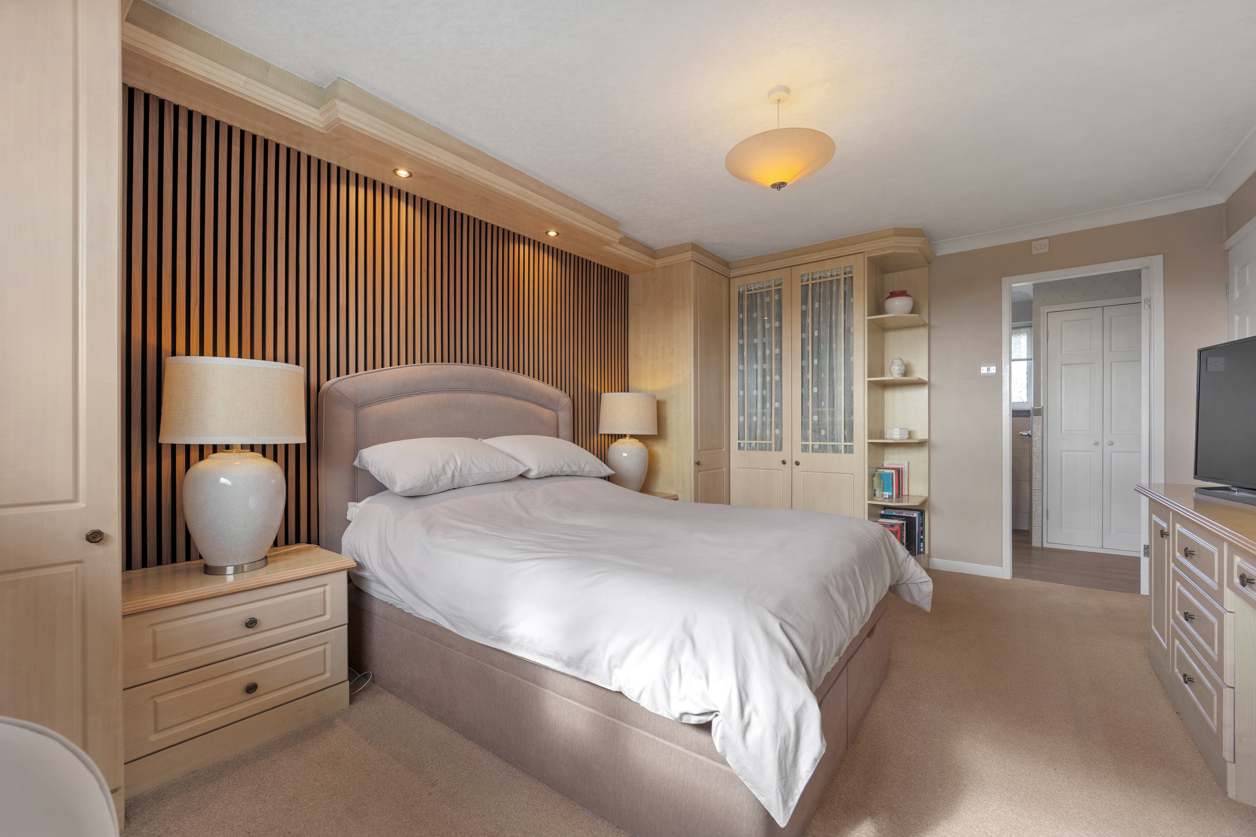 - Principal bedroom with fitted furniture, feature wall, and modern en suite