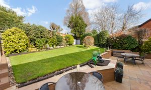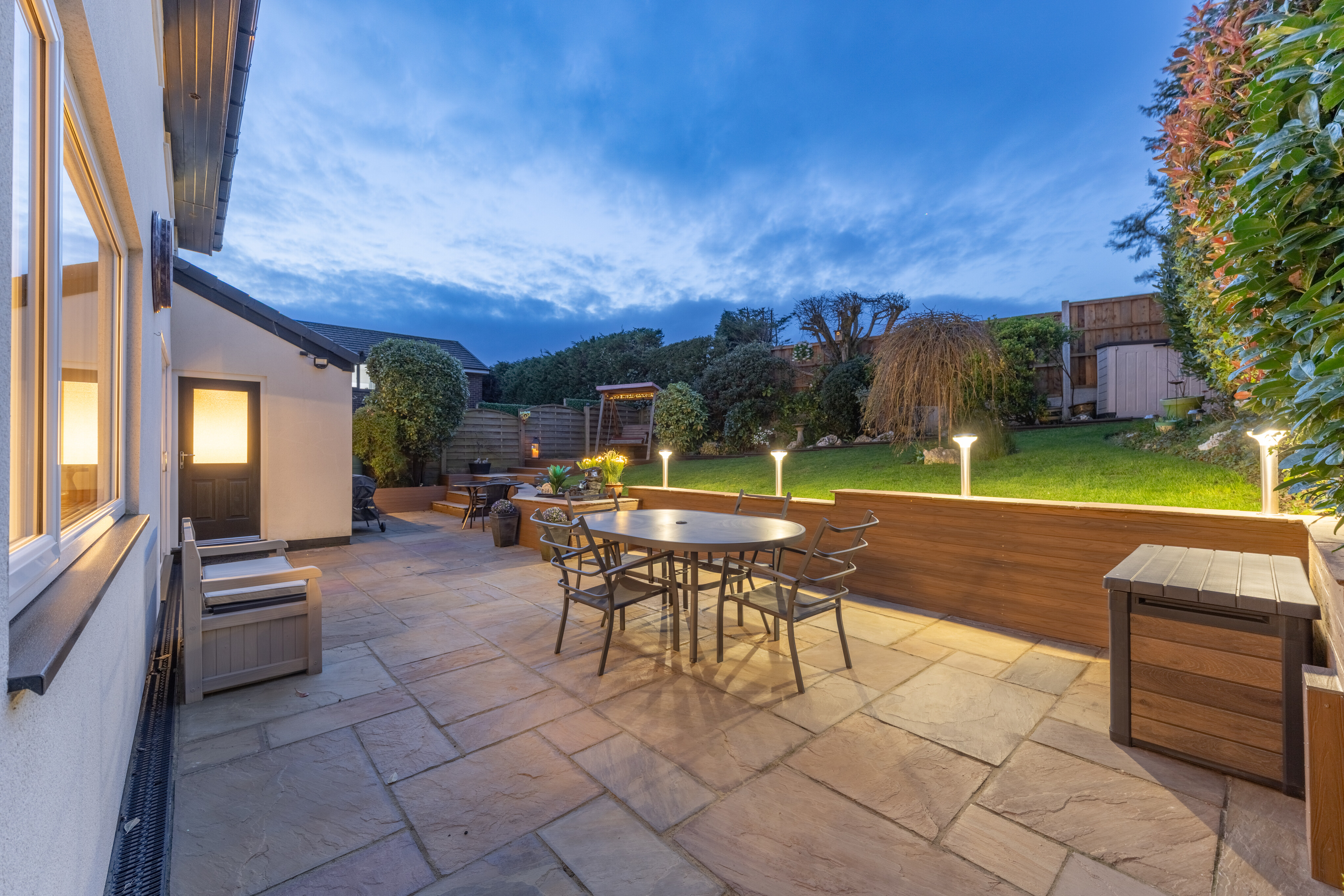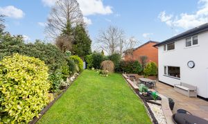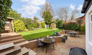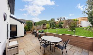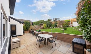 Stepping out from the house, the rear garden has been designed to feel like a natural extension of the living space, offering a private and well-balanced setting for both relaxing and entertaining. A generous stone patio provides the perfect spot for outdoor dining, from summer barbecues to quieter evenings in the sun.