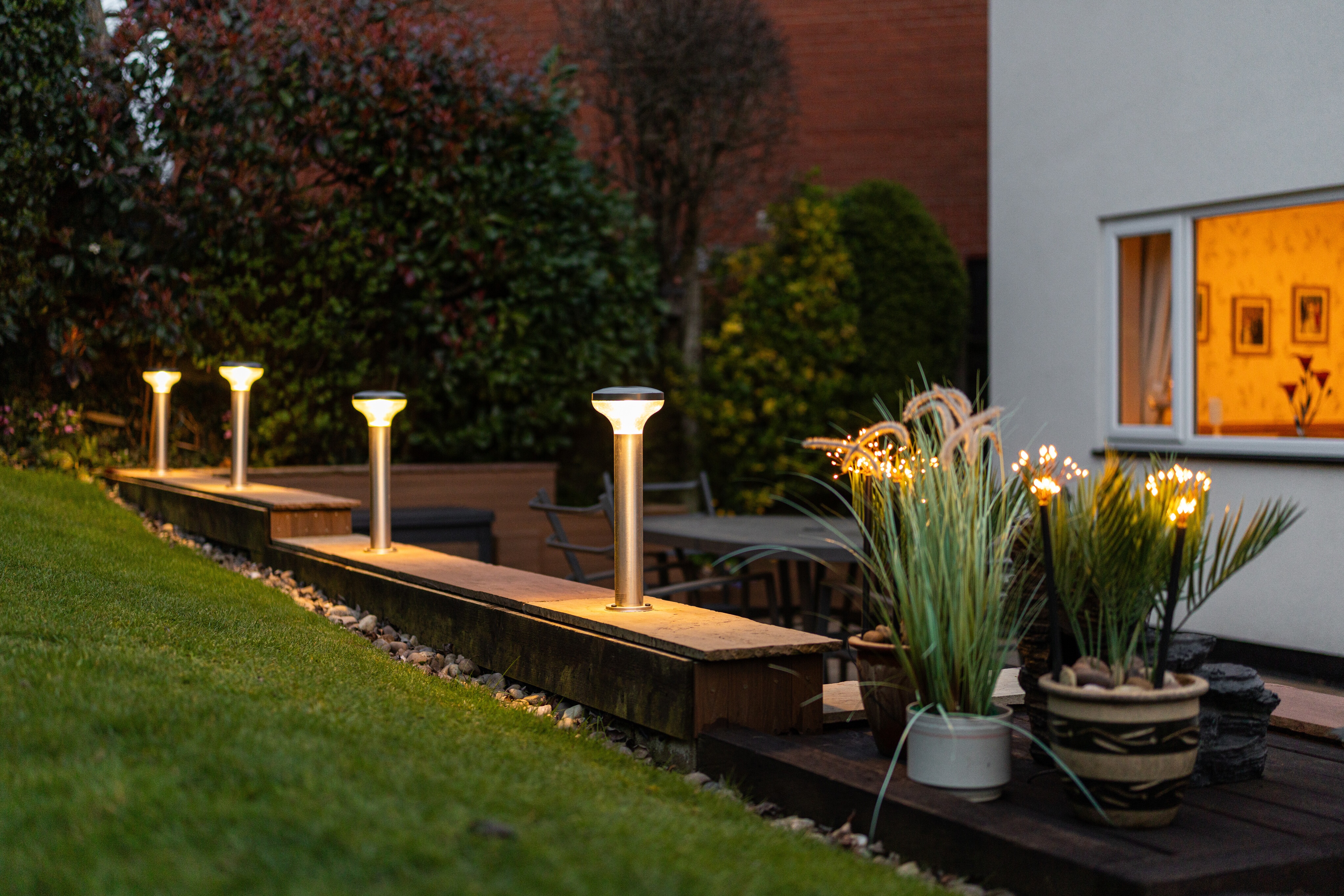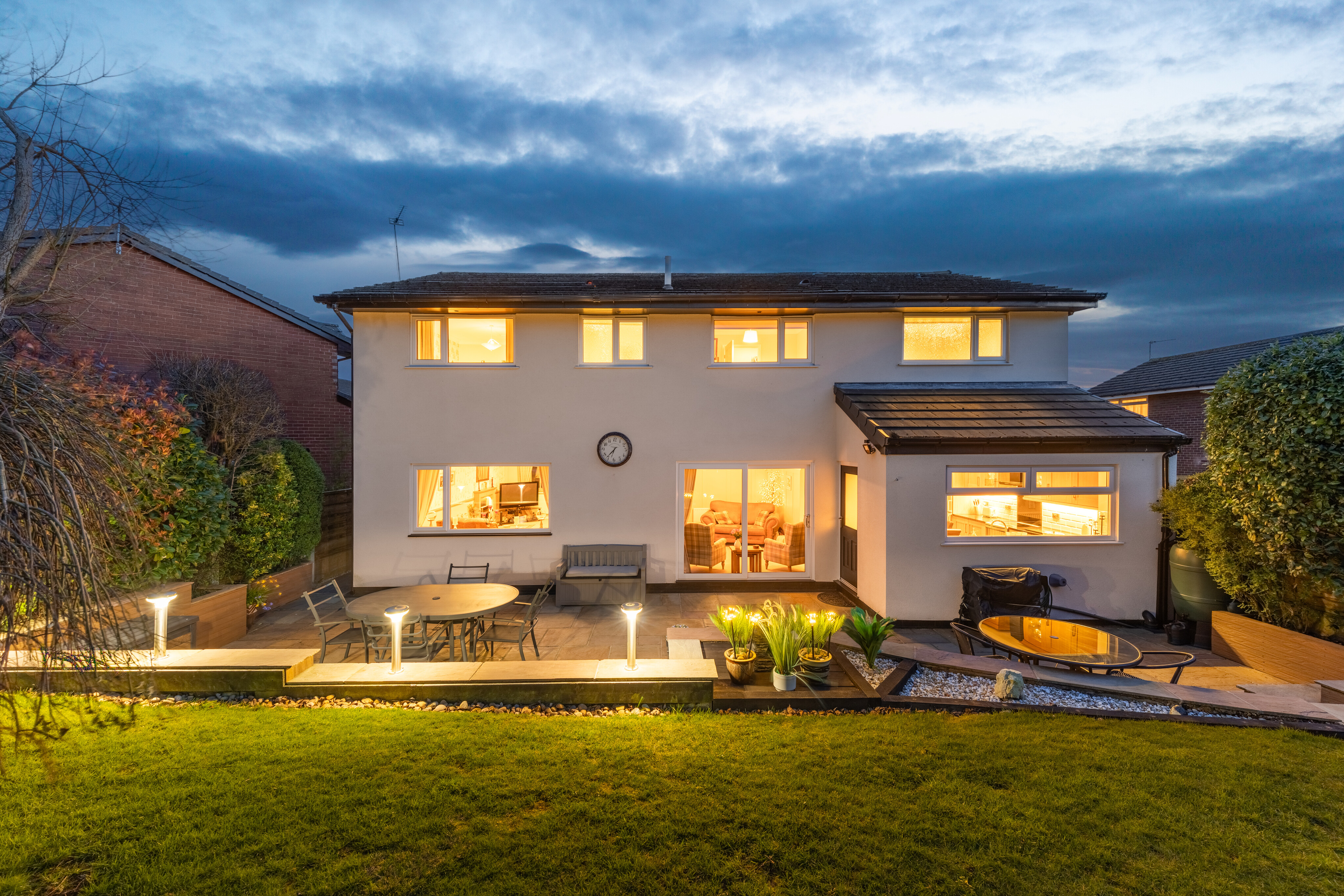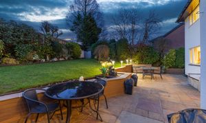 - Landscaped rear garden with patio, lawn, and raised decking for outdoor living