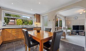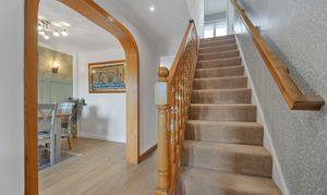Stepping inside via a small entrance porch, you’re welcomed into the main hallway where the sense of space and quality is immediately apparent. Amtico flooring flows underfoot, while a bespoke oak staircase rises to the first floor, setting the tone for the craftsmanship found throughout. An oak archway draws you through to the dining room, offering an inviting glimpse of the character beyond.