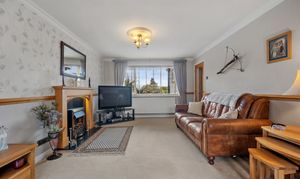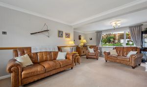 The living room is an impressive and versatile space, stretching the full depth of the property and benefiting from a dual aspect that fills the room with light from morning through to evening. Generous in size, it comfortably accommodates both formal seating and more relaxed arrangements, centred around an oak fire surround with a marble backboard and a Dimplex Optimyst fire.