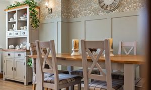 - Characterful dining room framed by a bespoke oak archway, perfect for gatherings
