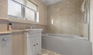 A full-sized bath with overhead shower and glass screen provides flexibility for both quick starts to the day and more relaxed evenings, while the vanity unit and fitted storage keep everything neatly organised. Patterned flooring adds a subtle touch of character, completing the room with a more considered feel.