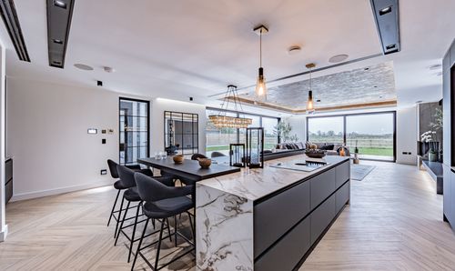Impressive master suite with balcony overlooking garden and neighbouring farmland beyond.