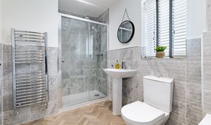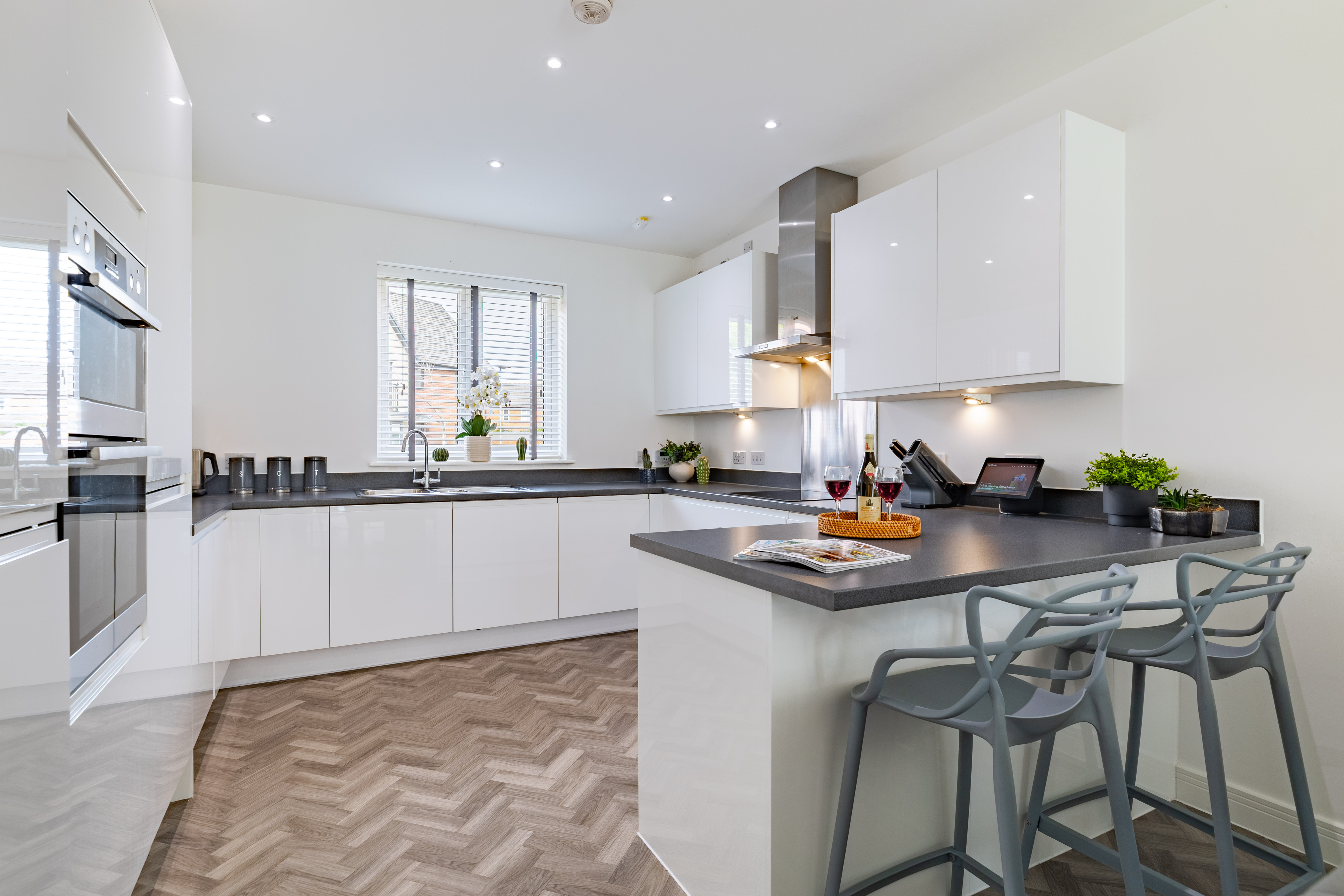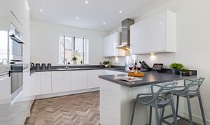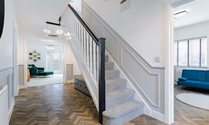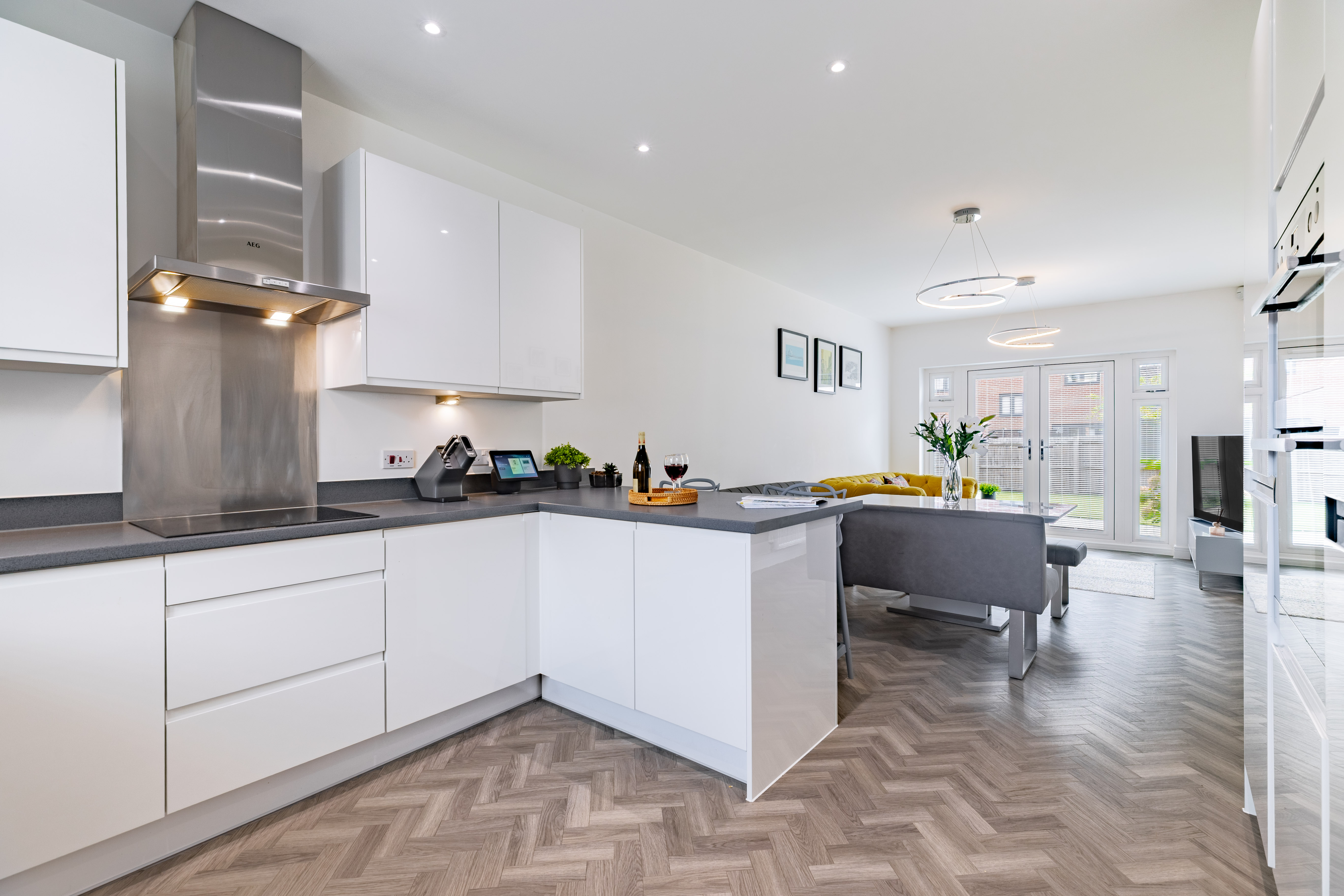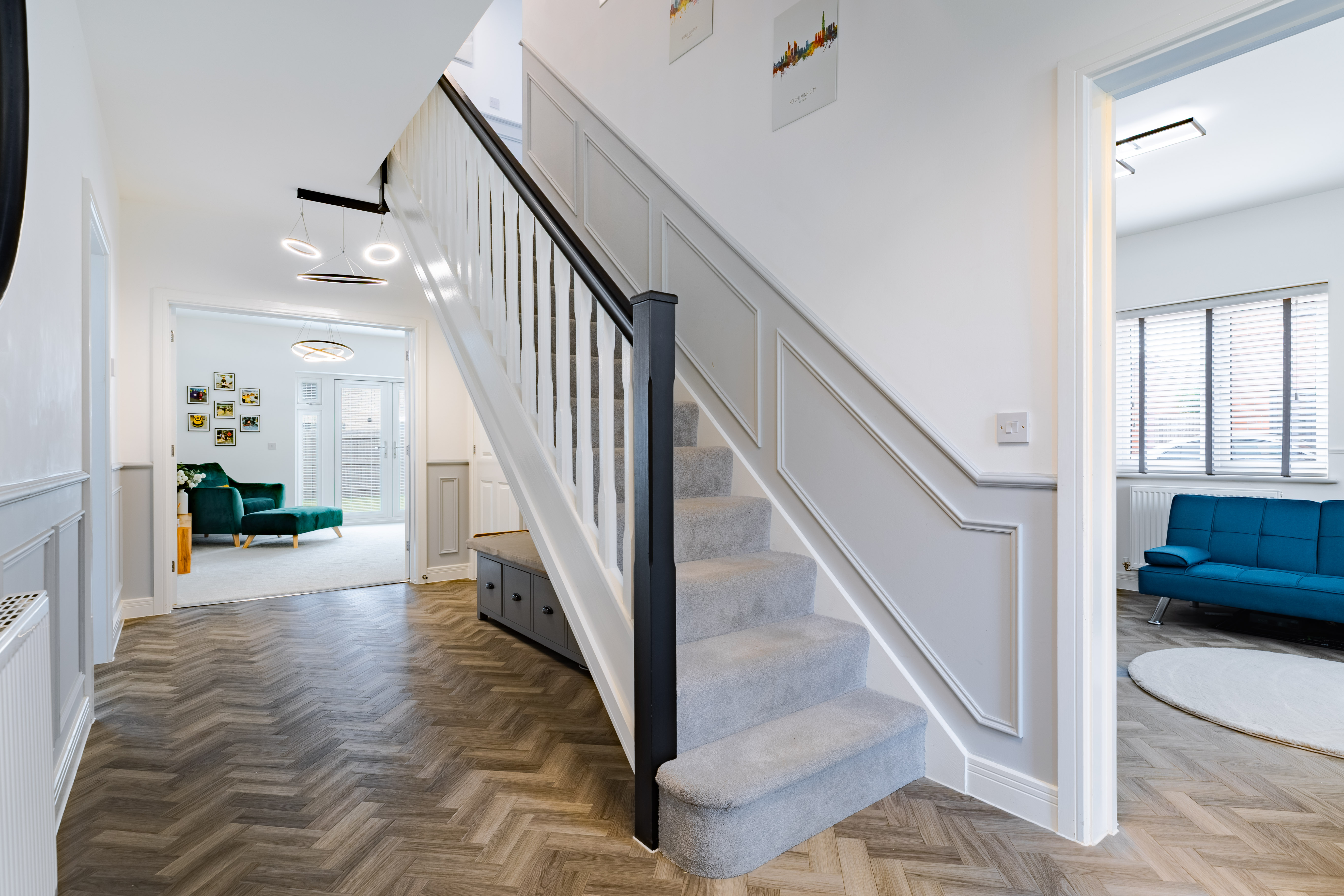 Stepping through the front door, the hall is a welcoming space to greet guests, and wide for when laden with bags and with the kids at your feet. There’s Amtico herringbone flooring from the hall into the cloakroom and kitchen, and under the stairs is an alcove for storage, which could be fitted with cupboards if preferred.