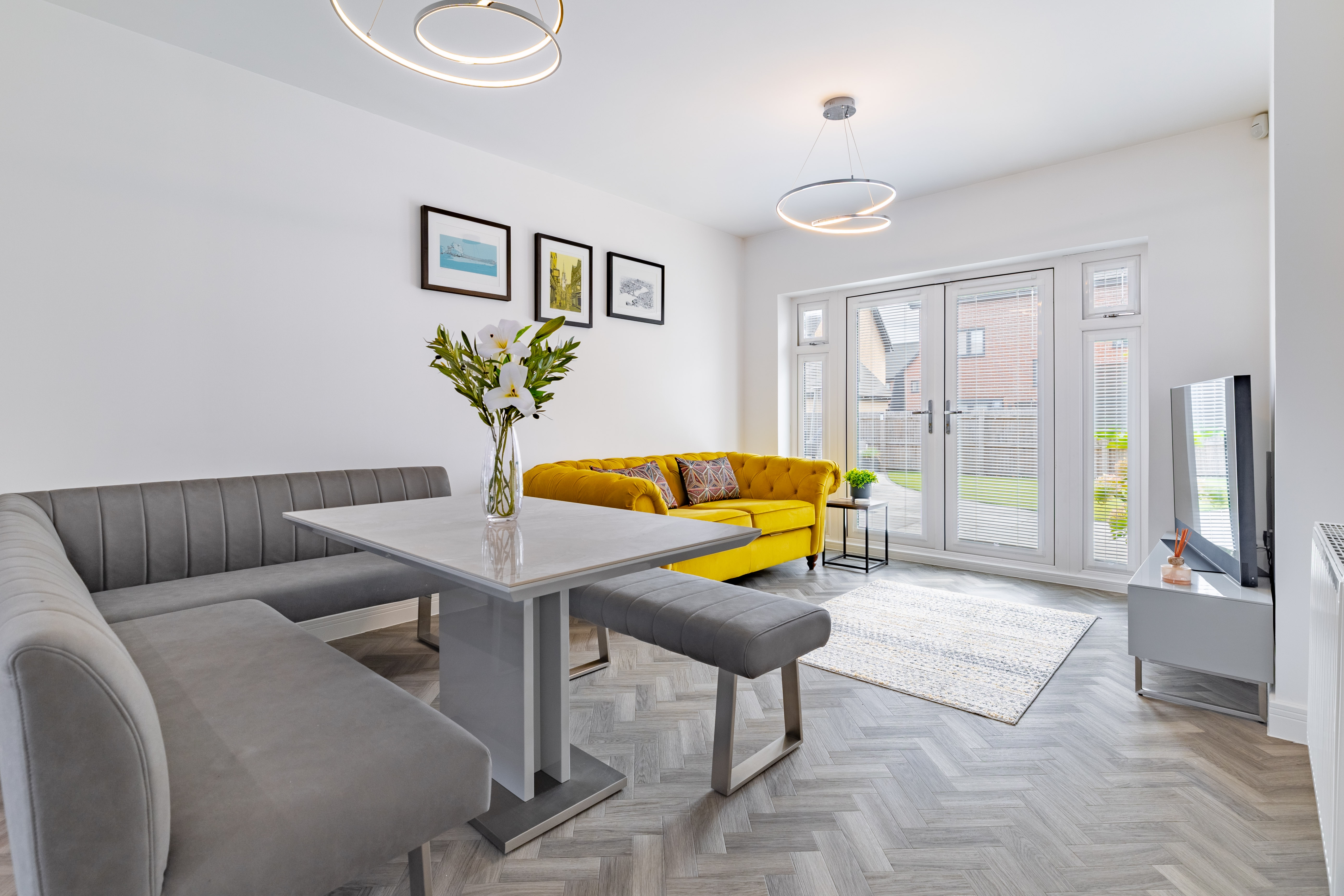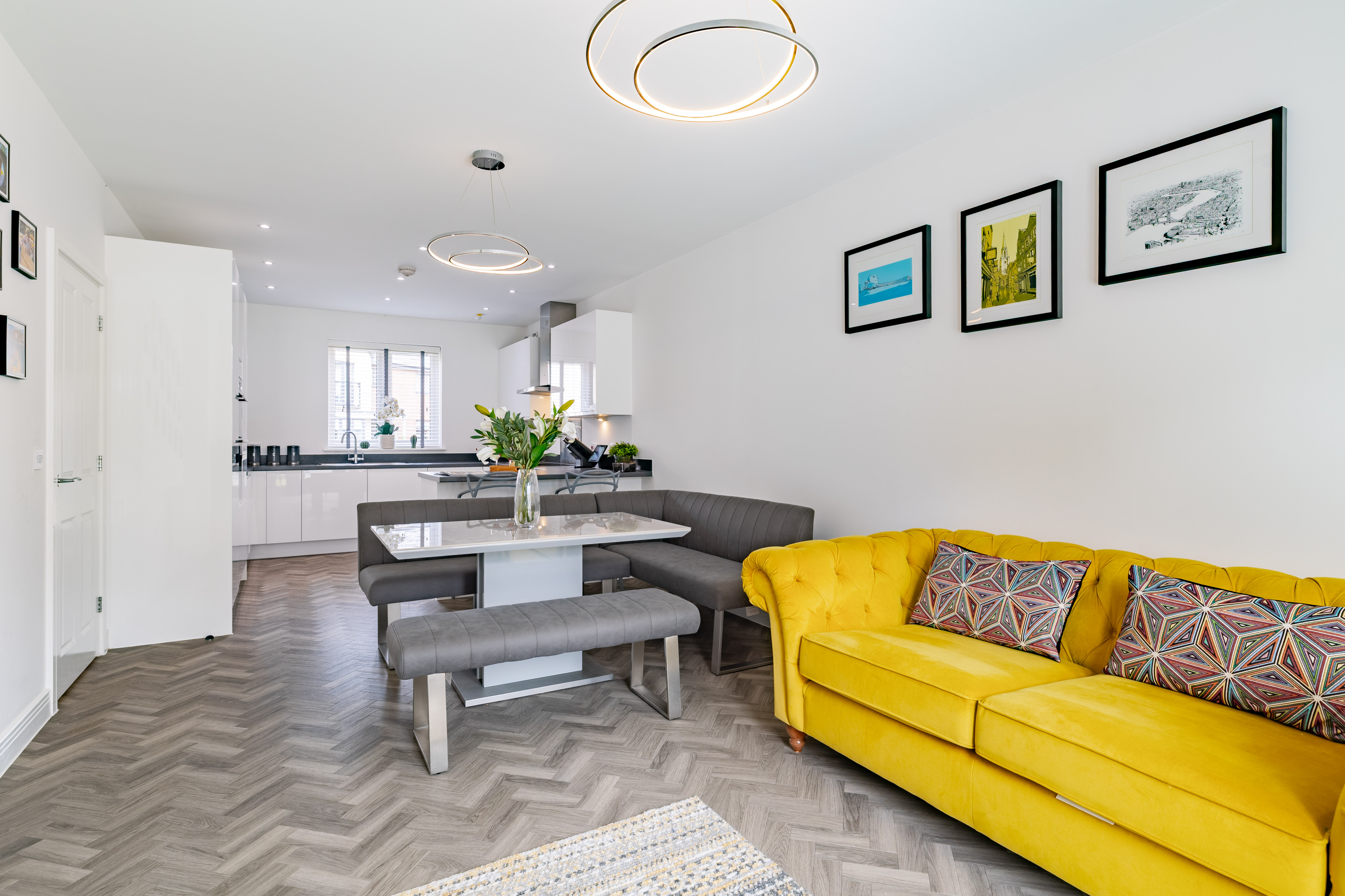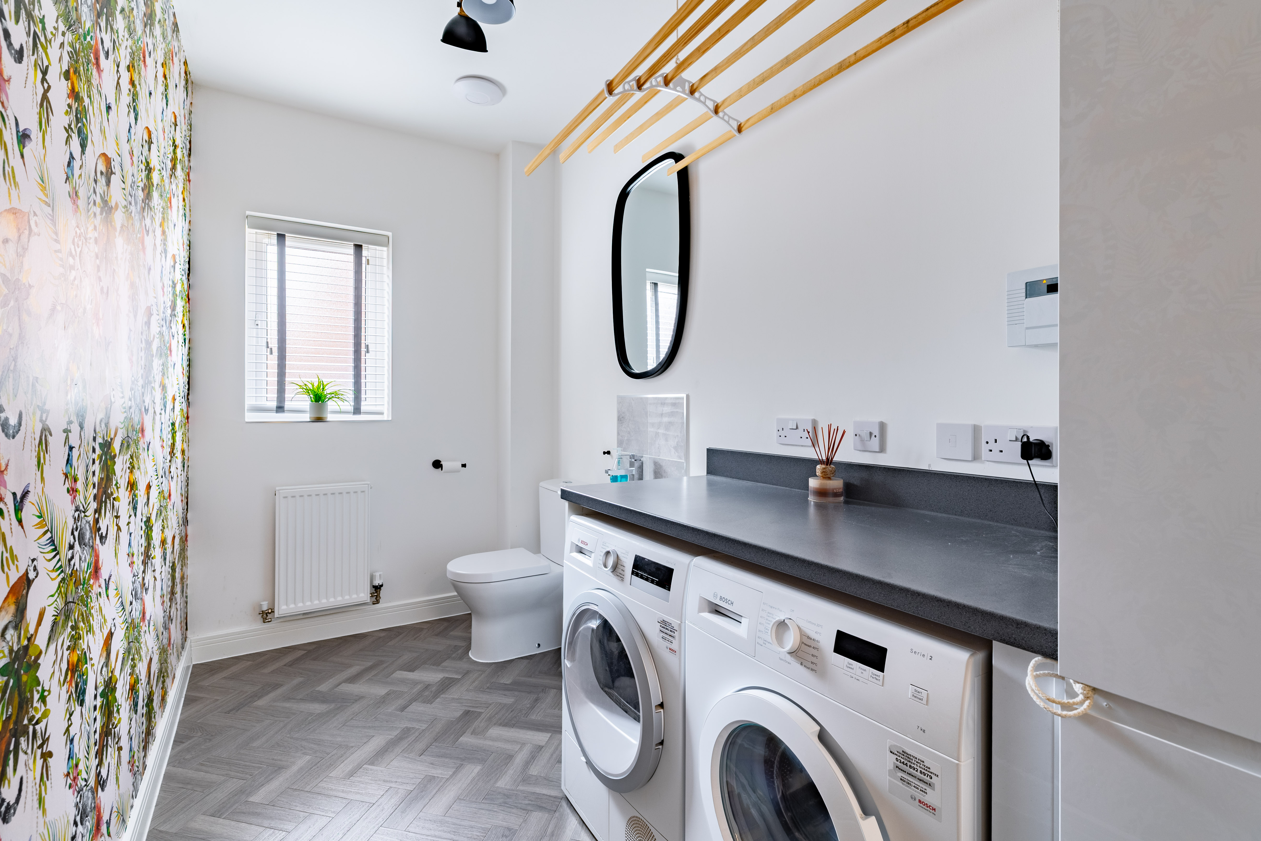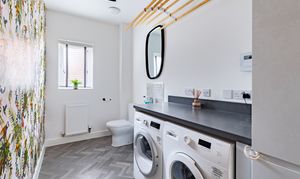 The kitchen/dining/living is to the left, affording open, sociable space for entertaining, and with French doors for fresh air, natural light, and access straight onto the patio in summer. The kitchen to the front is generous, with a wide range of sleek white cabinetry with dark surfacing. There are integrated appliances including an oven/grill, an induction hob, a fridge/freezer and a dishwasher. The utility opposite has an integrated washing machine, storage and surfacing, as well as a wc. We love the wild wallpaper in here!