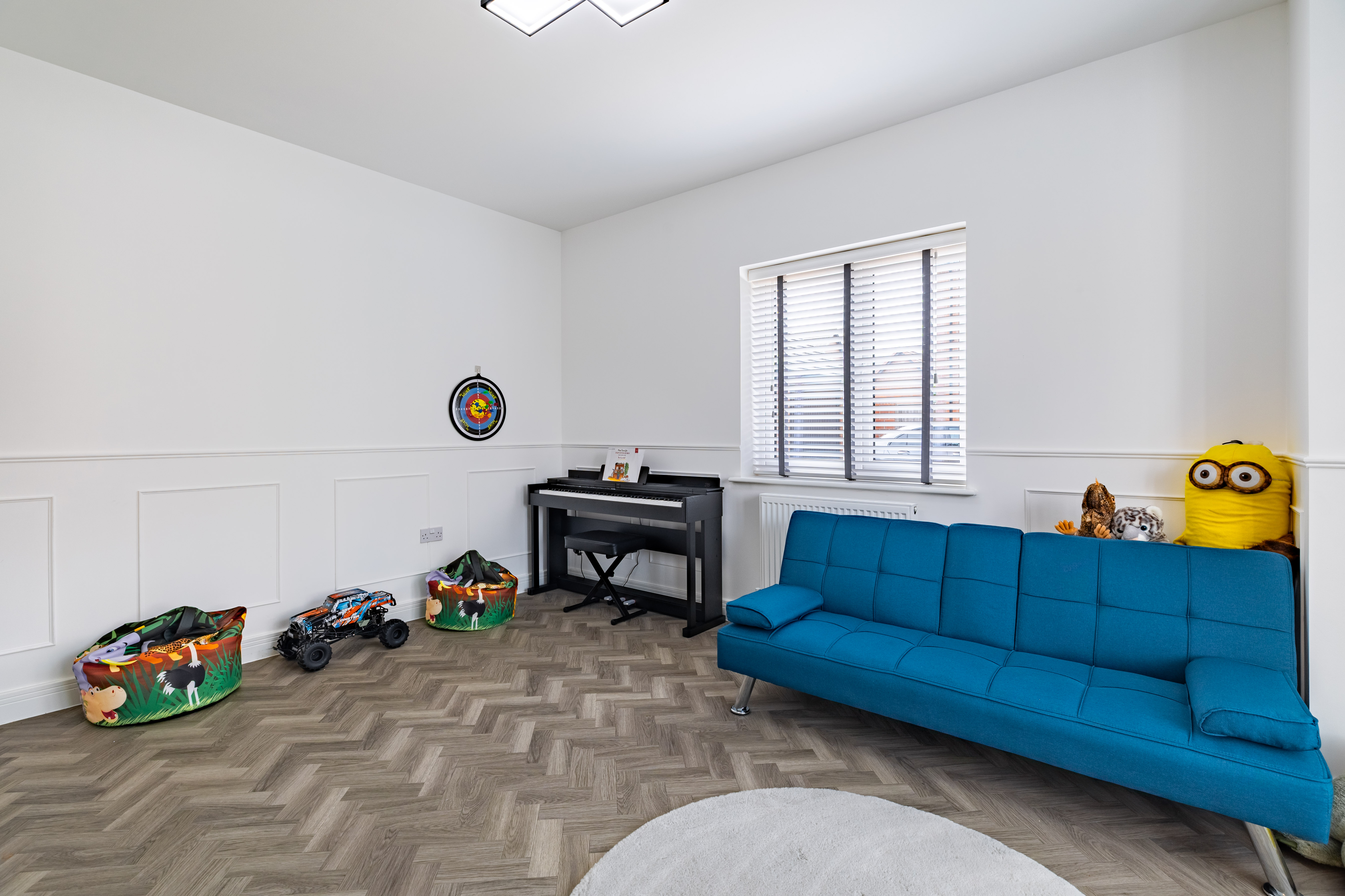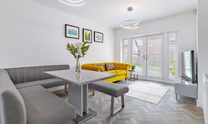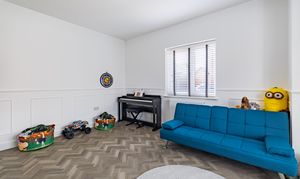 At the front of the house is a second reception room, used by the owners for formal dining, and featuring trendy wall panelling. This is perfect for hosting dinner parties, but would also work well as a dedicated playroom or a useful office. It’s flexible for whatever you may need in the future.