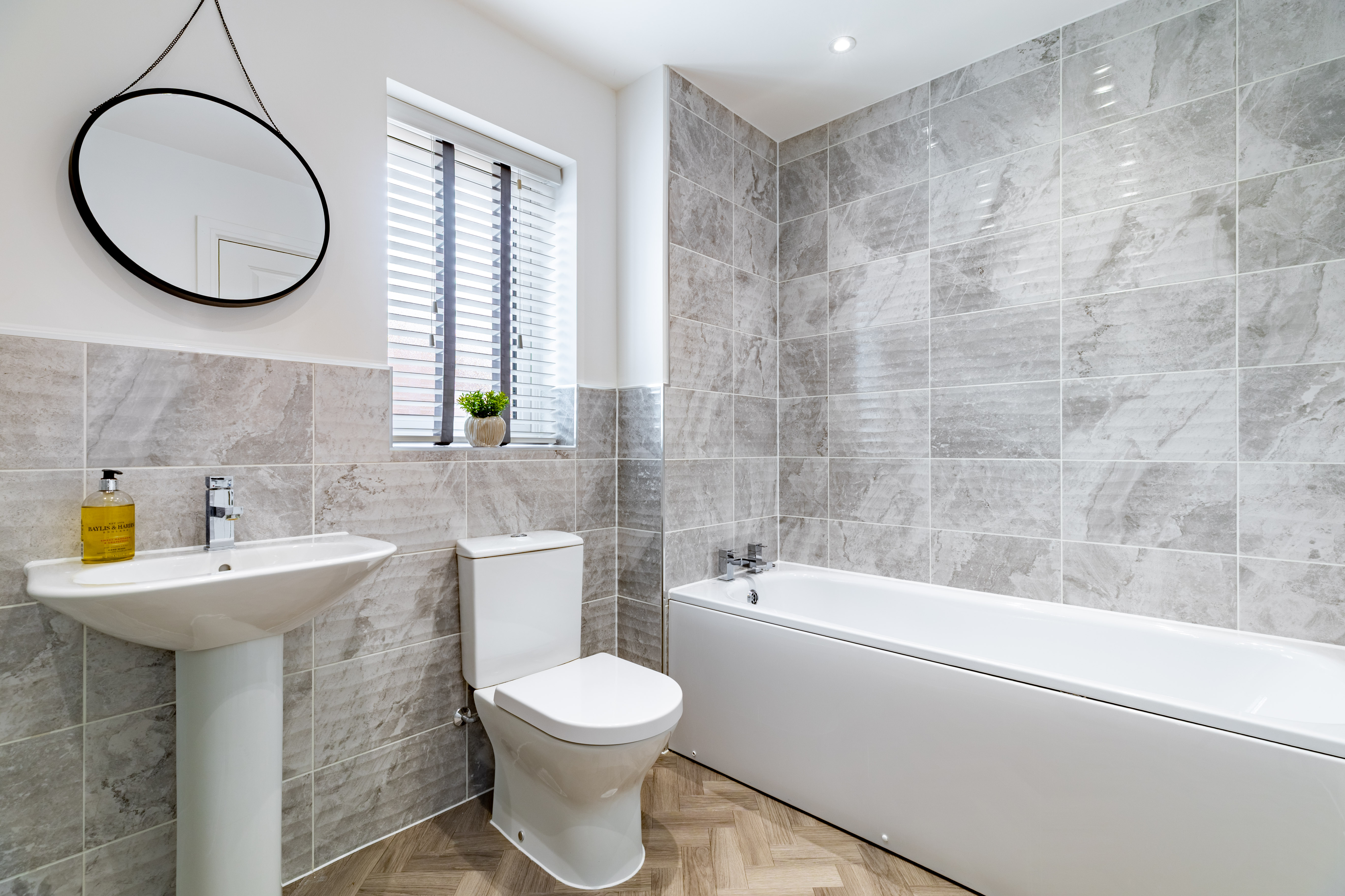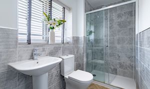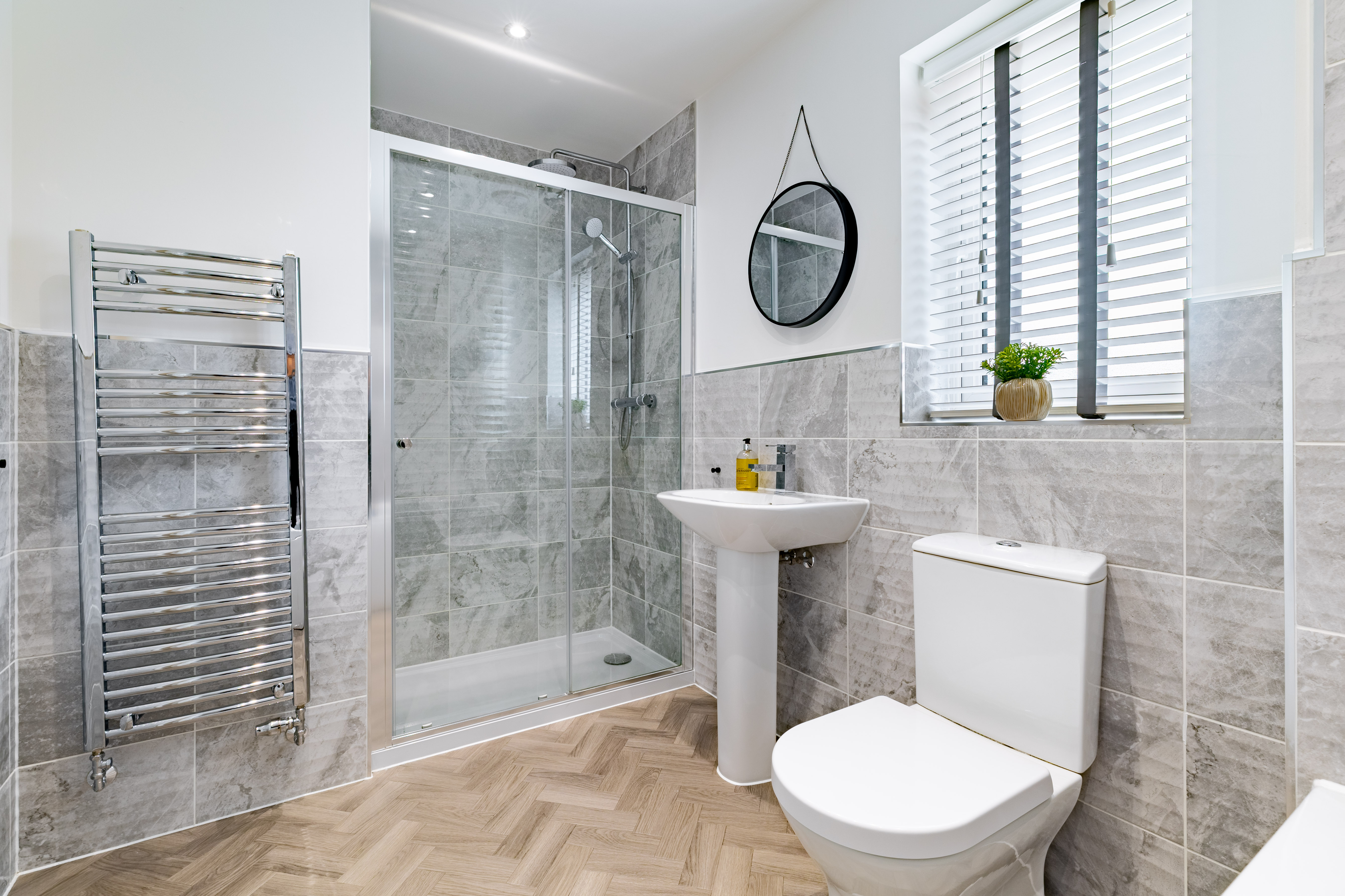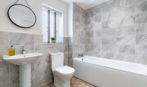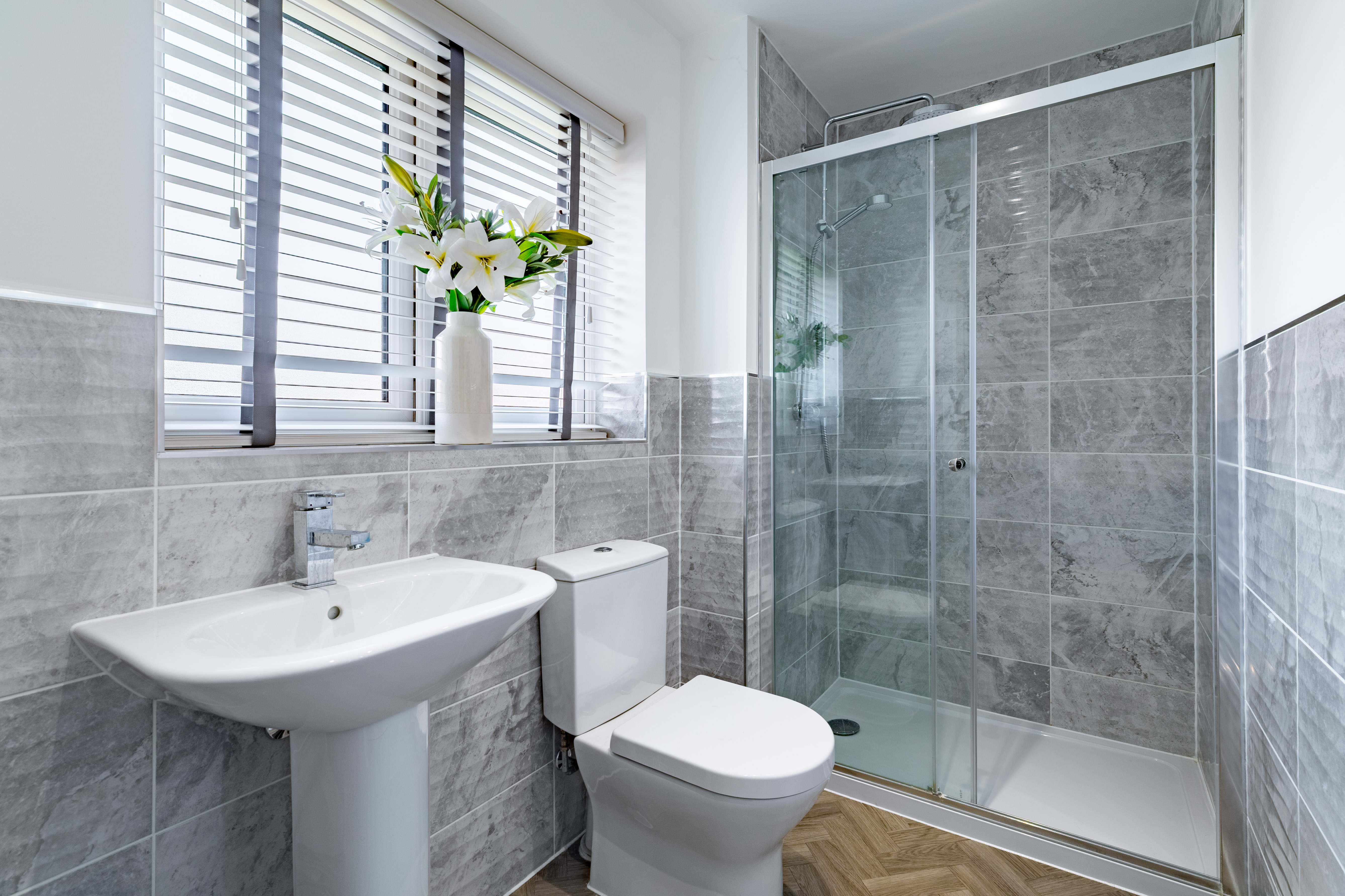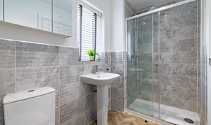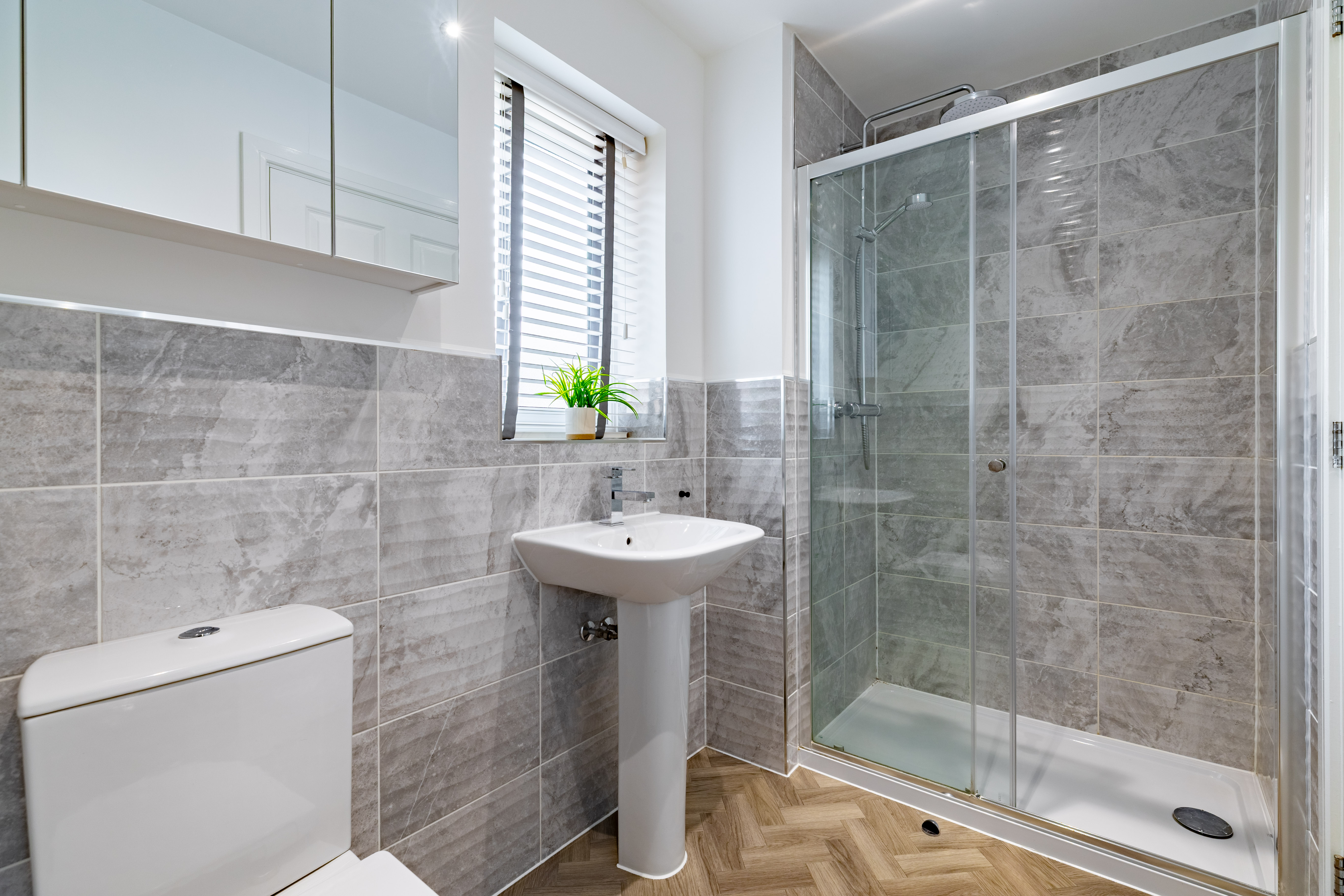 To the first floor are four double bedrooms, bedroom one benefitting from a Juliet balcony, and bedroom two with fitted wardrobes. Bedrooms one and two each have an en suite, and bedrooms three and four share the family bathroom. All the bathrooms are matching, modern, with white Roca sanitaryware, chrome fixtures and fittings, and textured grey tiling.
