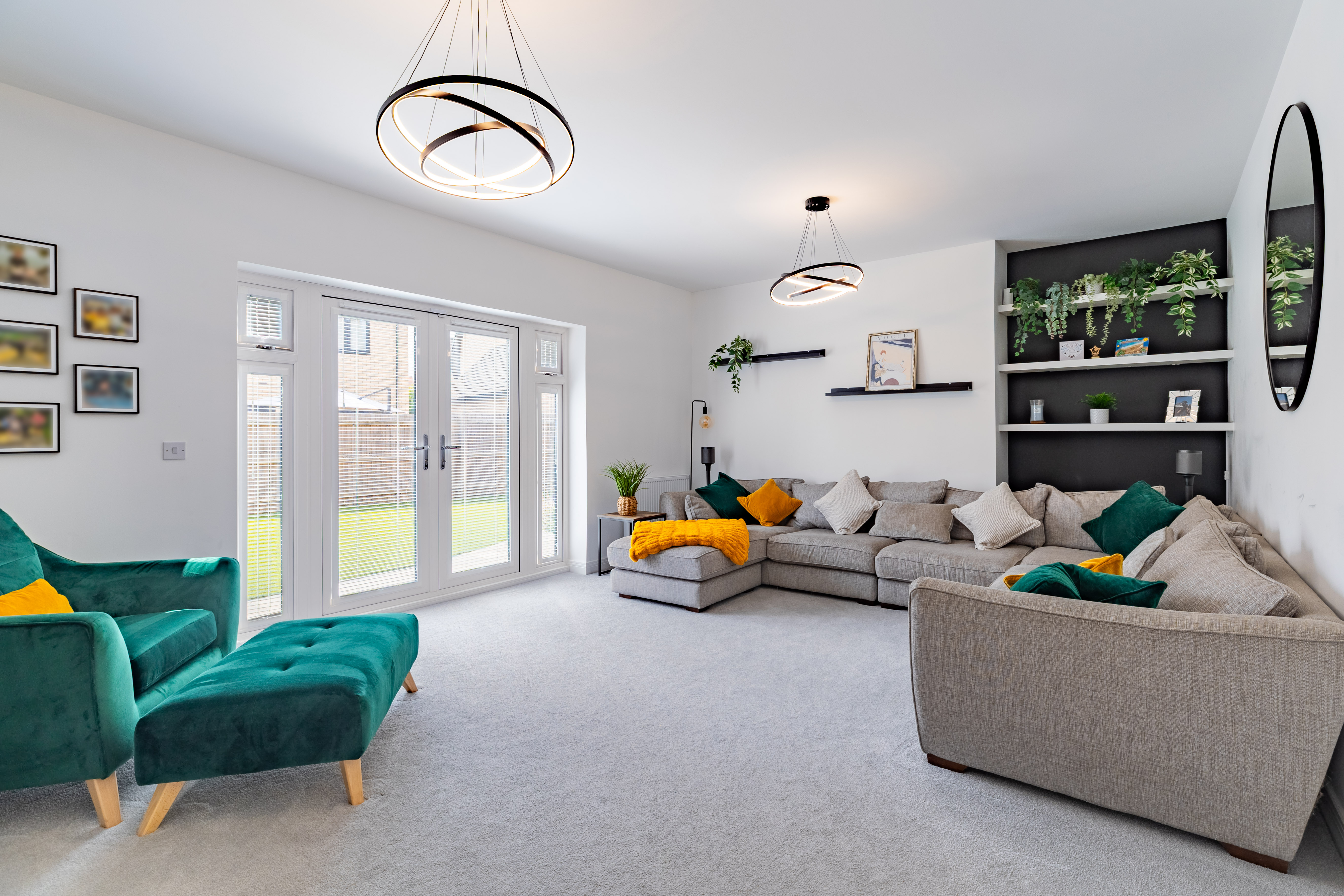At the end of the hall through glazed double doors is the large lounge, cosy from carpeting, and bright from French doors at the back. The room is a great size, with the option for big, comfy sofas for watching TV together as a family, as well as armchairs for extra seating. The ceilings are high enough for a tall Christmas tree, there’s ample floor space to spread out toys, and there are shelves for storing books and displaying decorative items.