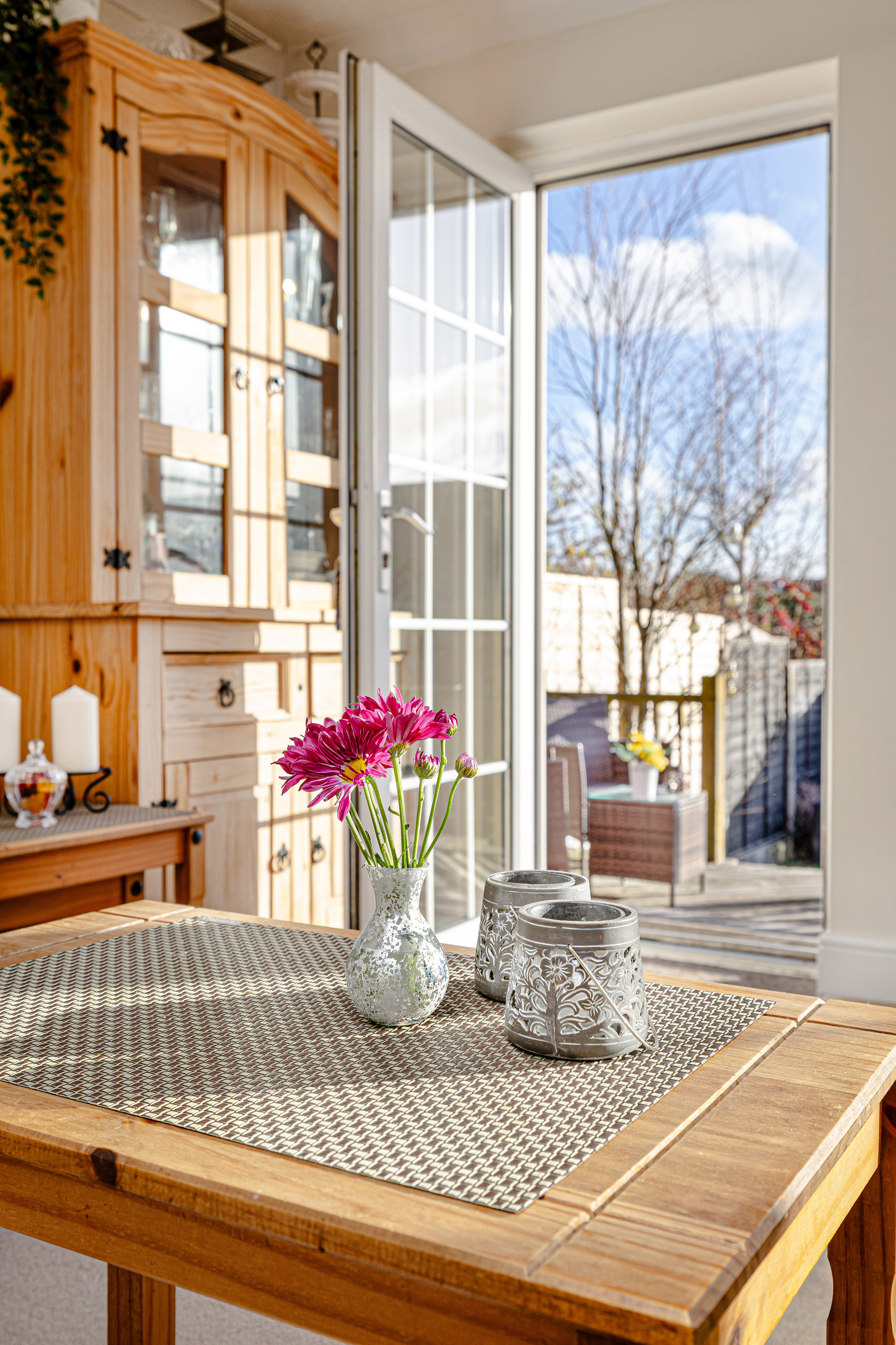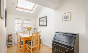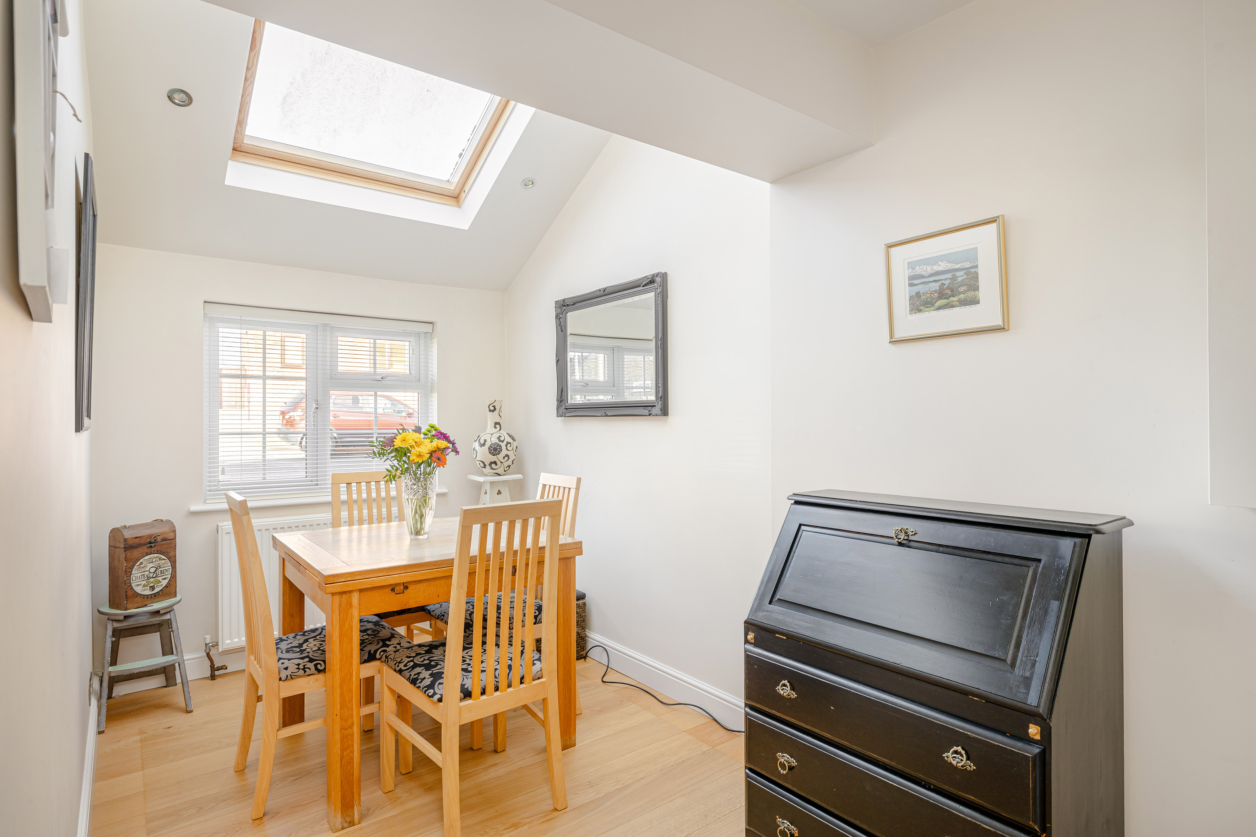 The current owners have thoughtfully converted the original garage to create a bright dining room with a vaulted ceiling and large skylight, making it an uplifting and versatile space, perfect for everyday family use, home working or entertaining. From here, the hallway leads through to a well-appointed kitchen fitted with shaker-style cabinetry, generous worktop space and room for appliances.