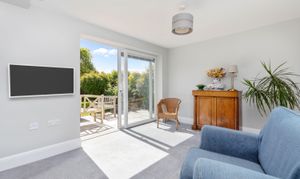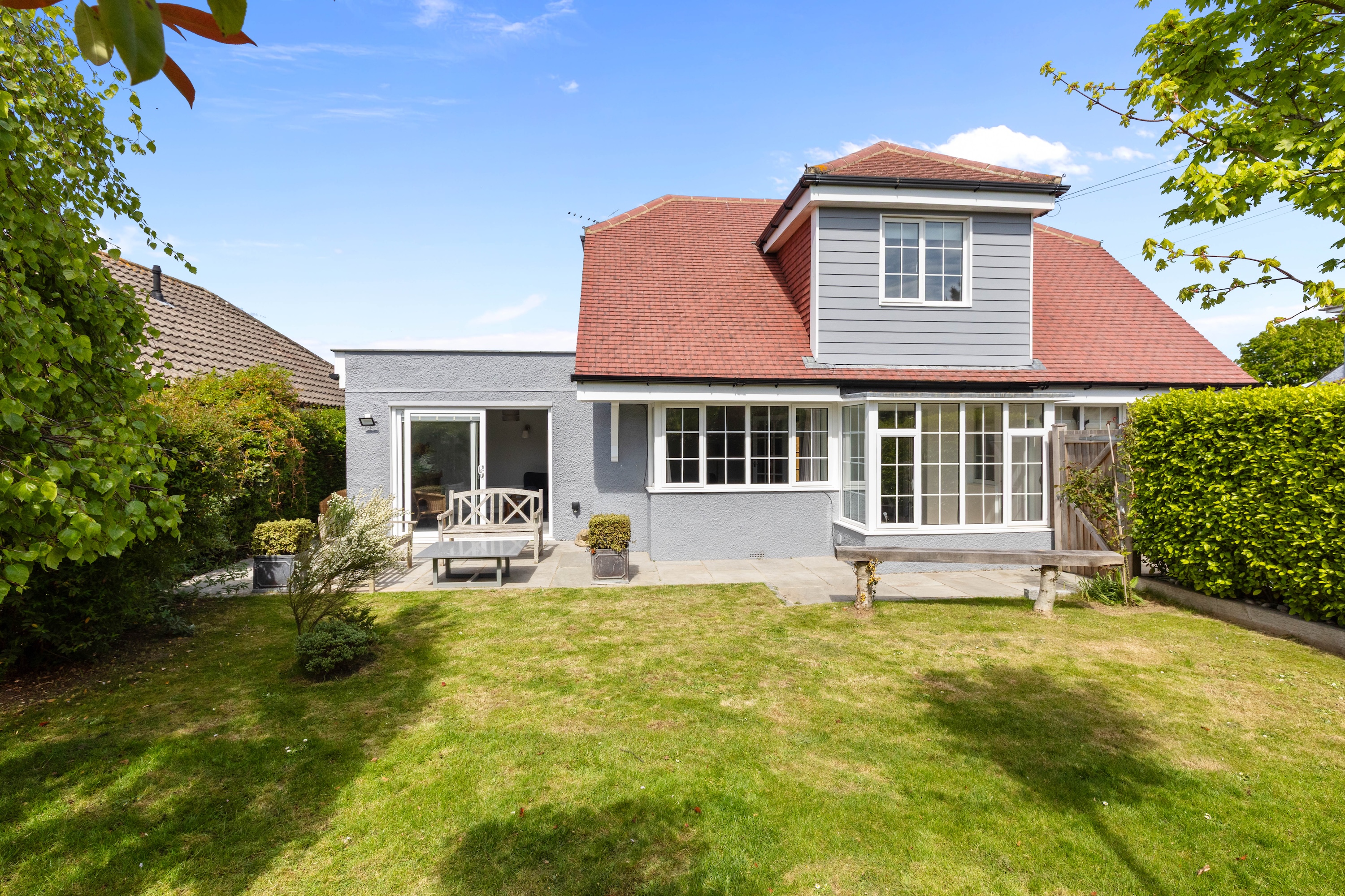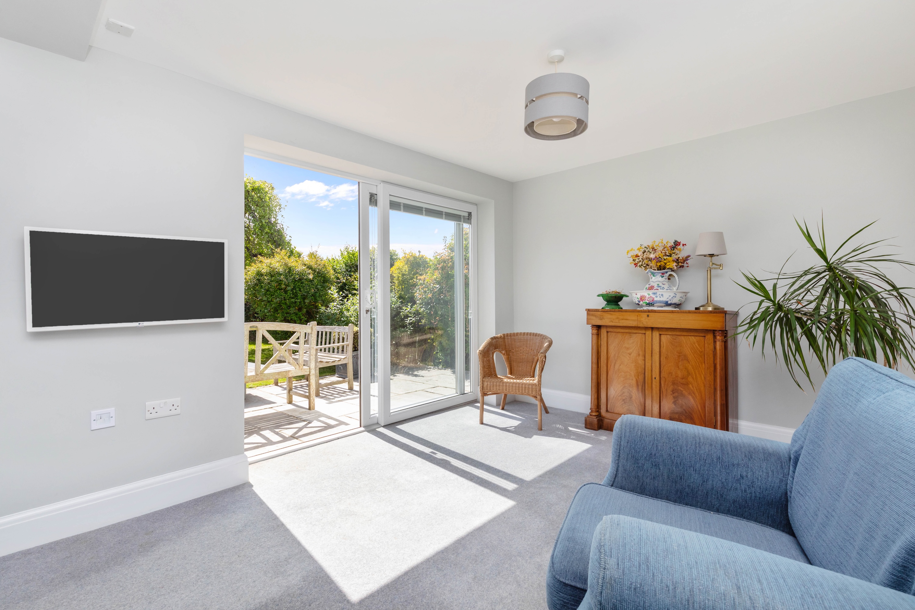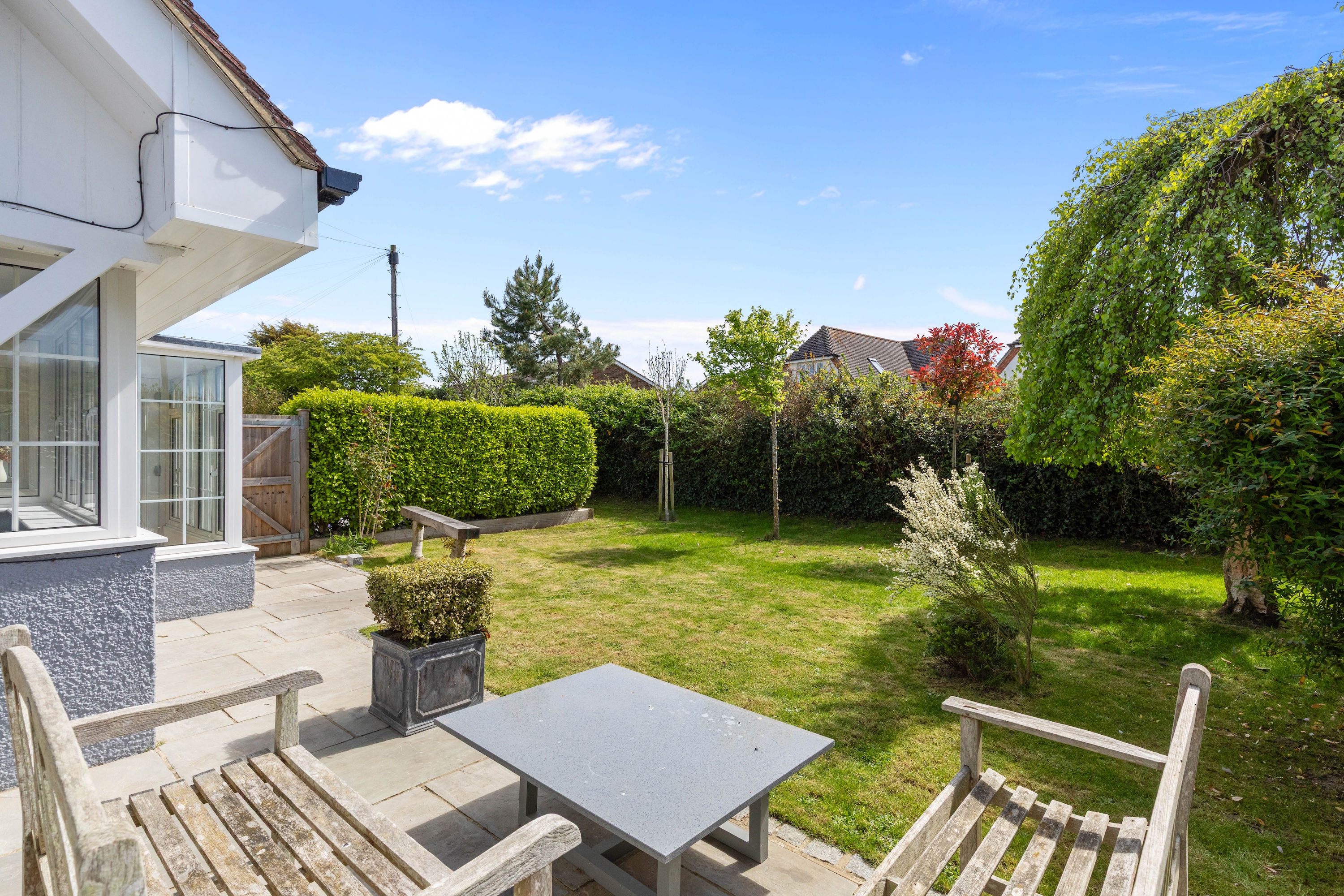 The property is beautifully presented throughout, and the welcoming entrance hall sets the tone, leading to all principal rooms. The spacious living room benefits from a southerly aspect, bathing the area in natural light. A set of sliding doors leads to a private terrace area, ideal for entertaining.