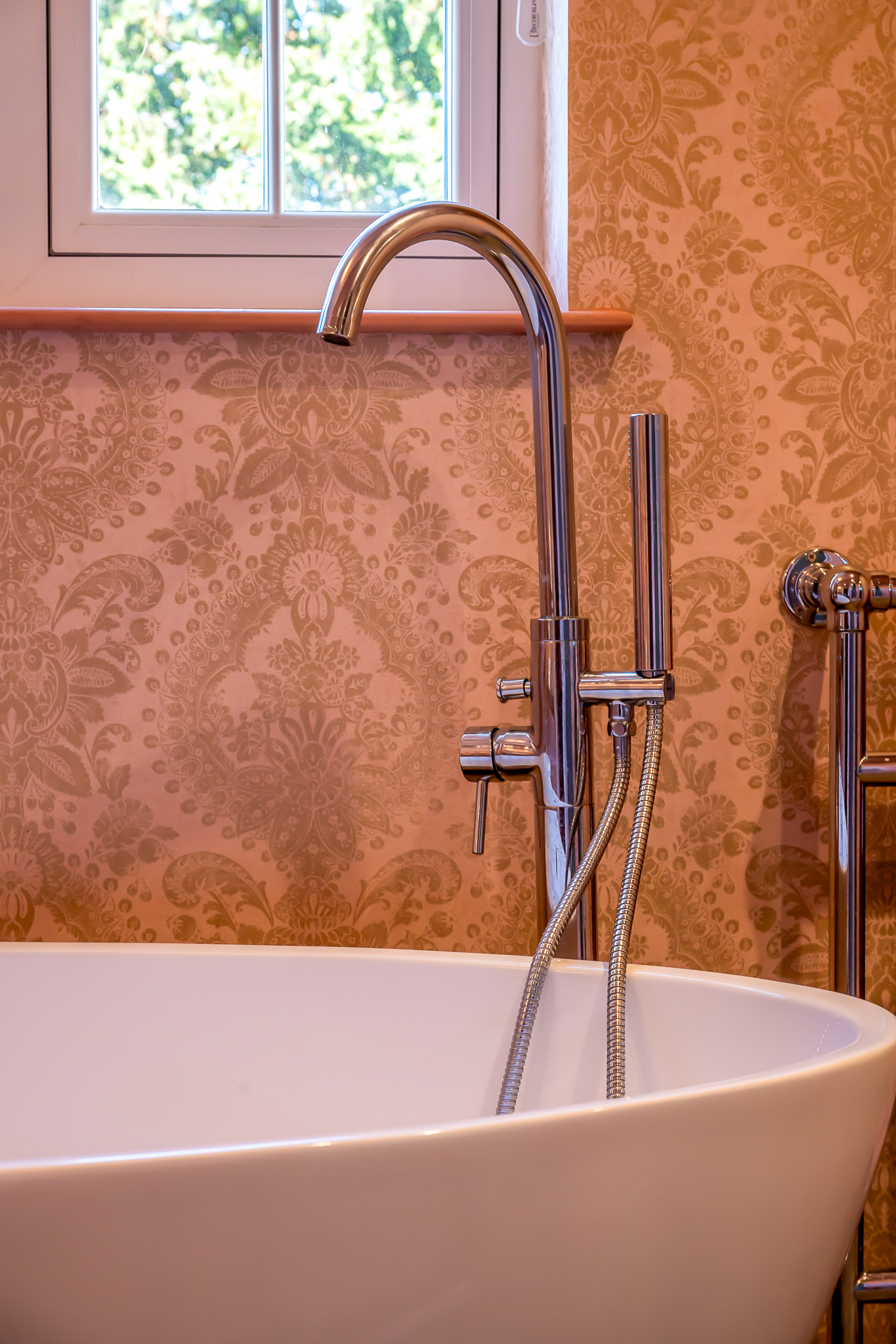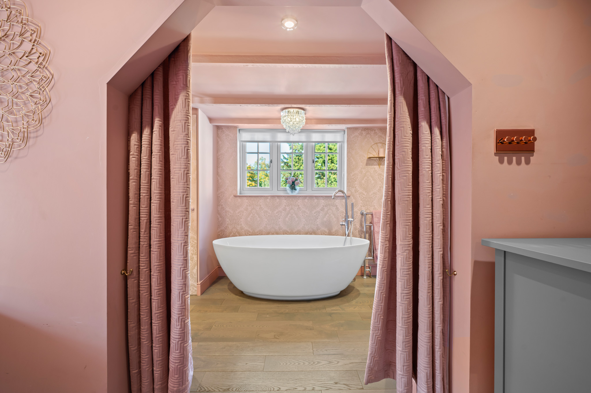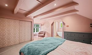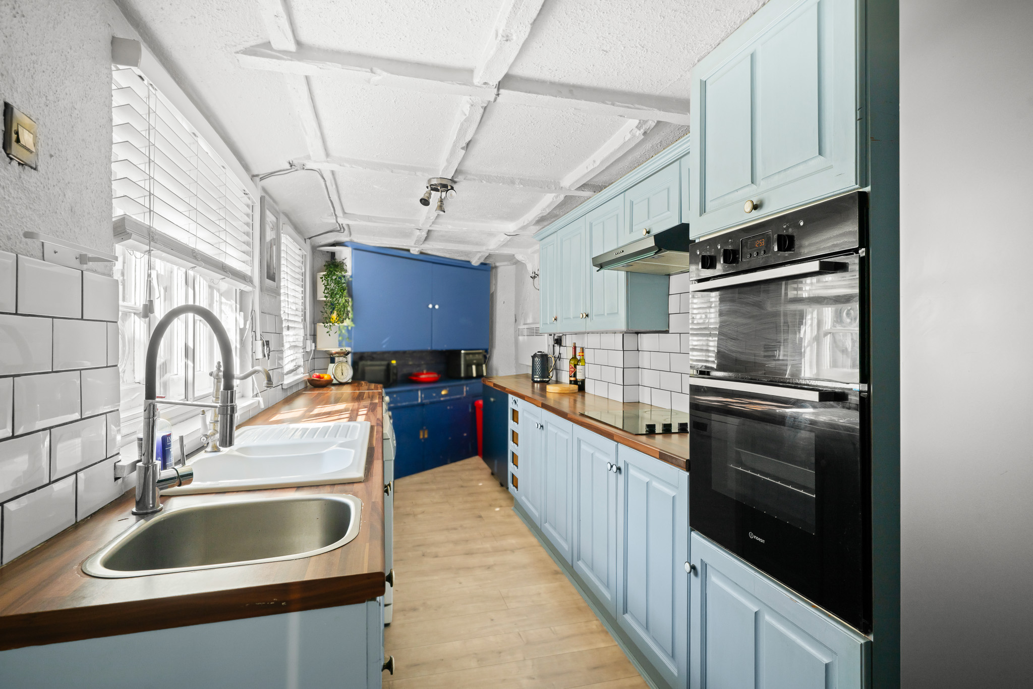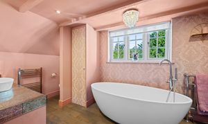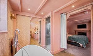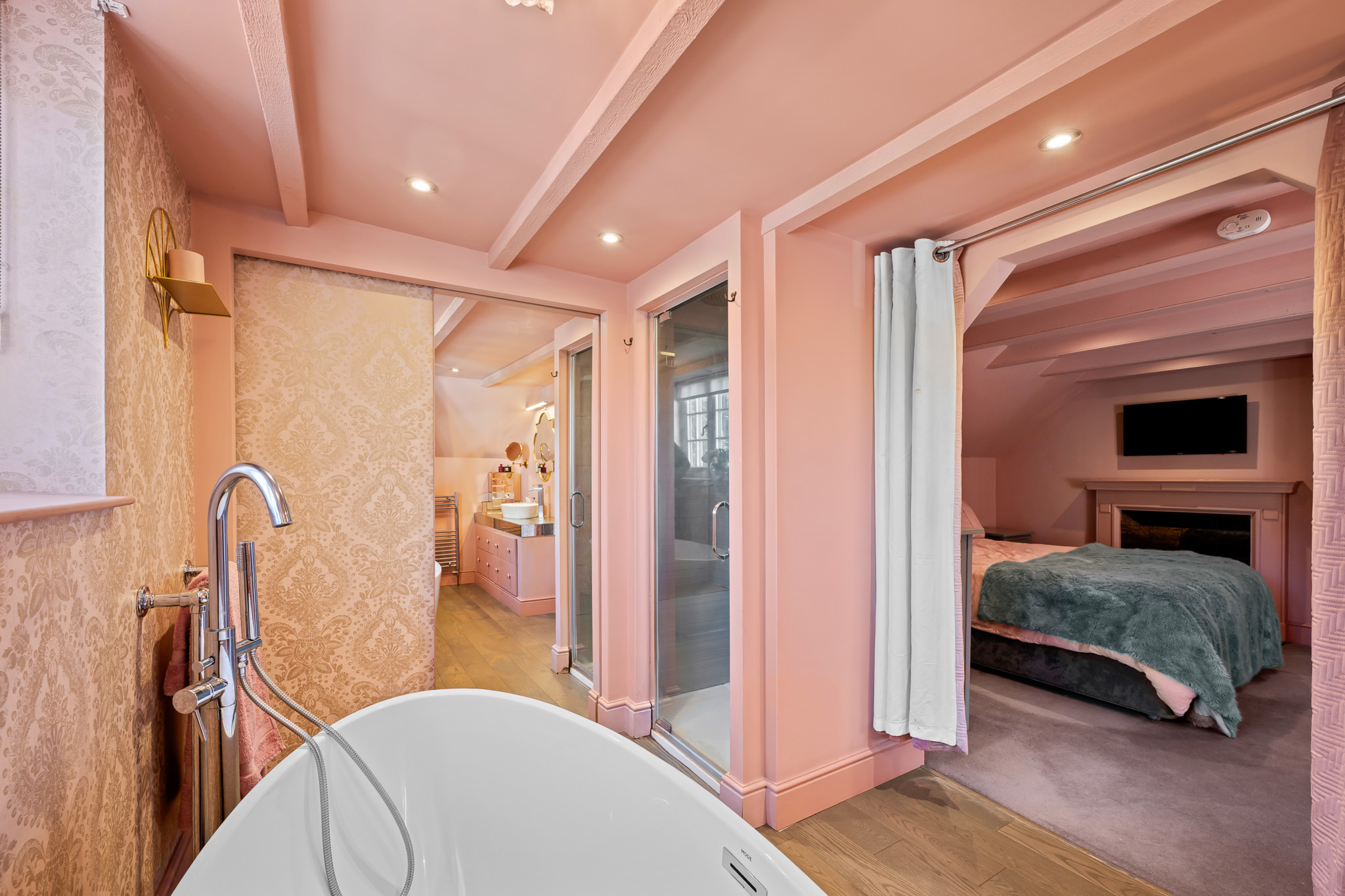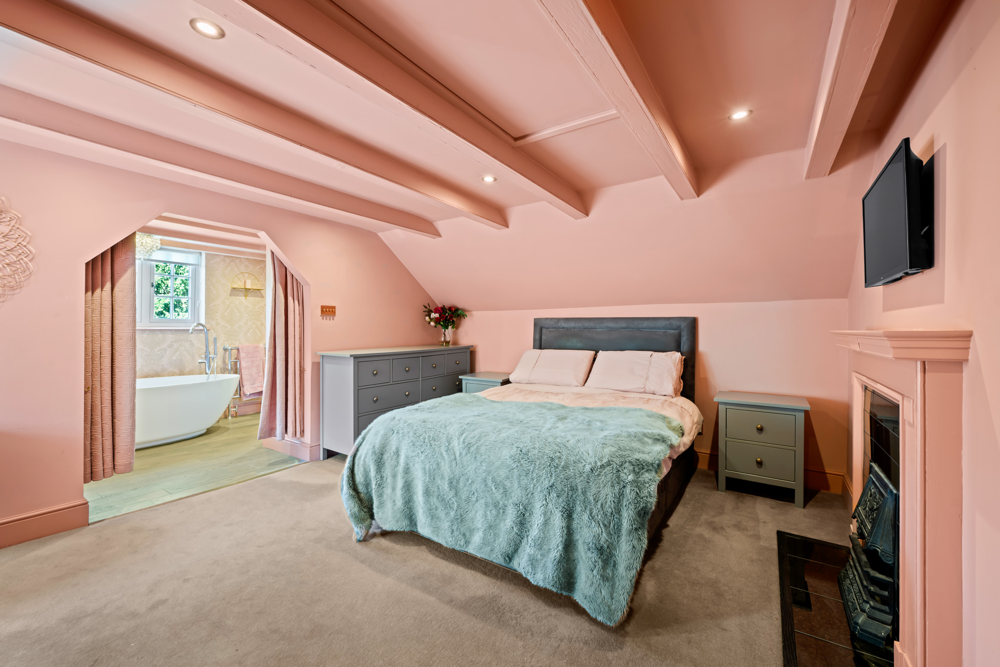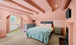 To the first floor, there are two well proportioned bedrooms – a single/study and a very impressive principal bedroom with beamed ceiling, inbuilt wardobes and access through to a large en-suite bathroom with luxury free-standing bath suite and double shower.