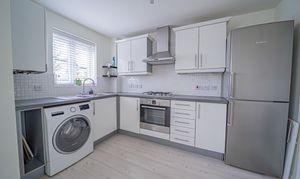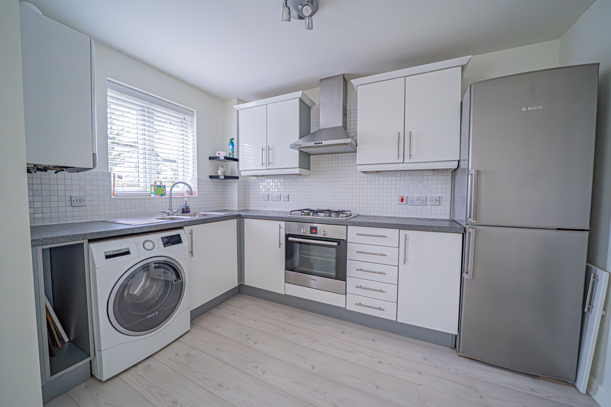 Integrated oven, integrated hob, extractor, fridge/freezer, washer/dryer, all blinds and light fittings and fitted wardrobes in bedroom.