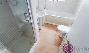 Rear facing double glazed frosted window, radiator, four piece suite in white comprising briefly of Wc, pedestal sink, panelled bath and shower cubical, part tiled walls.