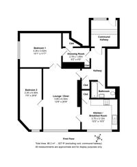Fronted by an attractive communal lawn garden the driveway leads around to the rear of the property where there is a garage block and resident parking. An external staircase leads up to a first floor communal entrance hall. The flat itself opens to a reception hall with useful storage cupboard and access to a cloakroom which could alternatively be adapted to a dedicated utility room and currently serves as a separate dressing room to the main bedroom. Leading off the reception hall there is a stylish bathroom presenting contemporary fittings with an over bath shower. The spacious living room is large enough for lounge and formal dining, and adjoins the kitchen which is fitted with sleek handle less units with integrated appliances and has space for a breakfast table. Leading off the living room there are two well-proportioned double bedrooms with the main bedroom opening through double doors and having the adjoining separate dressing room.