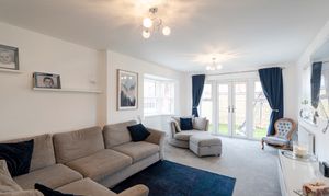 Upon entering, you're welcomed by a bright and spacious hallway that sets the tone for the rest of the home. The ground floor offers a flowing layout ideal for modern family living, featuring a stylish sitting room filled with natural light and opening through double doors onto a large paved patio and garden—perfect for indoor-outdoor entertaining.