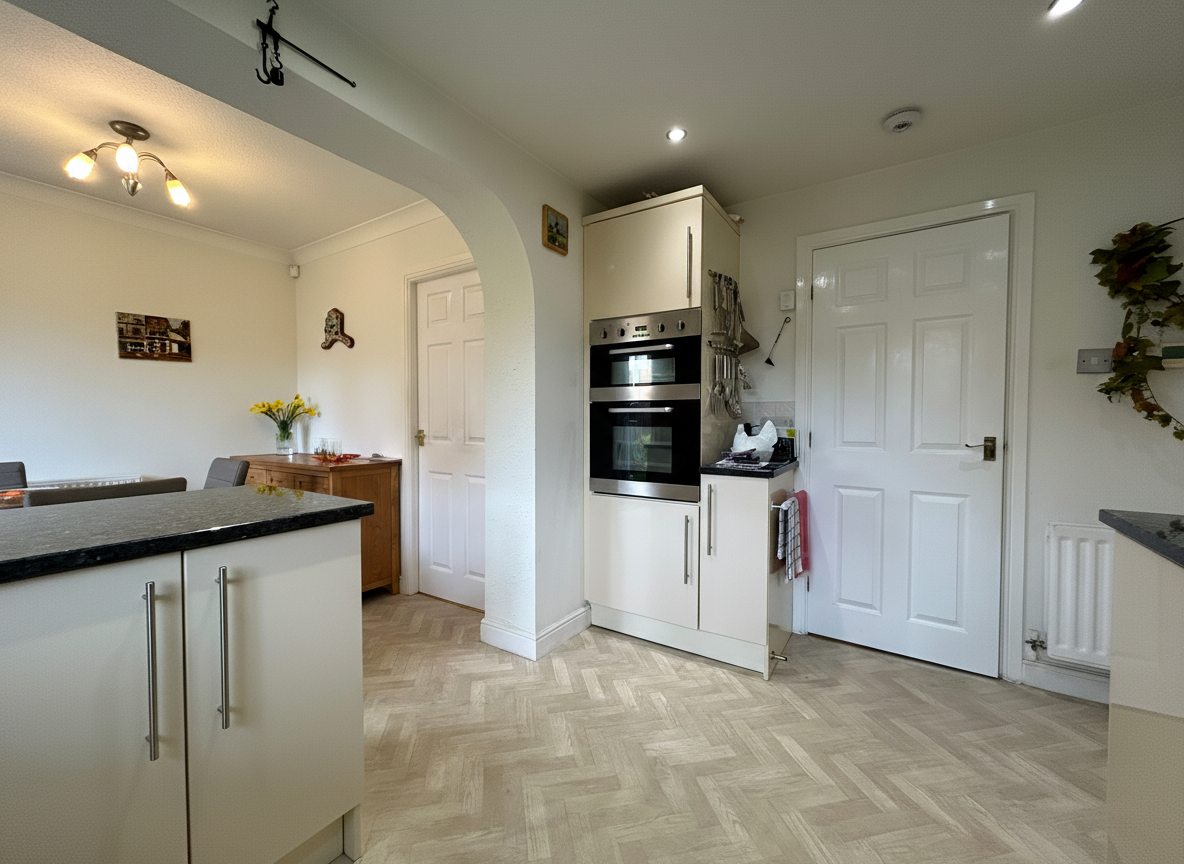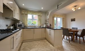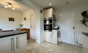 Fitted kitchen with a range of wall and base units with contrasting worktops. Fitted with integrated appliances which include; Oven, Hob, Extractor, Dishwasher and Fridge. Windows to rear elevation. Patio doors onto rear garden. Internal door through to: