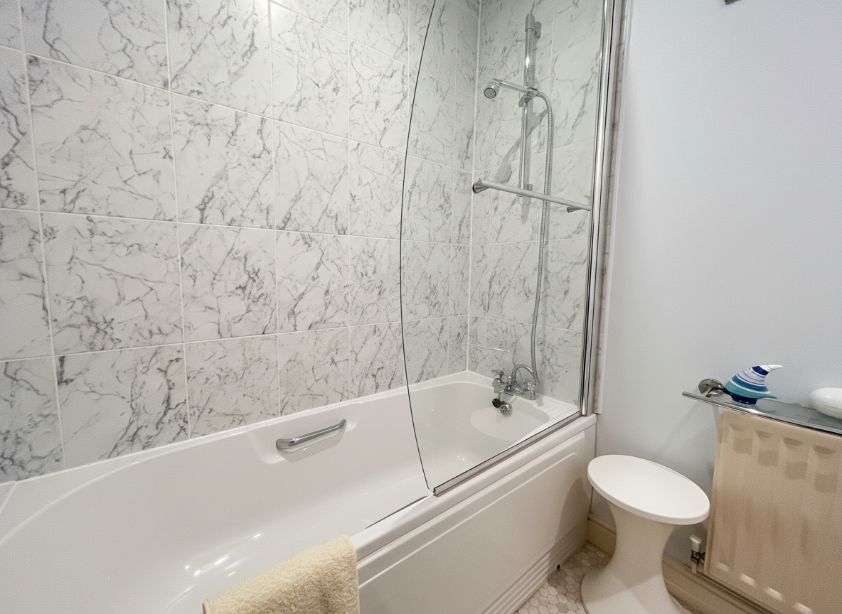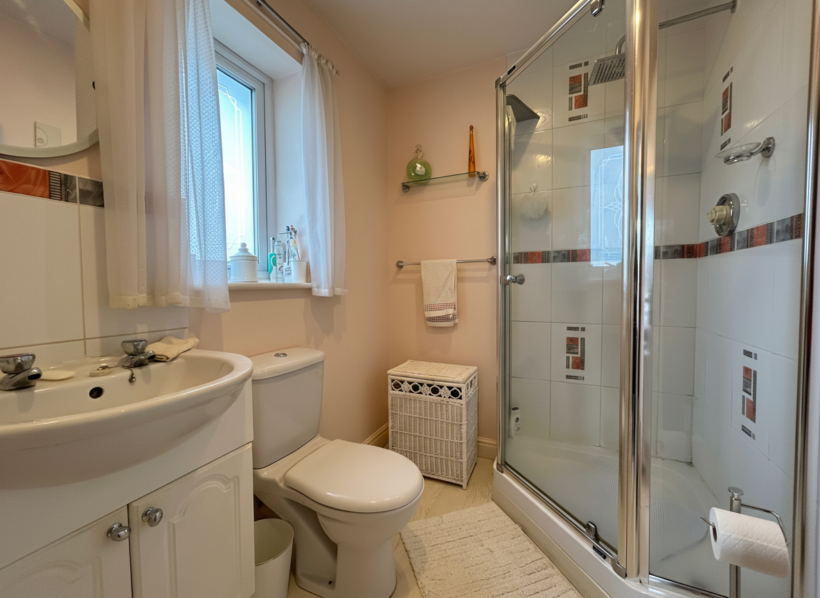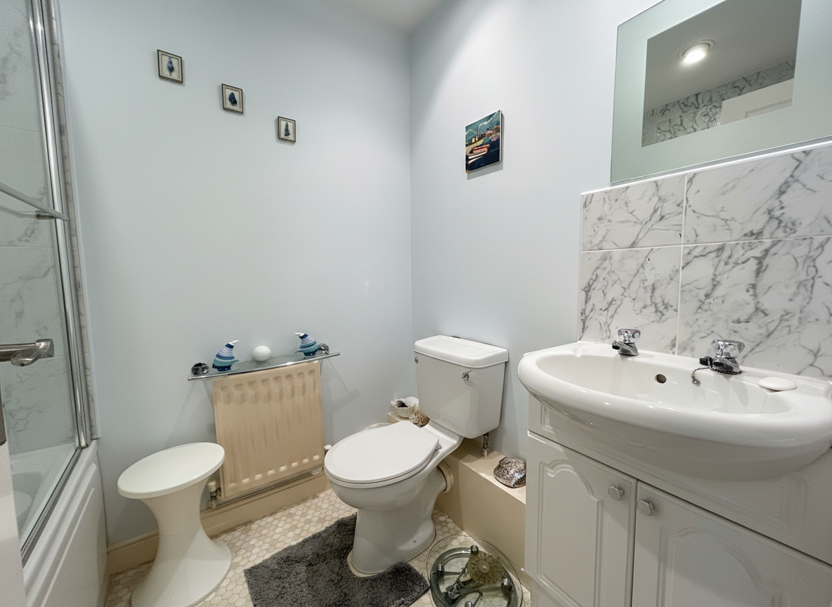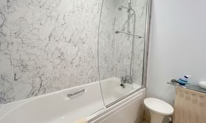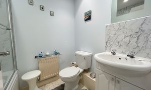 Fitted with low-level W.C, handwash basin and bath with shower over.