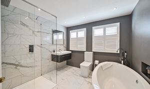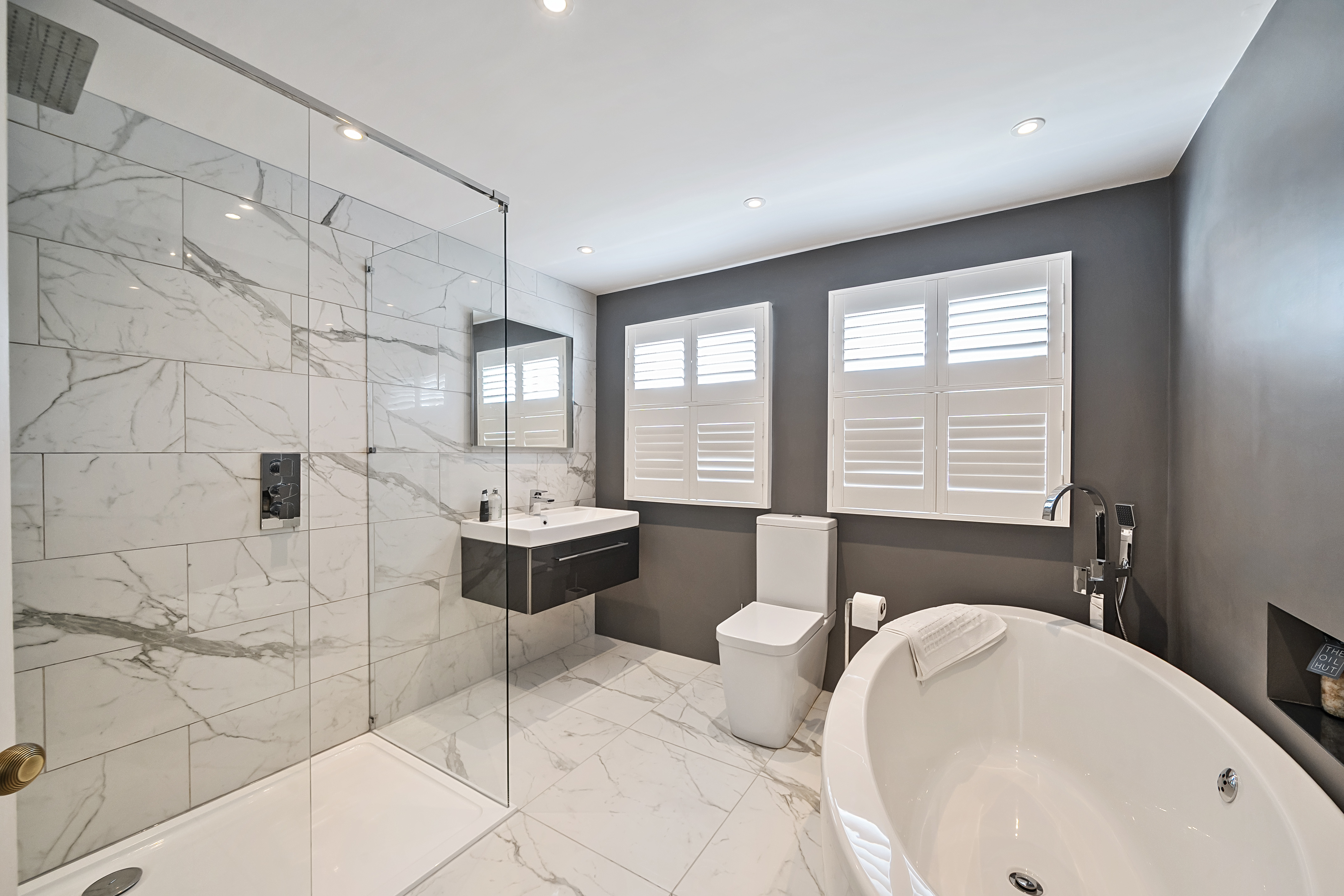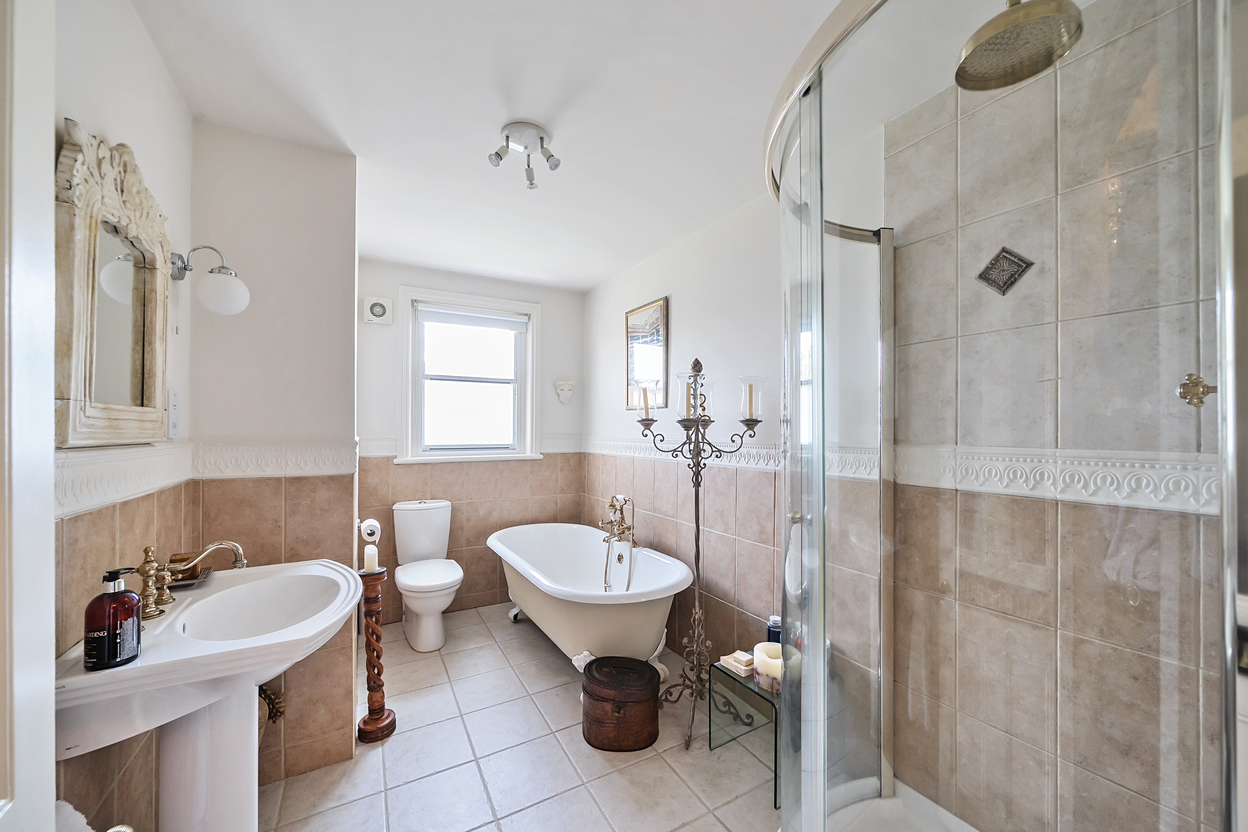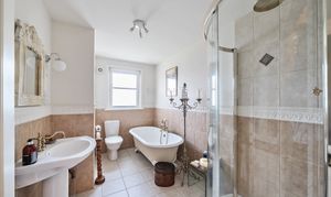 To the first floor the split level landing branches to a house bathroom with white suite including a free standing bathtub and separate shower enclosure, and two excellent sized double bedrooms, one of which is currently used as a large dressing room with an en-suite shower room with large enclosure and twin basins. The second floor reveals a stylish, contemporary bathroom with oval free standing bathtub and large walk in shower, two further double sized bedrooms both with built in wardrobes and a fifth single bedroom which could alternatively be used as a home office if required.