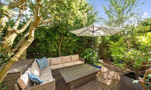 Secure patio garden opening from the kitchen and lower ground floor accommodation surrounded by established planting and shrubs.