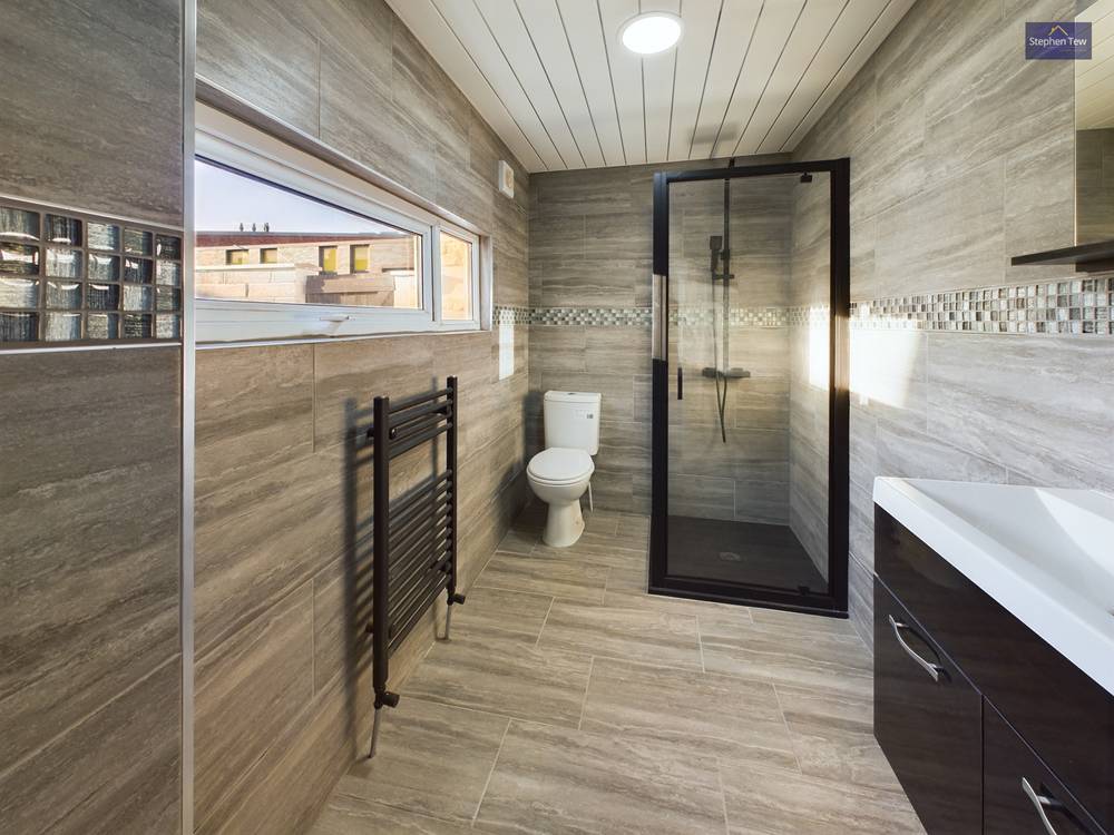 Leading off from the utility room. Comprising of low flush WC, wash basin with underneath storage cupboard, enclosed shower cubicle. Floor to ceiling tiles, flushed ceiling spotlights, heated towel rail and uPVC double glazed window to the side elevation.