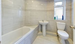 Comprising of low flush WC, wash basin and panelled bath with overhead shower attachment. Floor to ceiling tiles, heated towel rail, flushed ceiling spotlights and uPVC double glazed opaque window to the side elevation.