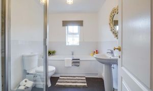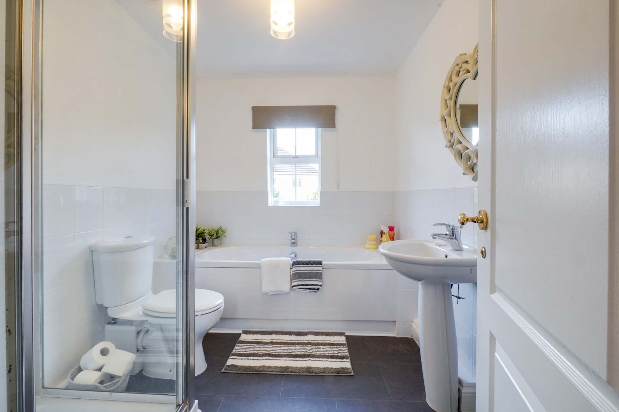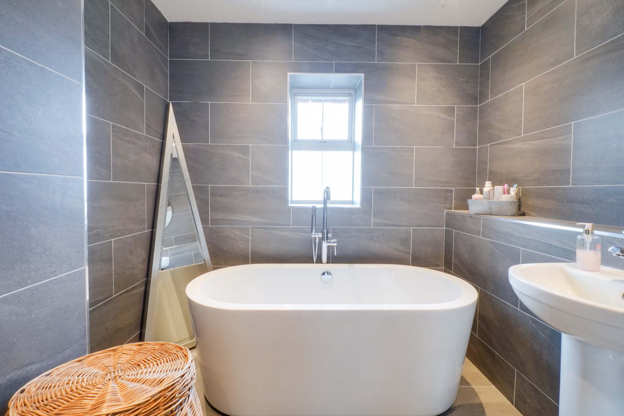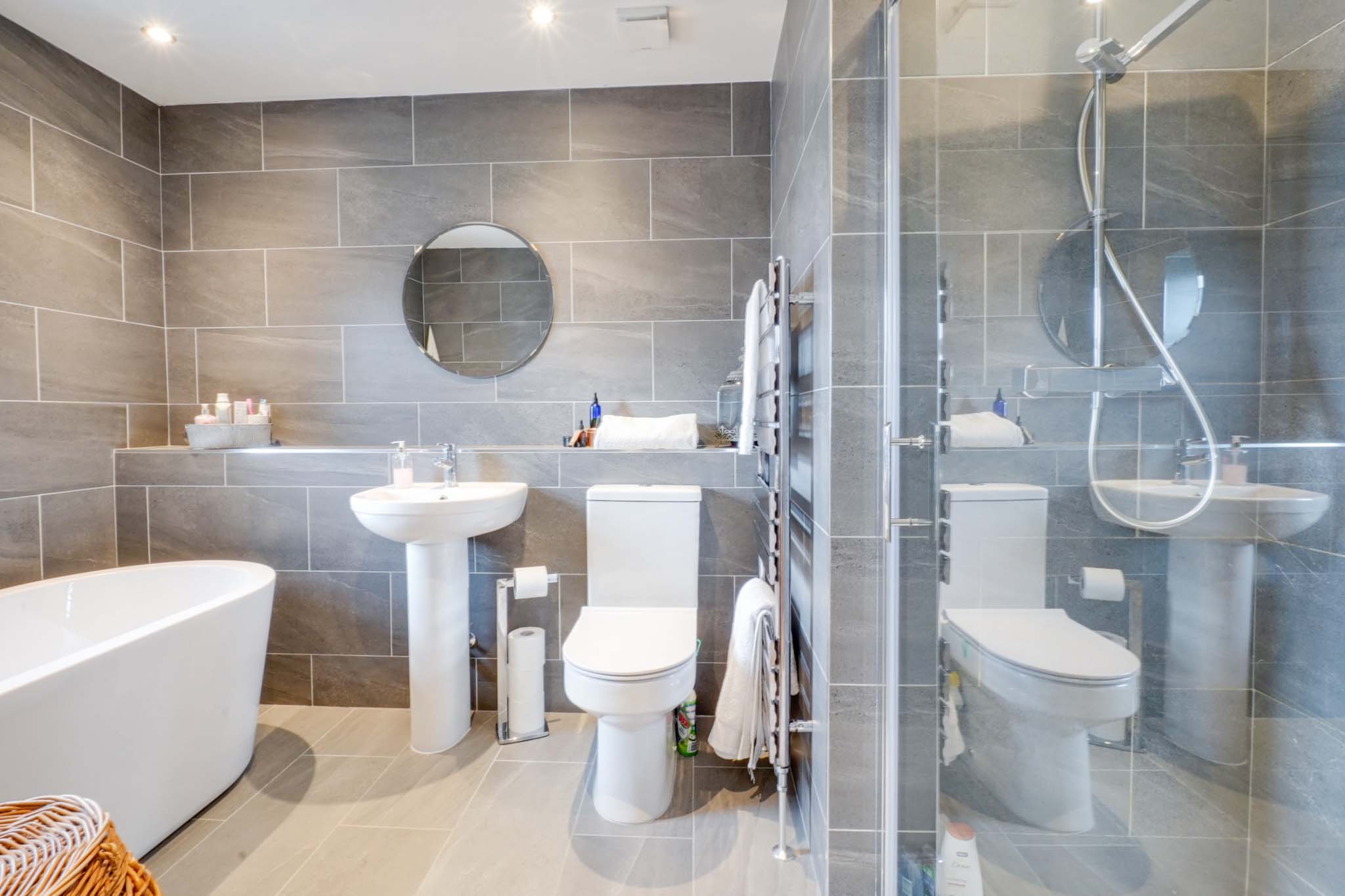 With double glazed window to the rear elevation, tiled floor, part tiled walls, shower cubicle, bath, low-level WC, wash hand basin, ladder style towel rail/radiator.
