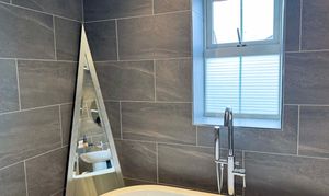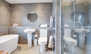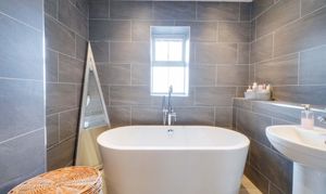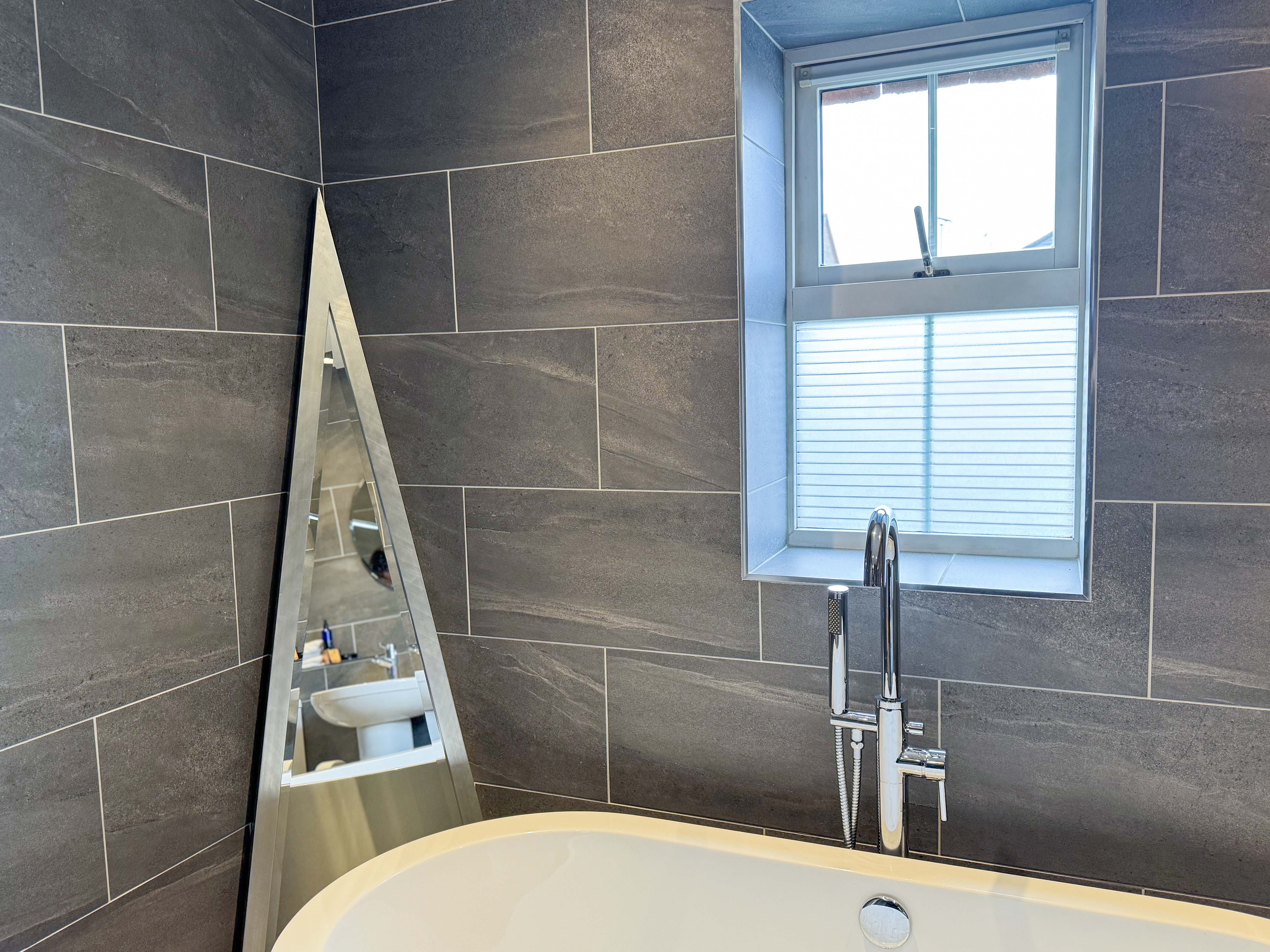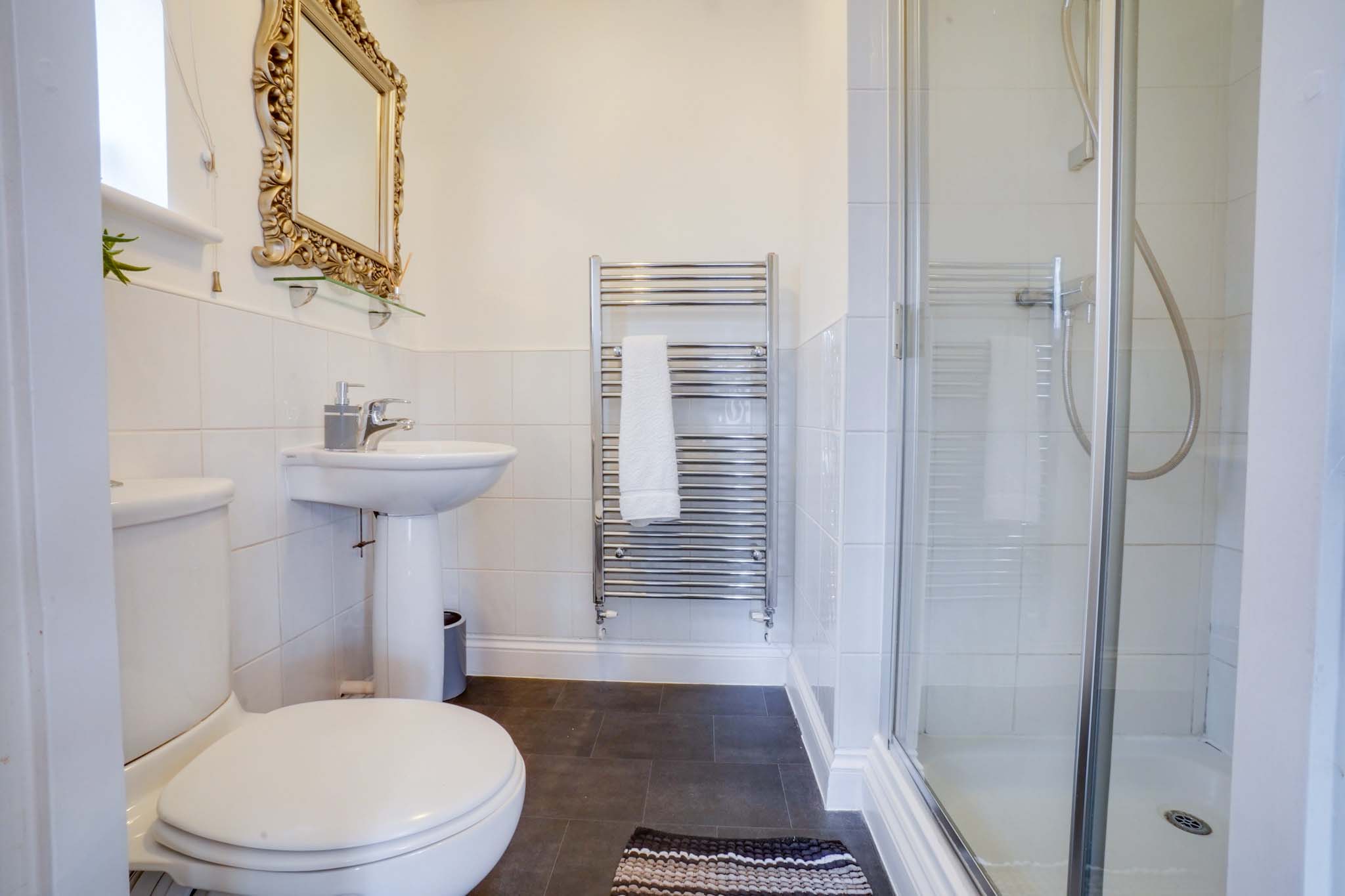 Measurement into shower. With double glazed window to the front elevation, tiled floor, tiled walls, wash hand basin, low-level WC, shower cubicle, bath, ladder style towel rail/radiator.