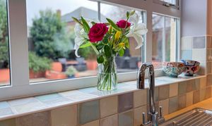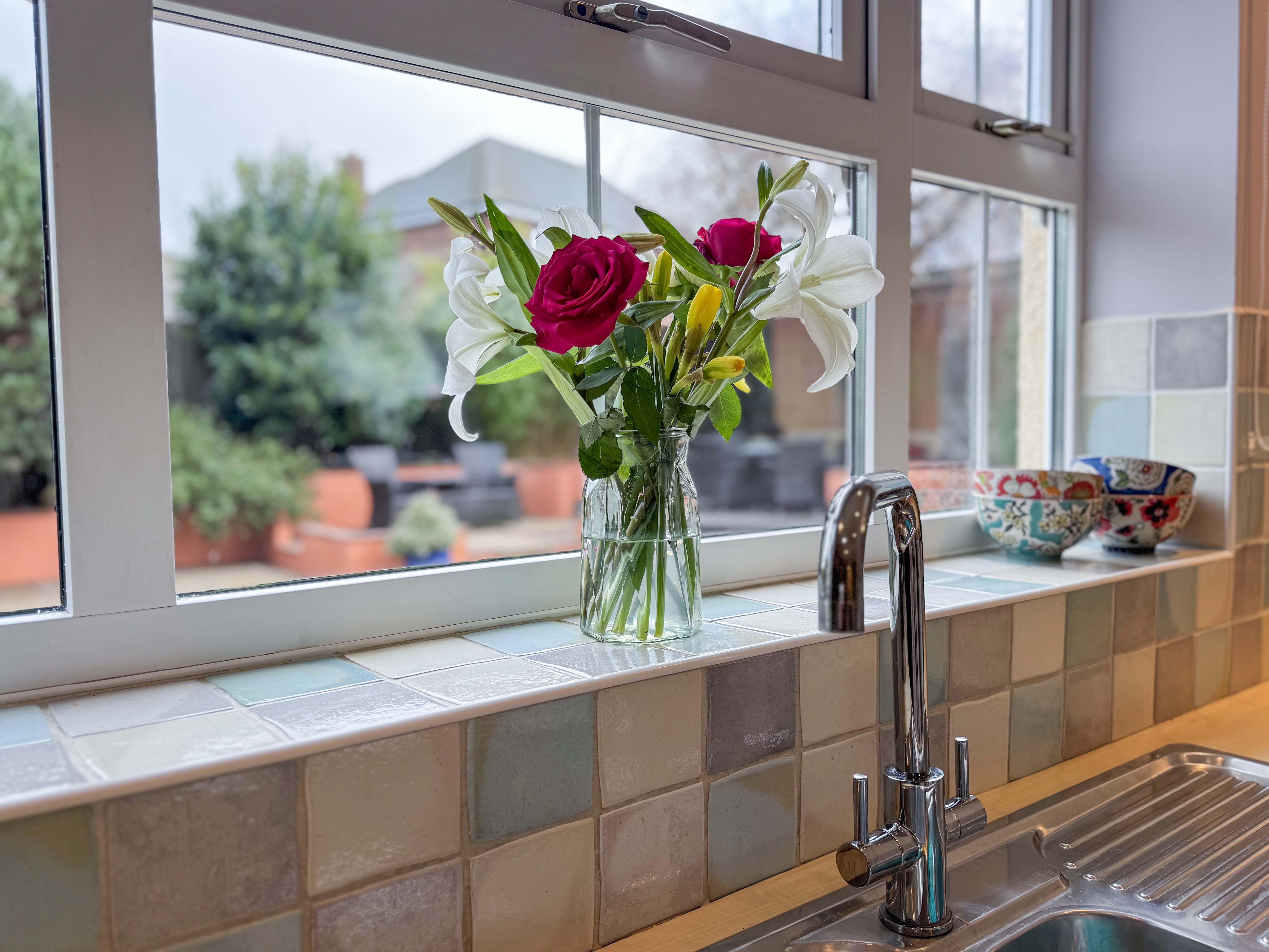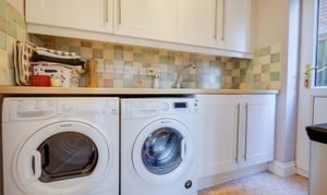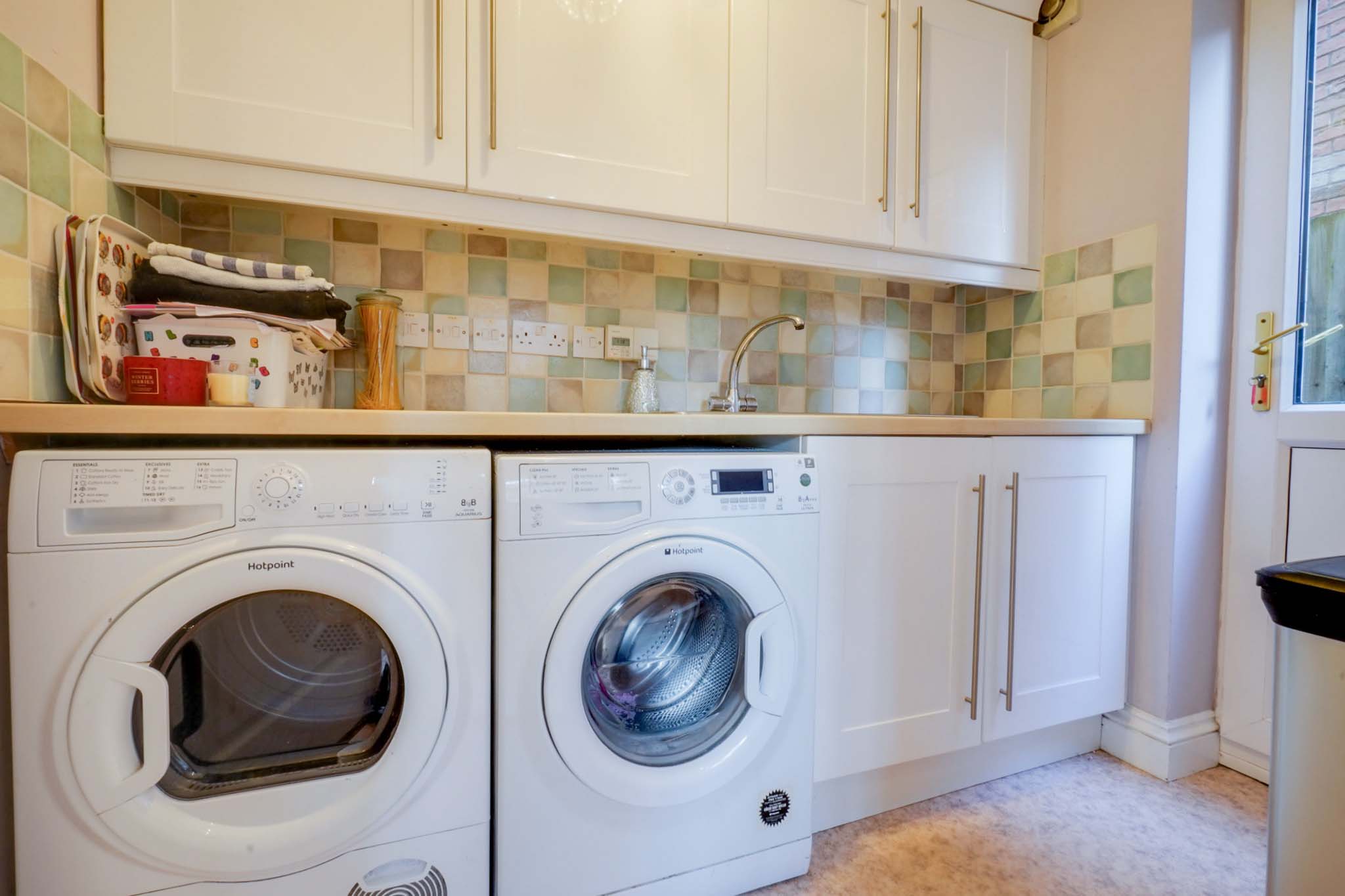 With double glazed door to the rear garden, wall and base units, part tiled walls, vinyl floor, stainless steel sink and drainer, plumbing for washing machine and tumble dryer.