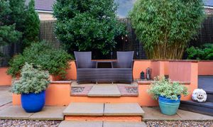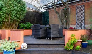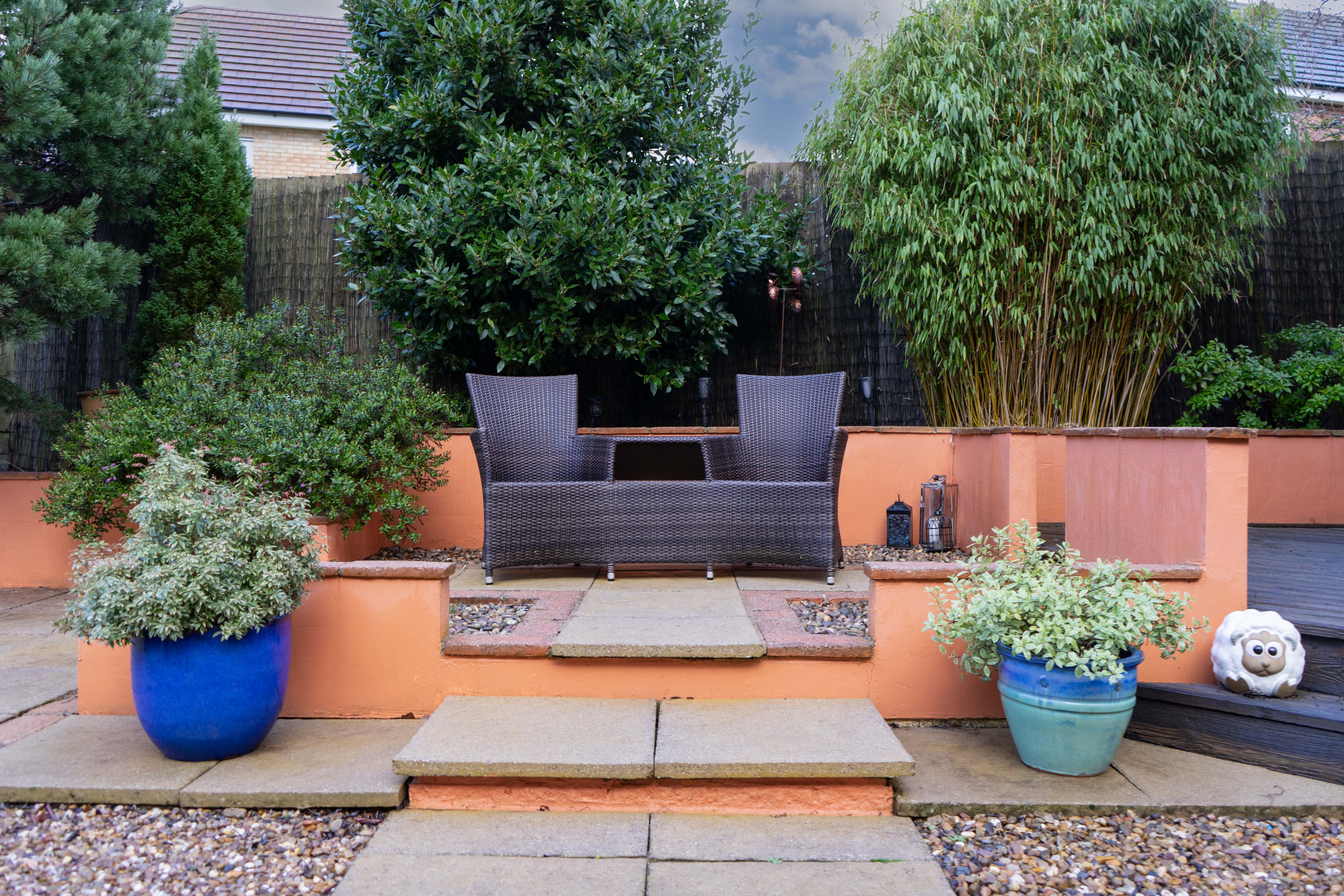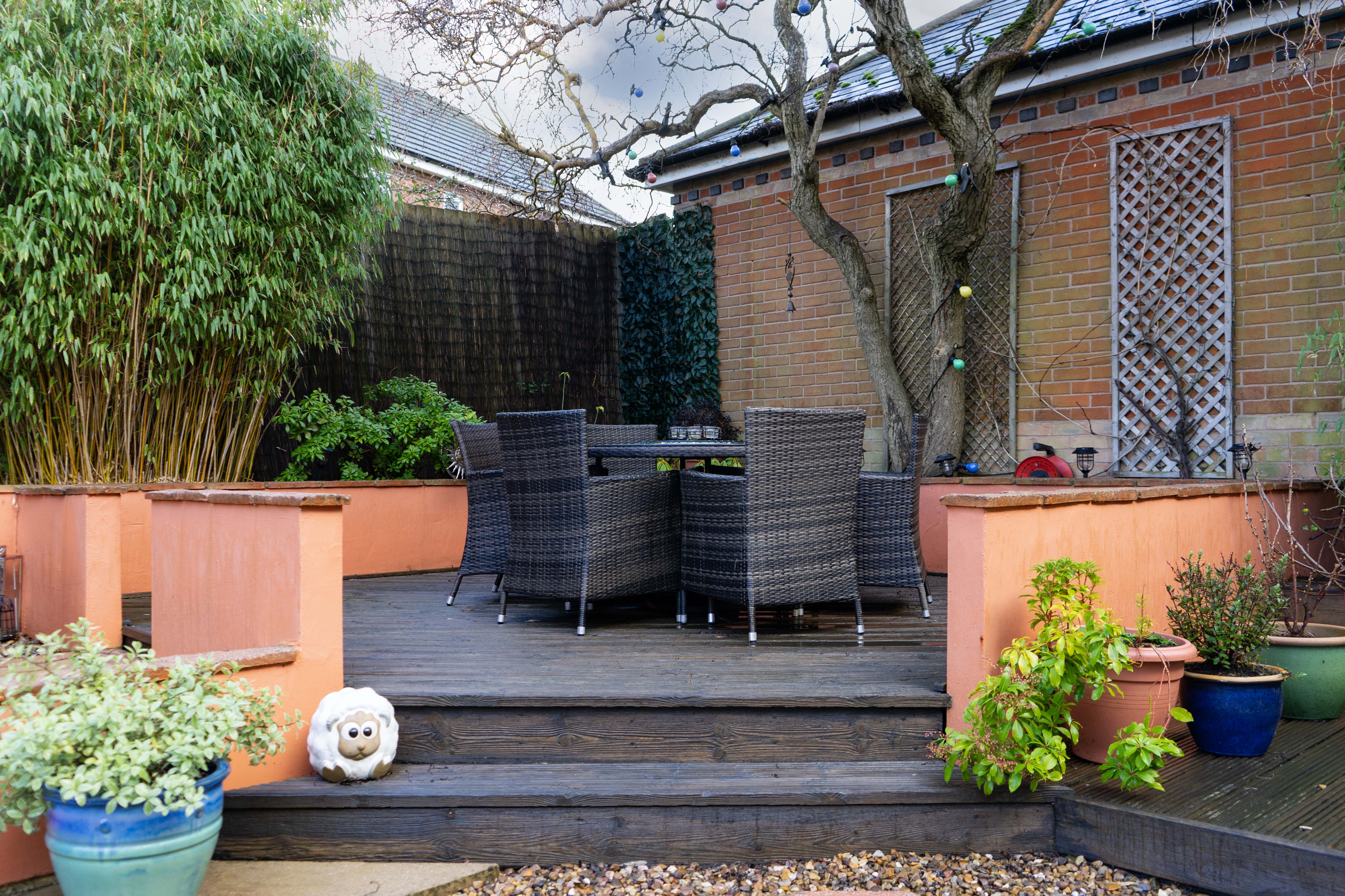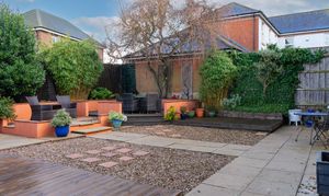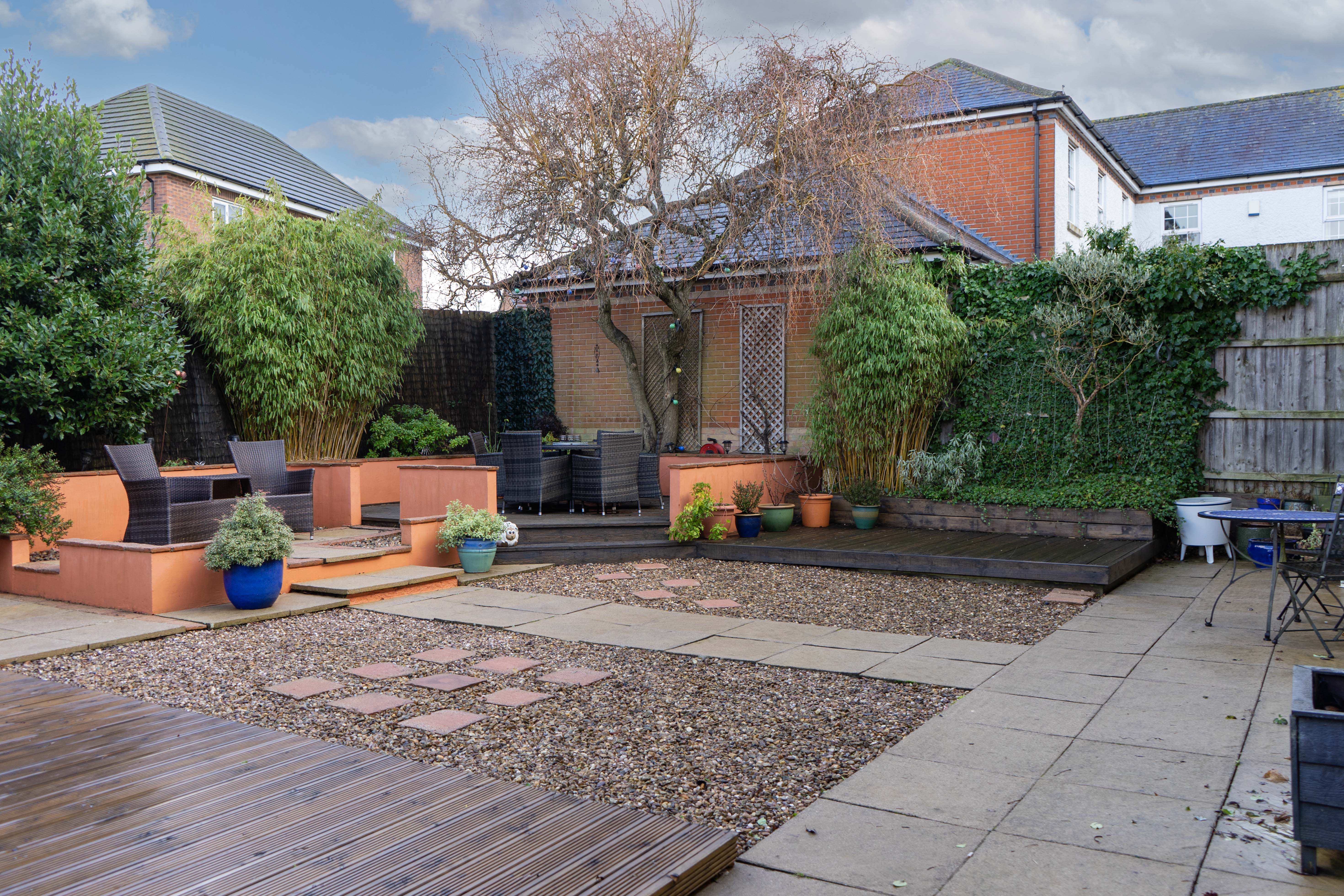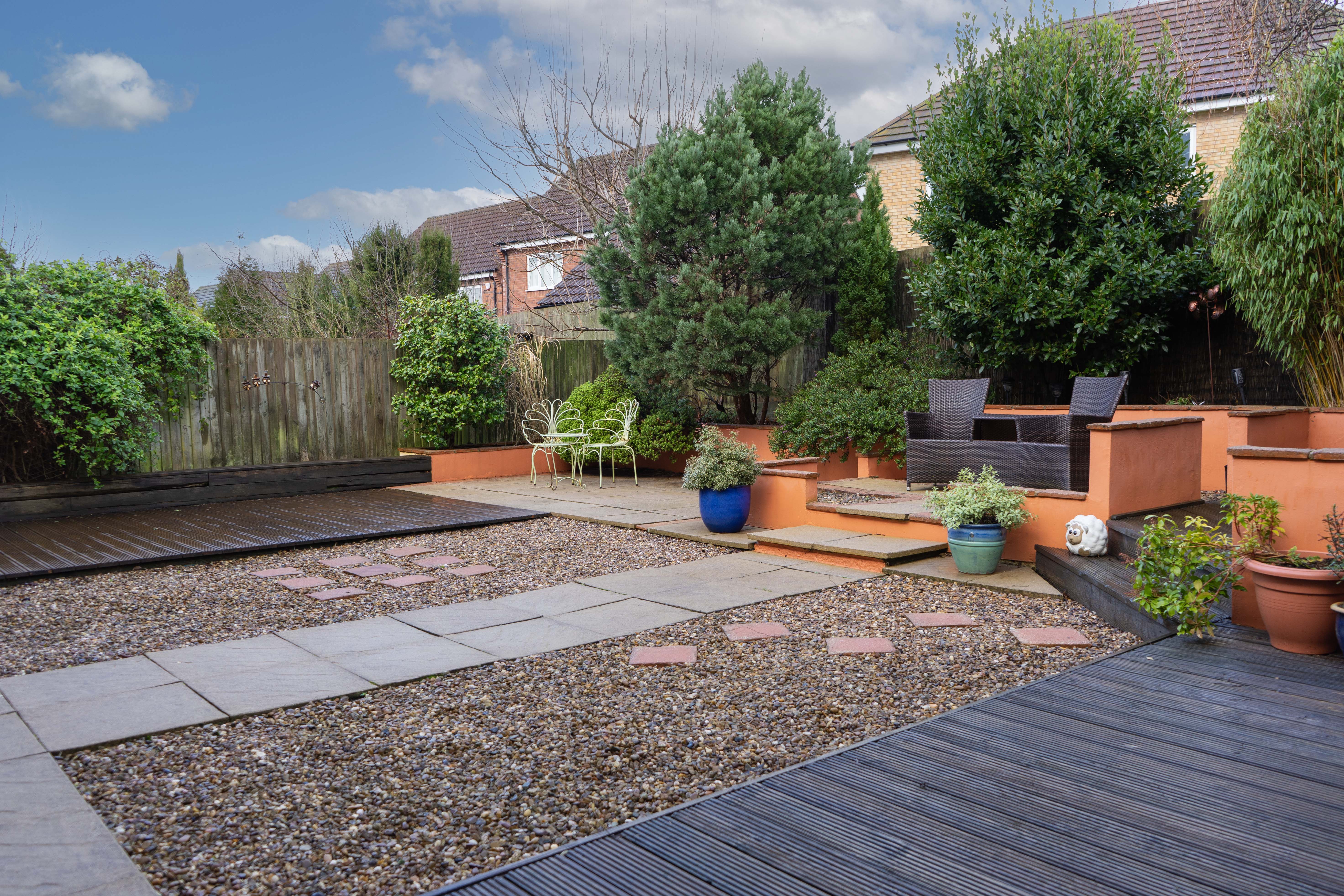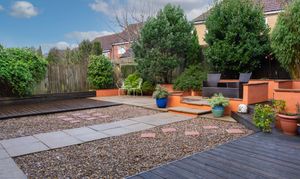 With paved pathway, paved patio seating areas, decking areas, raised paved patio area to the rear, flowerbeds and shrubs, fencing to perimeter.