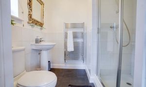Measurement into shower. With double glazed window to the side elevation, part tiled walls, tiled floor, shower cubicle, low-level WC, wash hand basin, ladder style towel rail/radiator.