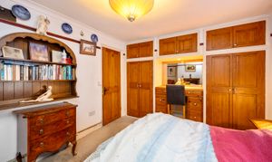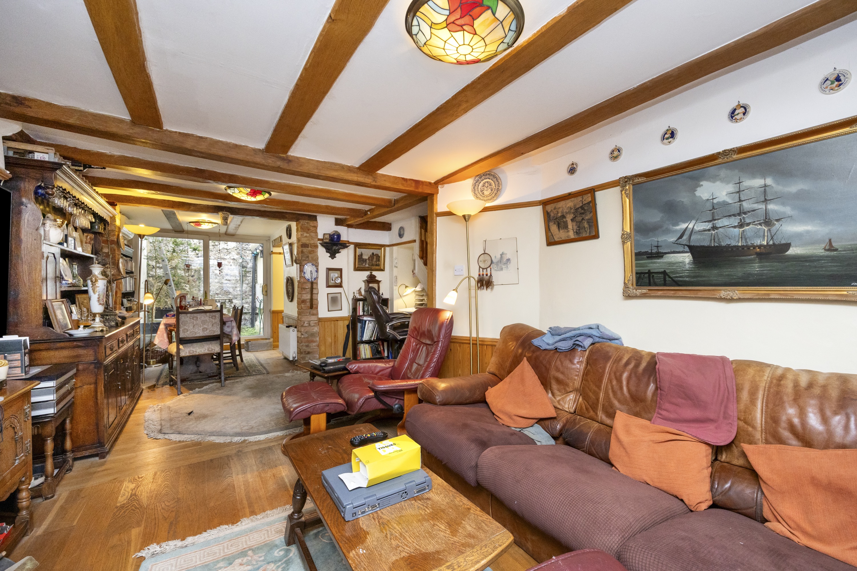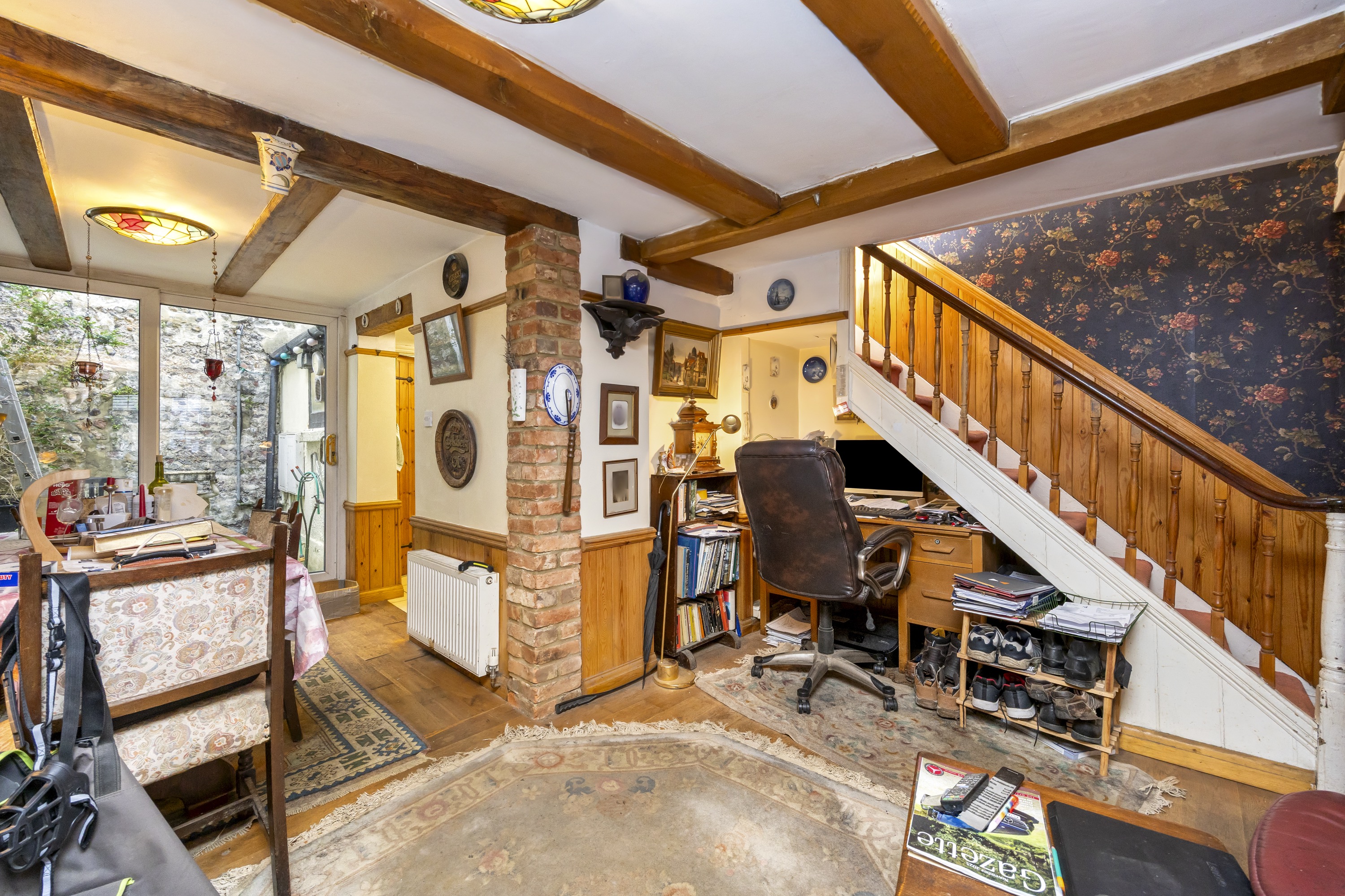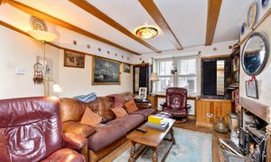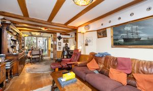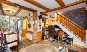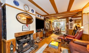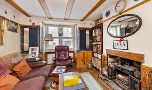 Upon entry, residents are greeted in by the hallway with ample space for shoes and coats. Heading through, the home then expands into the open plan living room / dining area with dual-aspect views via the box bay-window to the front and sliding patio doors to the rear whilst characterful features such as the cast iron wood-burner and timber ceiling beams standout.