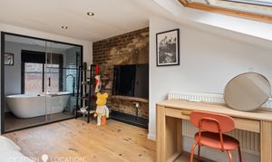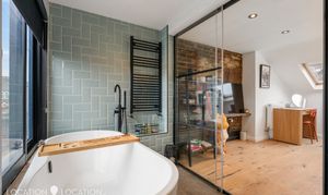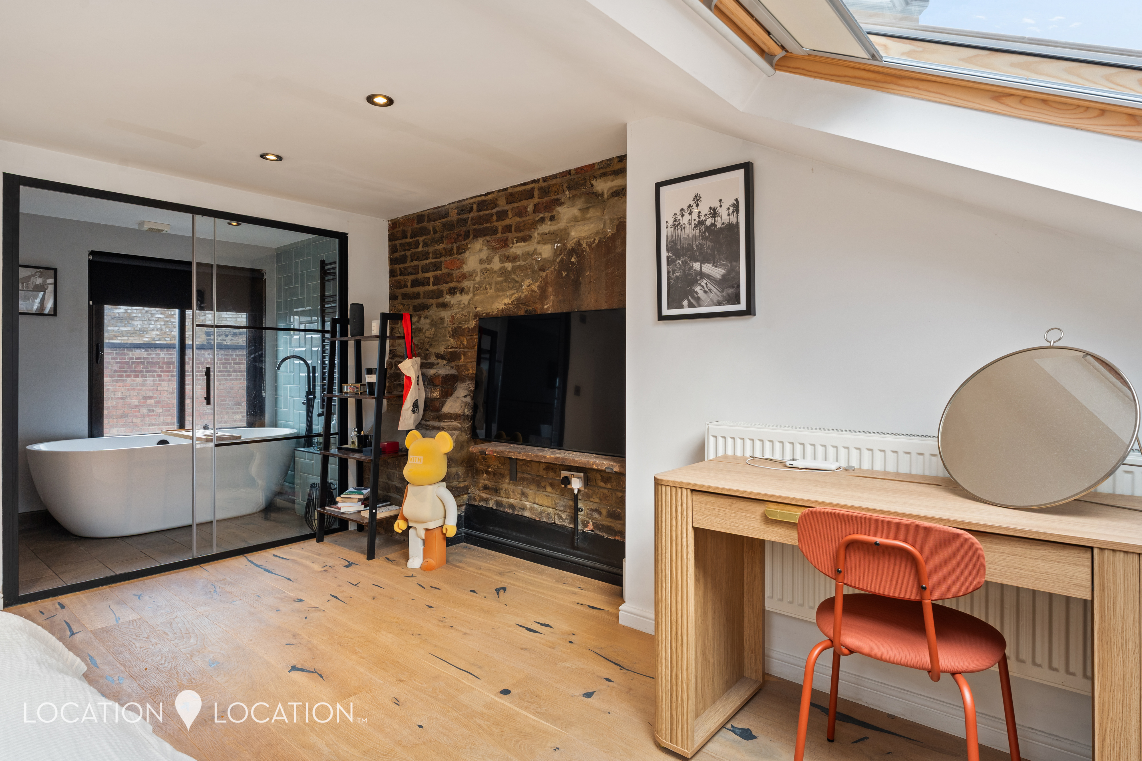 - Loft room with exposed brick & freestanding tub