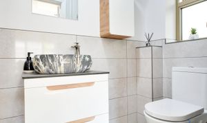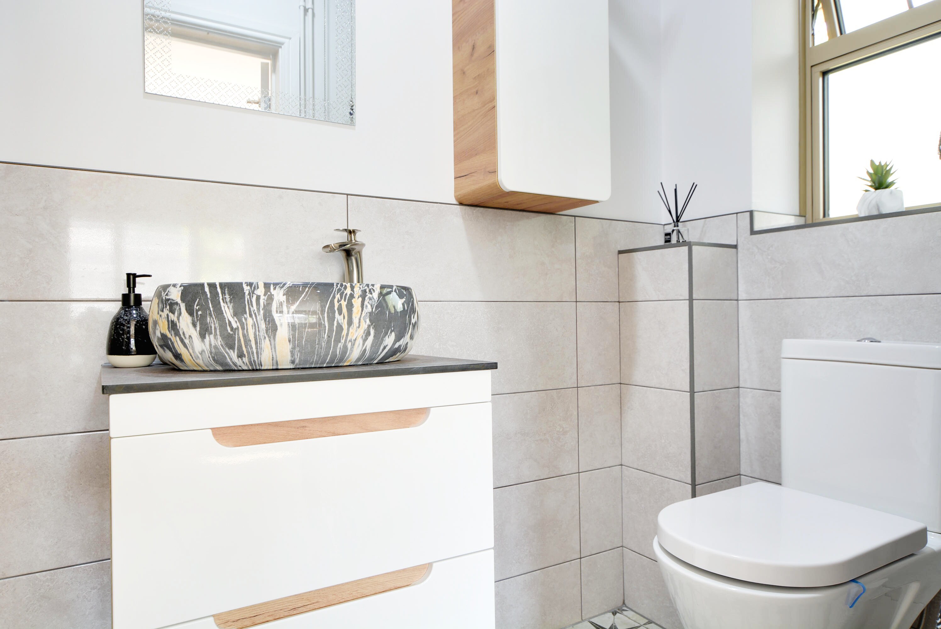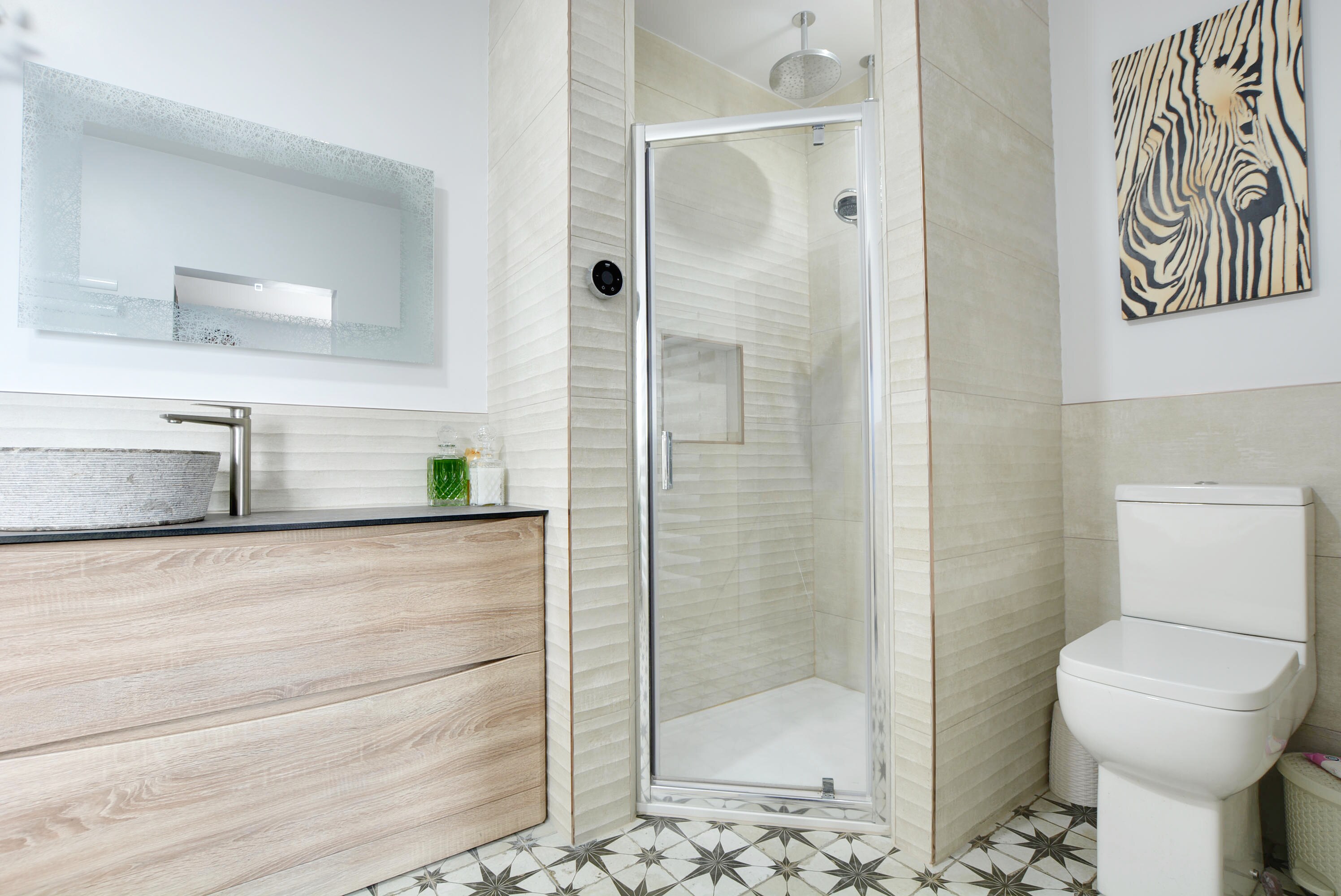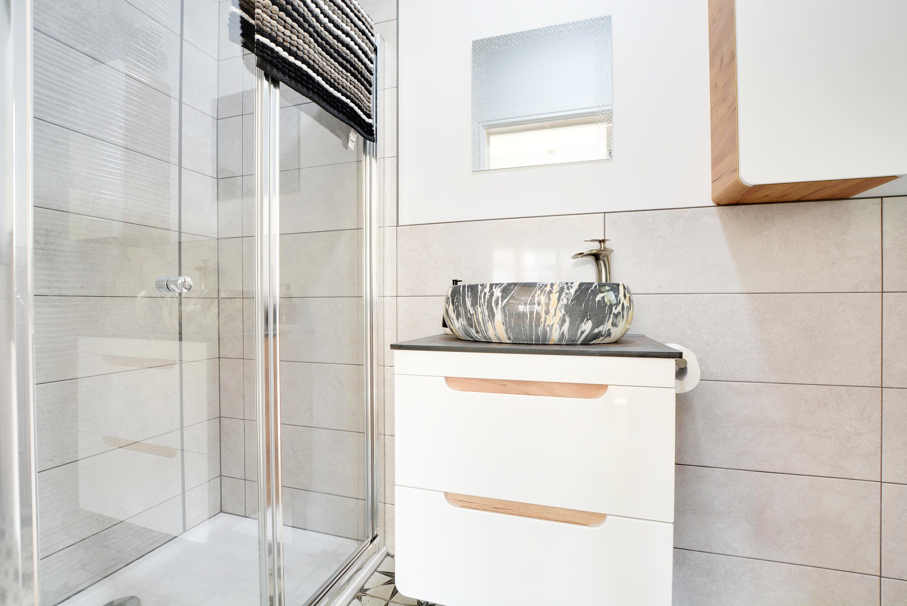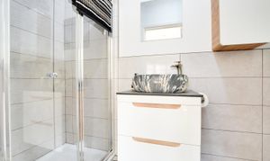 With double glazed window to the side elevation, ceramic tiled floor, shower cubicle, low-level WC, feature wash hand basin with storage below, part tiled walls, ladder style towel rail/radiator.