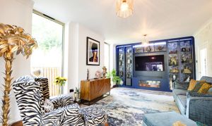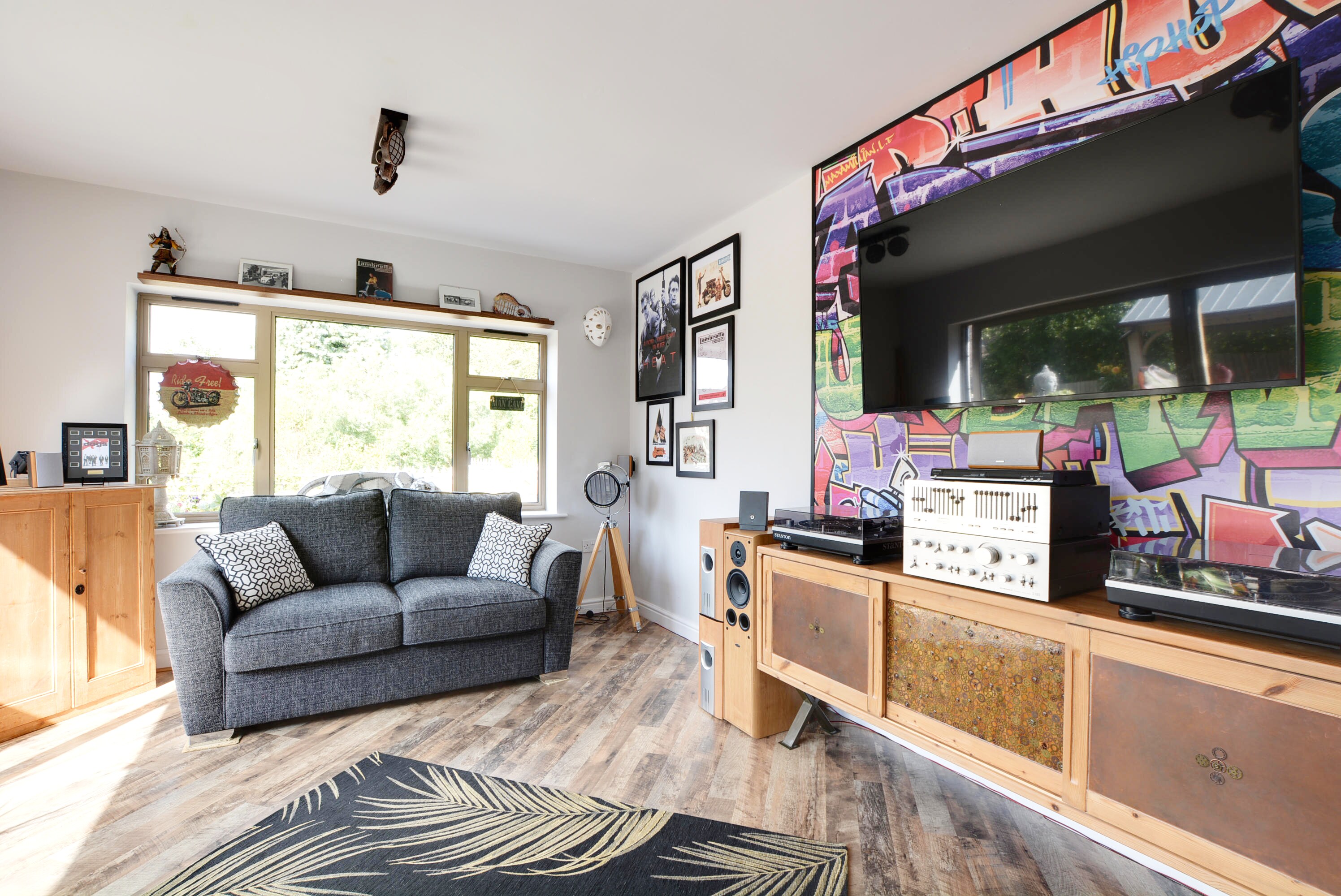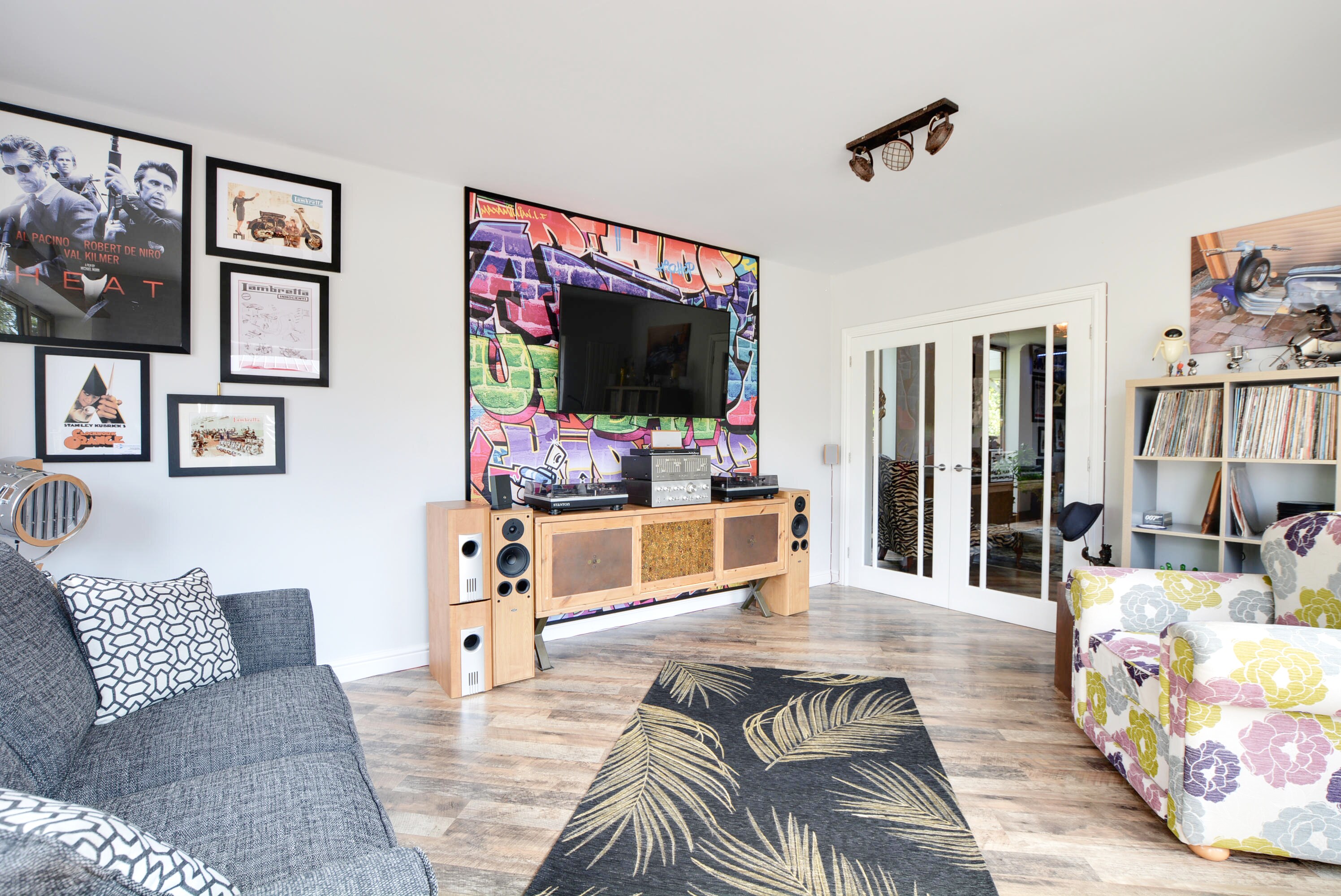 A spacious reception room with double glazed windows to the side elevation, wood effect floor, built-in shelving/media unit, column radiator, double doors providing access leading to bedroom three (currently used as a reception room).