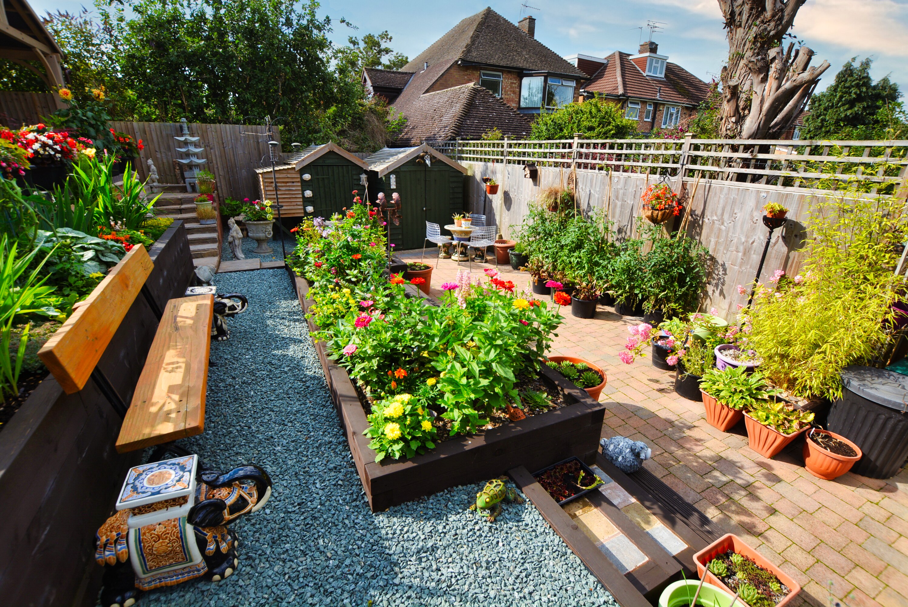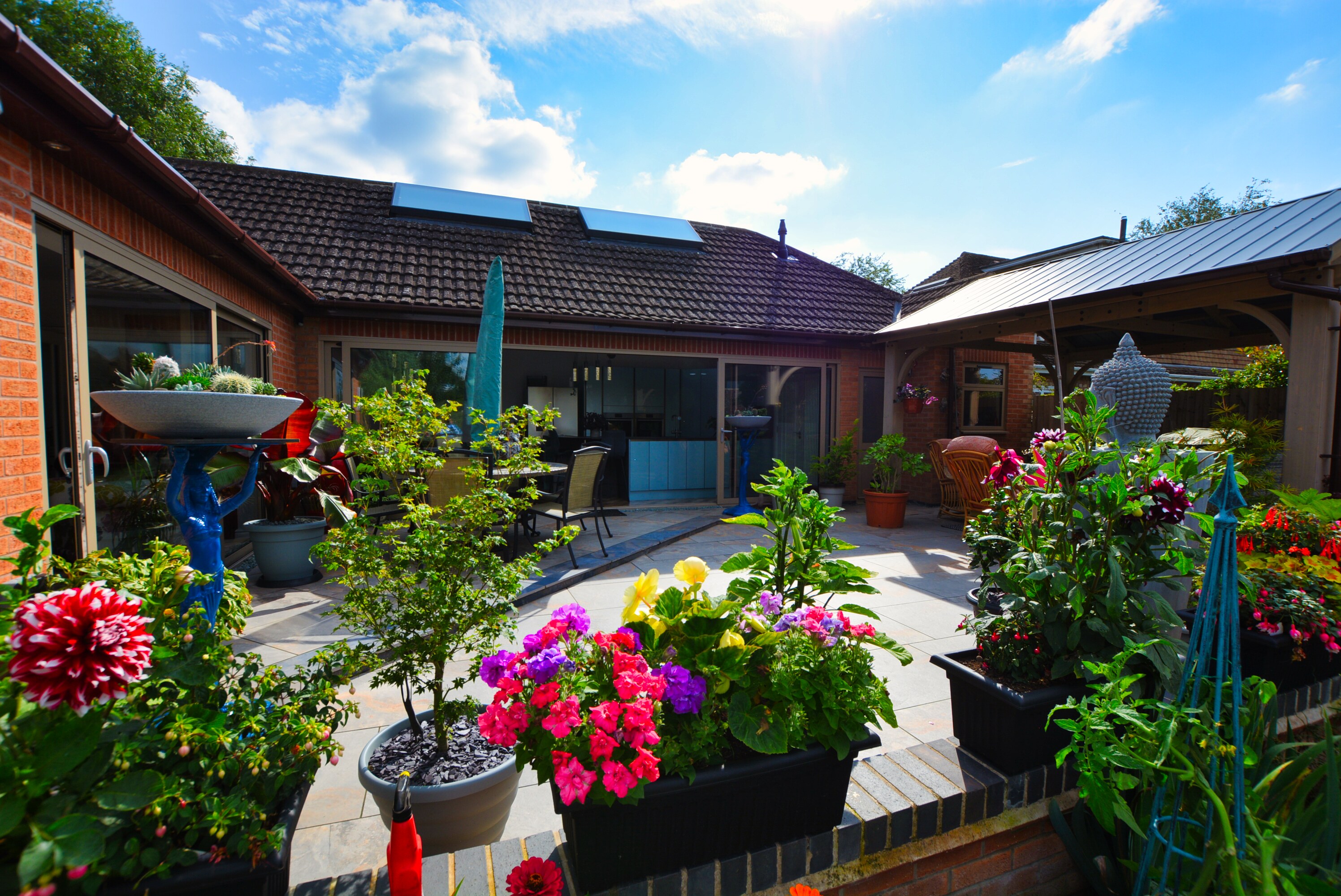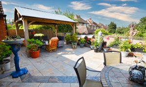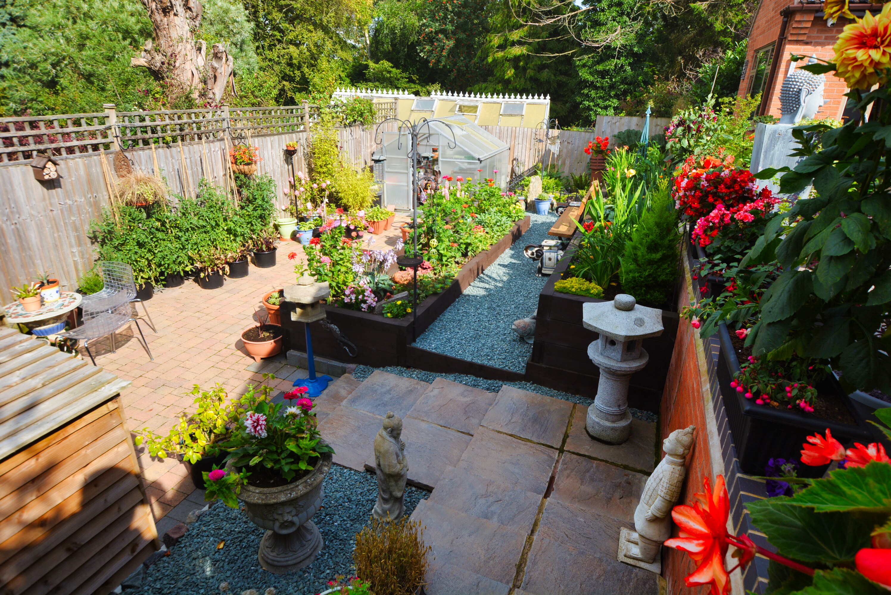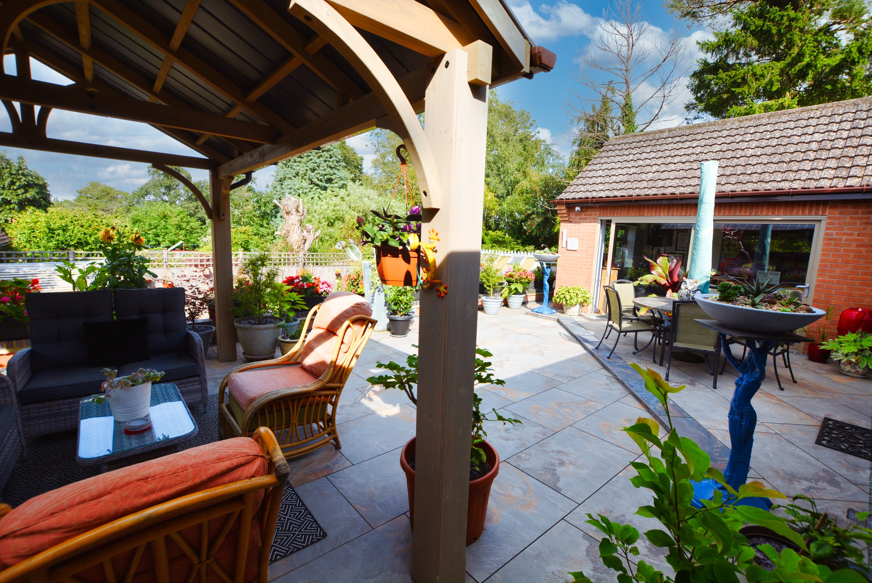 A beautiful landscaped rear garden with large paved patio seating area, further paved area, gravelled area, raised planters with flowerbeds and shrubs, garden sheds.
