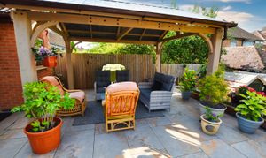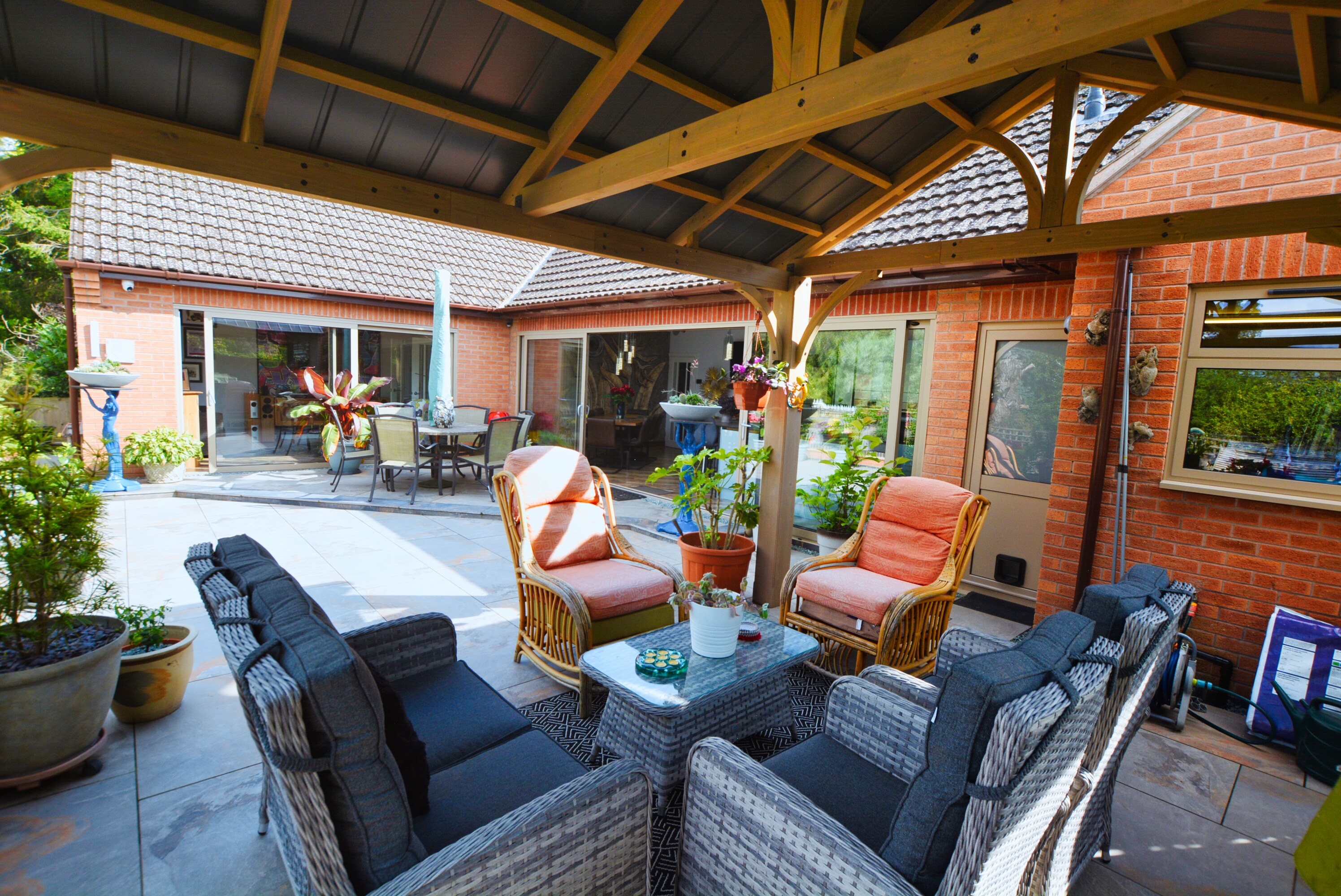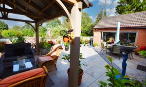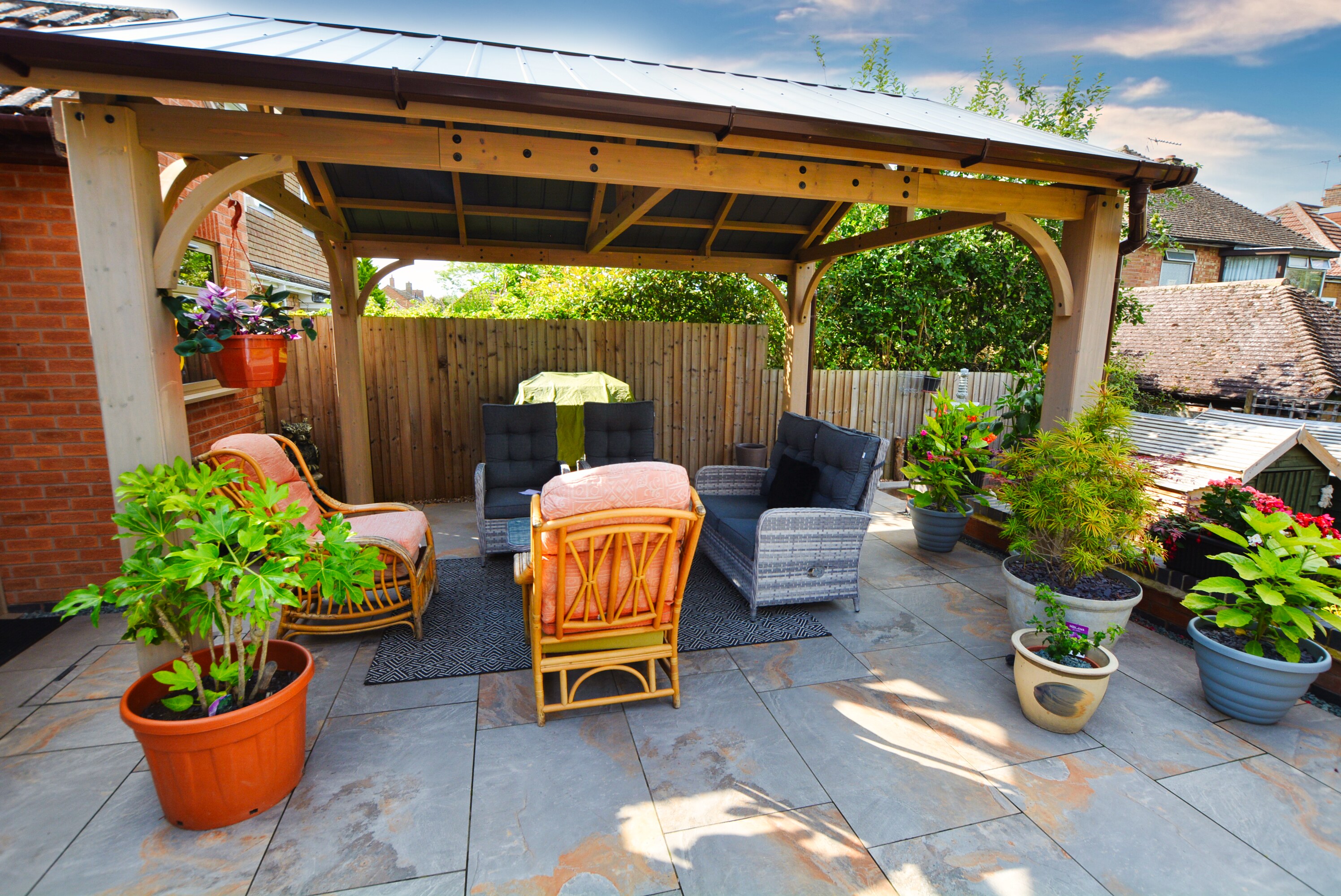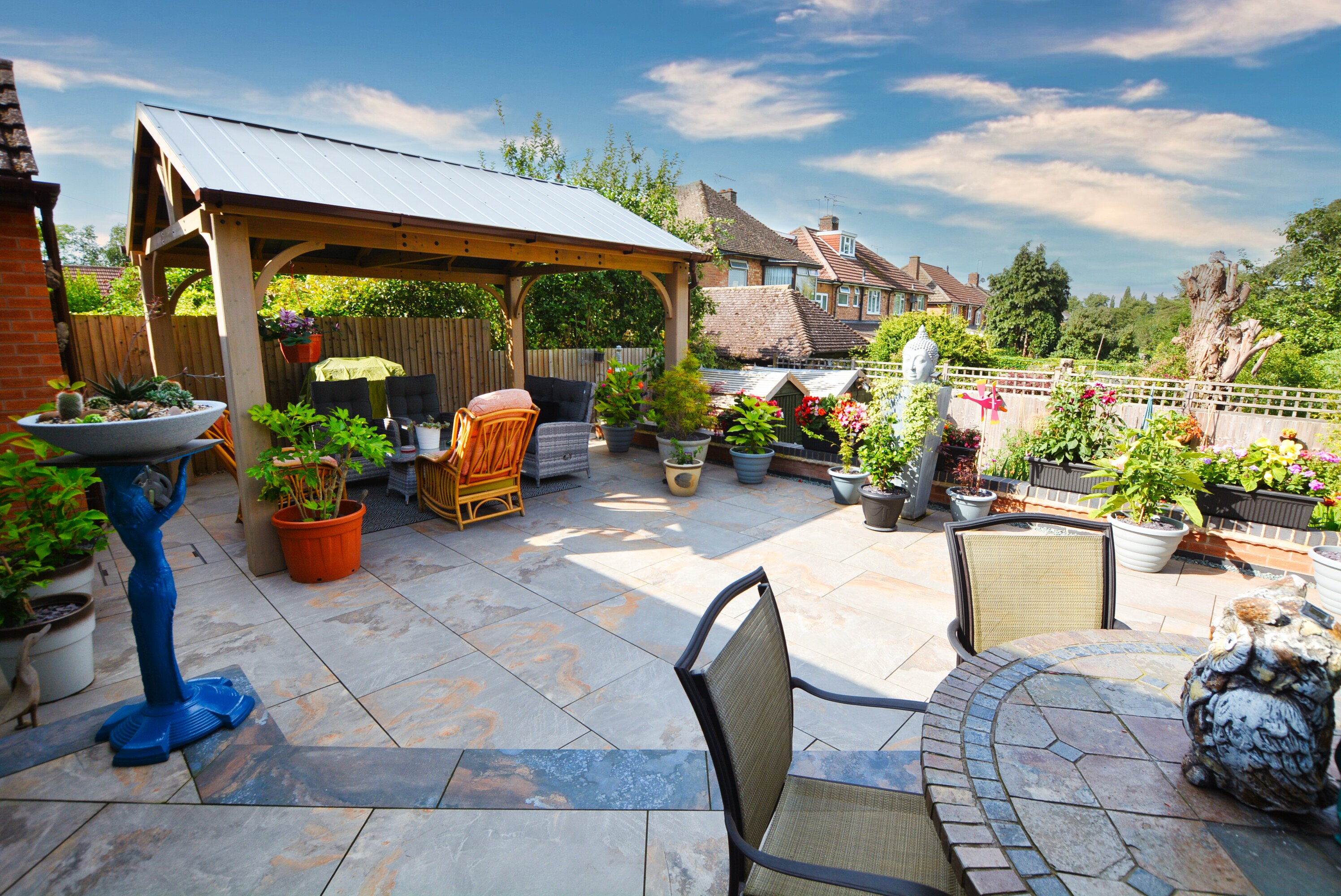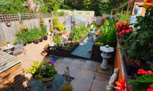 A beautiful landscaped rear garden with large paved patio seating area, further paved area, gravelled area, raised planters with flowerbeds and shrubs, garden sheds.