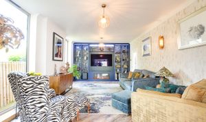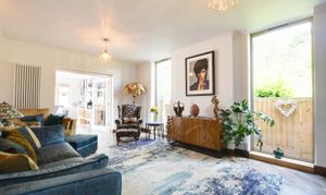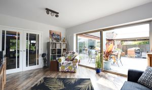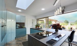A spacious and superb, stylishly appointed fitted dining kitchen with double glazed sliding floor providing access to rear garden, wood effect floor, skylight windows, wall and base units with work surfaces over, sink and drainer, inset ceramic induction hob, downdraft extractor fan, integrated double ovens, integrated dishwasher, space for a large fridge freezer, TV point, door to rear garden, door to garage.