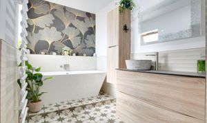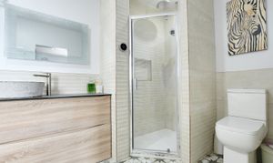 A stylishly appointed and spacious en-suite with double glazed window to the front elevation, ceramic tiled floor, freestanding bath with mixer tap, shower cubicle, low-level WC, feature wash hand basin with storage below, additional storage facilities, ladder towel rail/radiator.